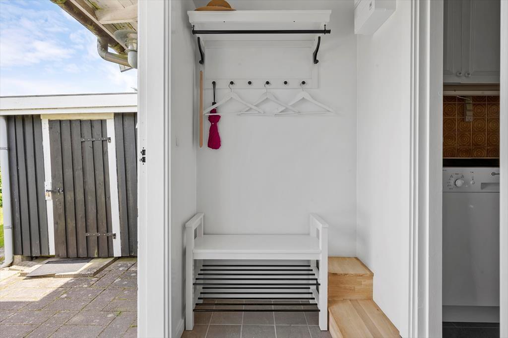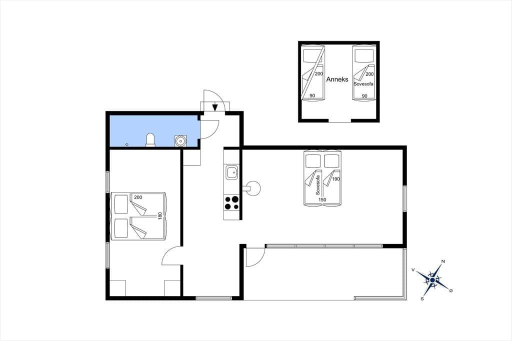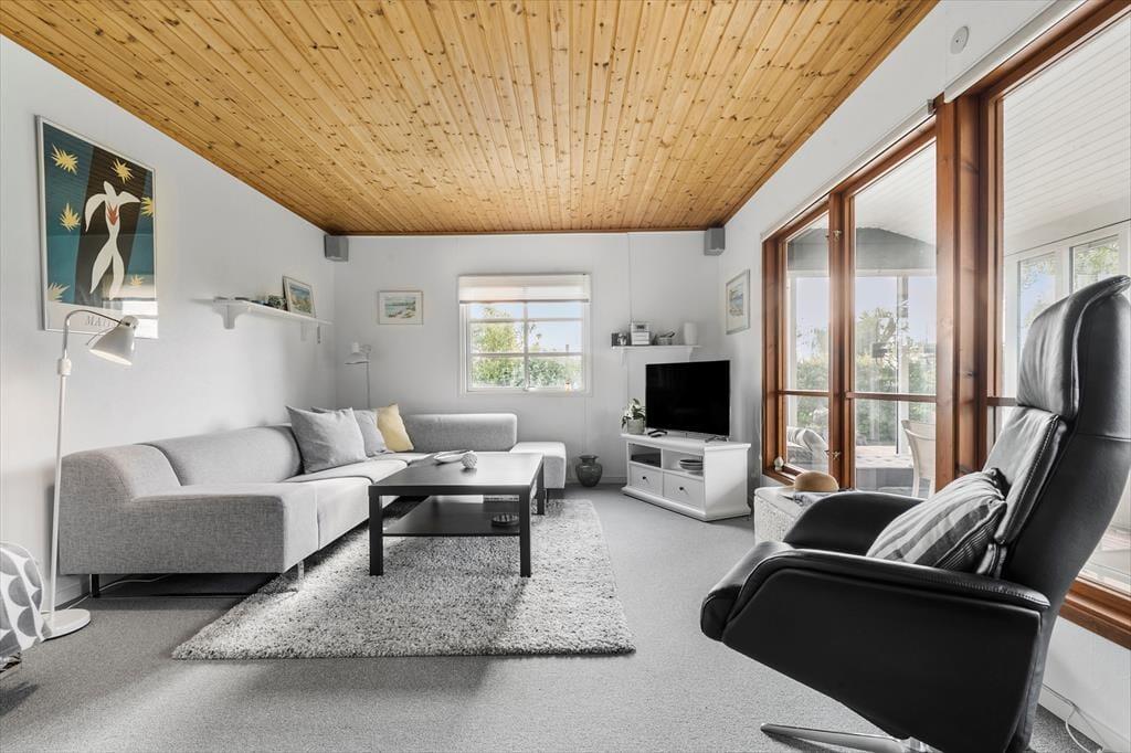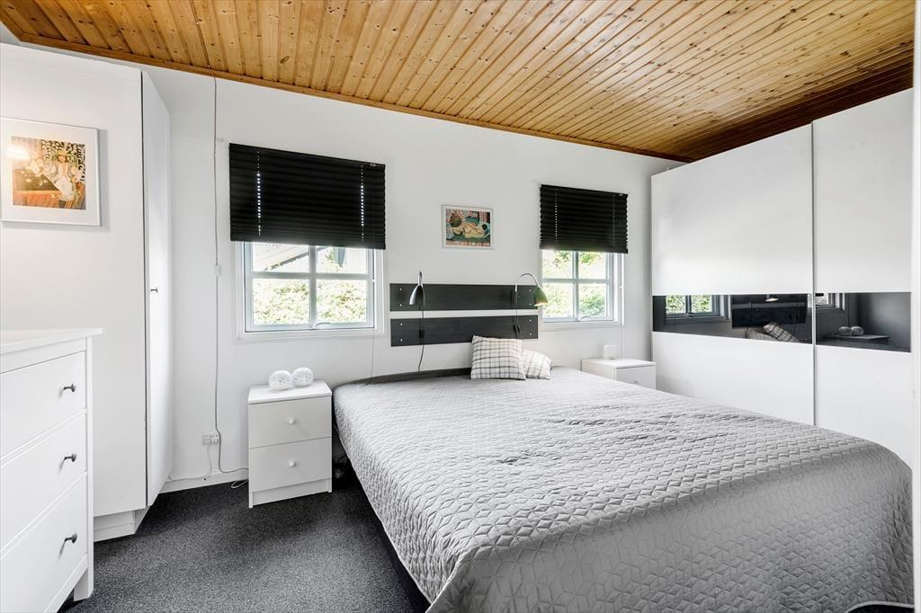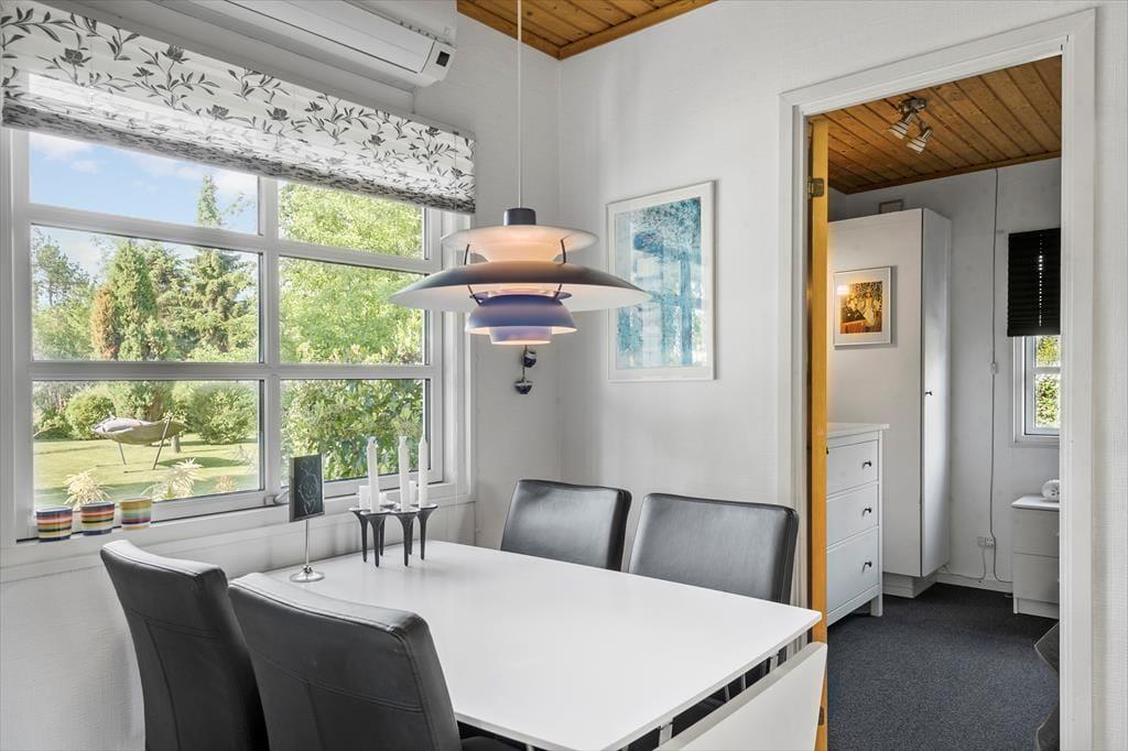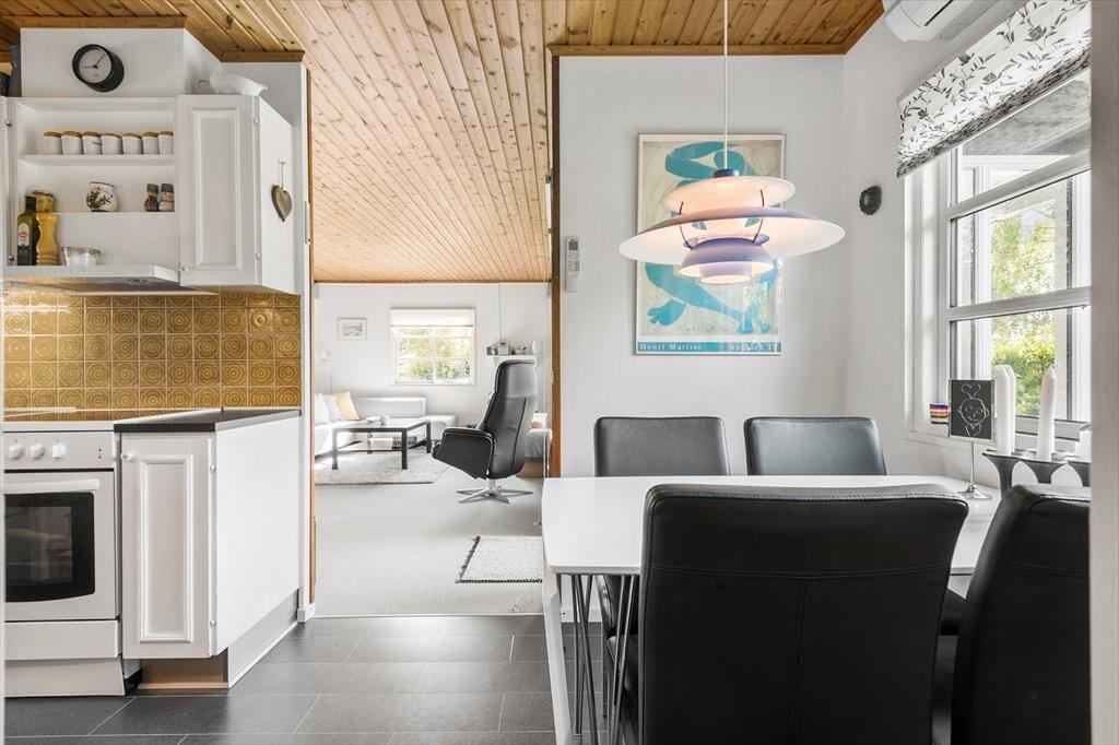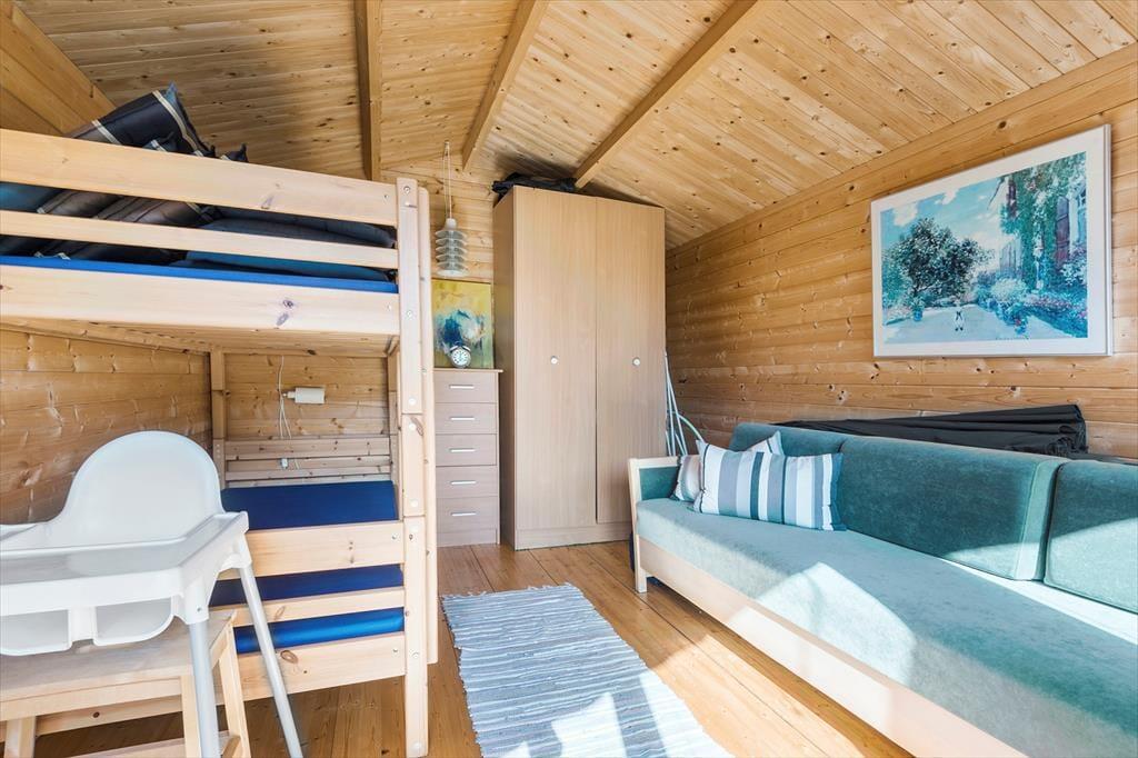 Du træder indenfor i det velholdte og hyggelige sommerhus via entreen og her er et pænt indbydende køkken i åben forbindelse til spiseplads og her kan I være sammen om at tilberede dagens måltider. I stuen kan I hygge om aftenen eller på de kolde dage, med ild i brændeovnen og plads til, at I nyder et glas vin i sofaen, imens ungerne tegner og spiller ved spisebordet. Huset har et dejligt stort soveværelse og et godt anneks med 2 køjesenge og en sovesofa, så ungerne kan selv vælge hvor de vil sove.