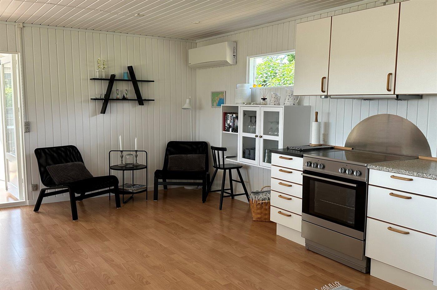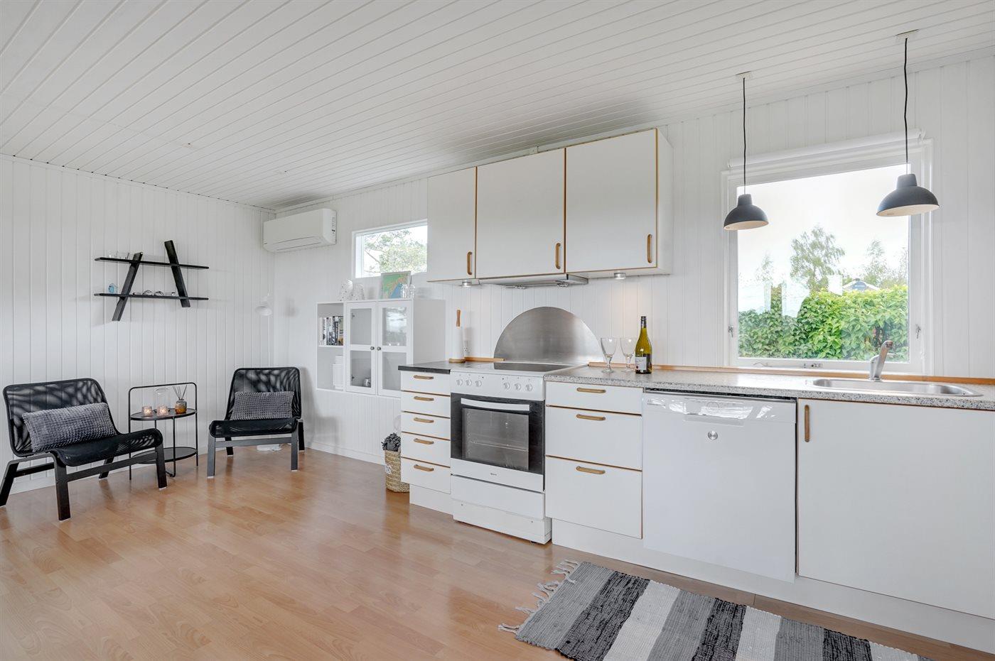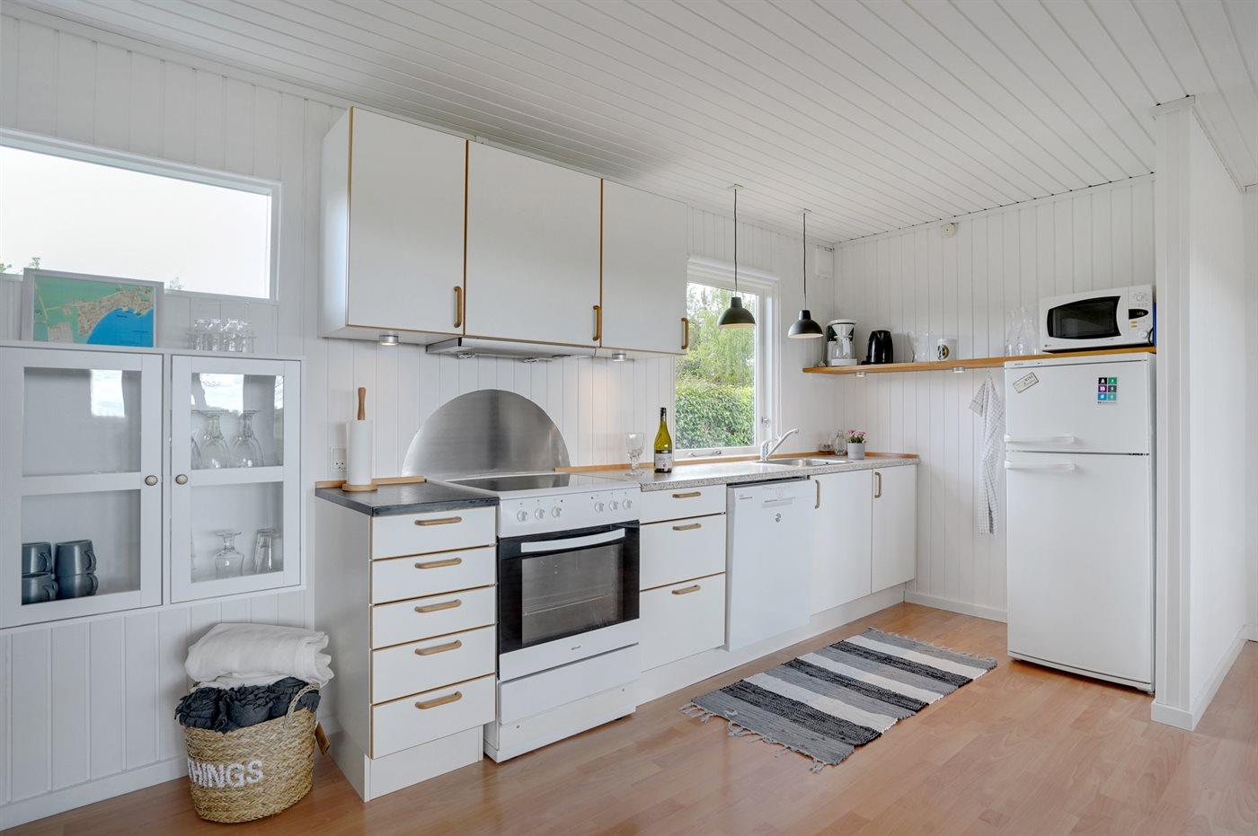 Køkkenet er udstyret med 1 køleskab. Der er 4 keramiske kogeplader, varmluftovn, mikrobølgeovn samt opvaskemaskine.