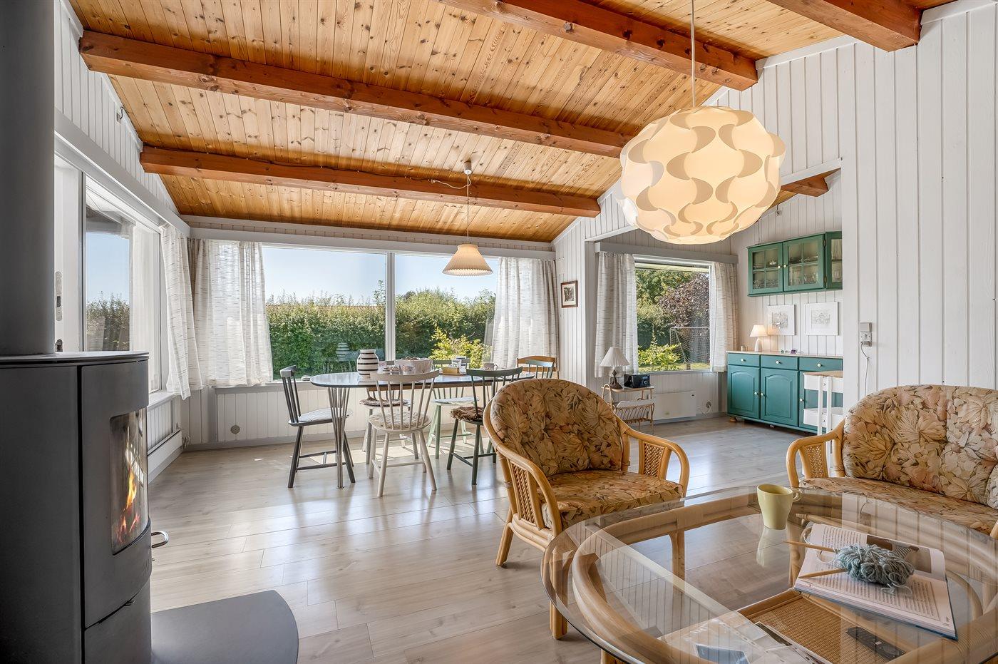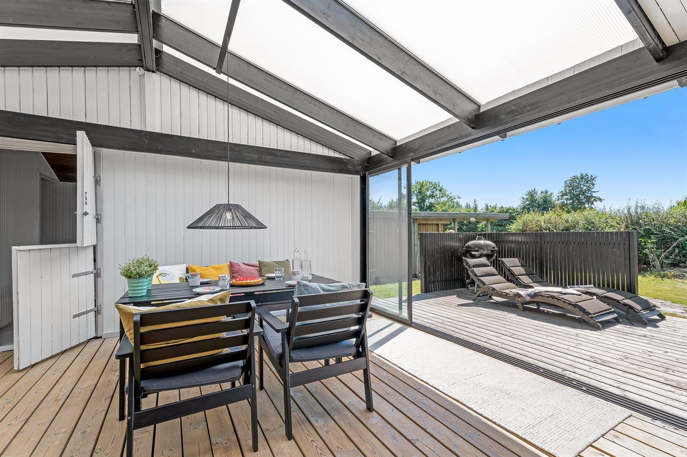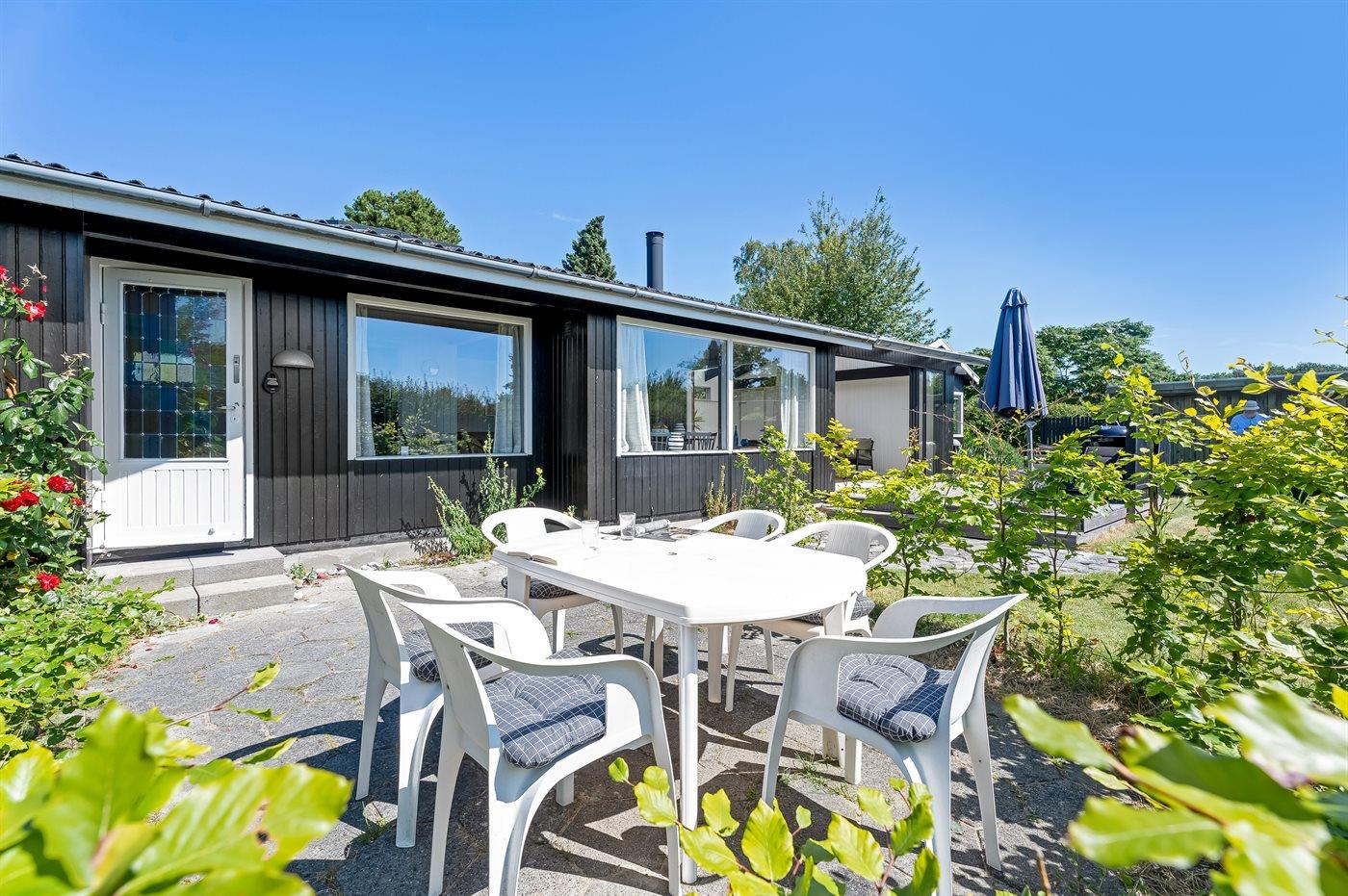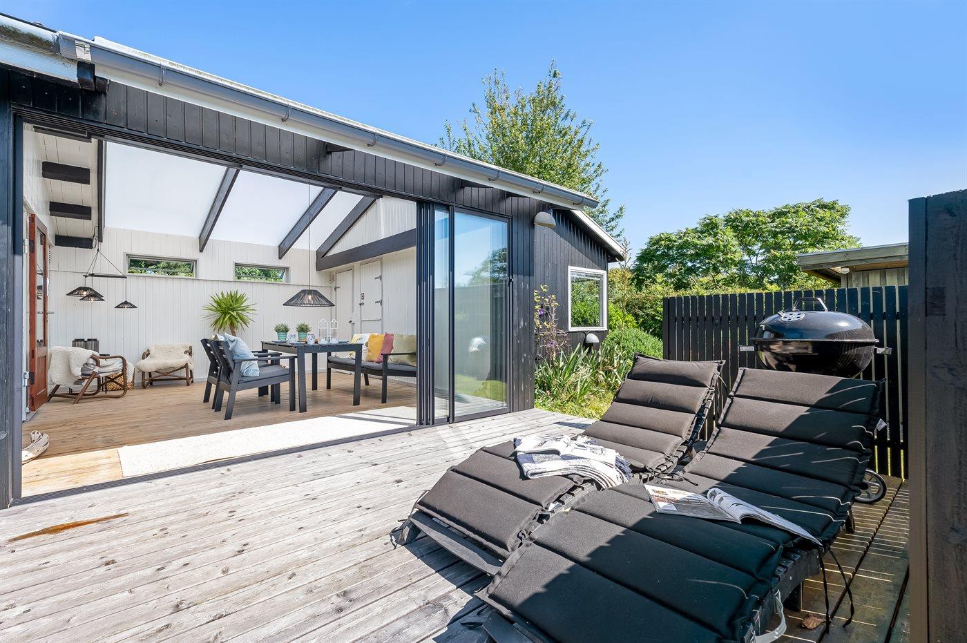 Sommerhuset har en skøn udestue, som man kan sidde i og nyde haven, eller man kan skyde døren helt fra ud til terrassen, hvor der er grill og havemøbler. Til de mindste er der ydermere sandkasse, legehus og fodboldmål. Der er luft/luft varmepumpe i huset og en dejlig brændeovn til hygge på køligere dage.