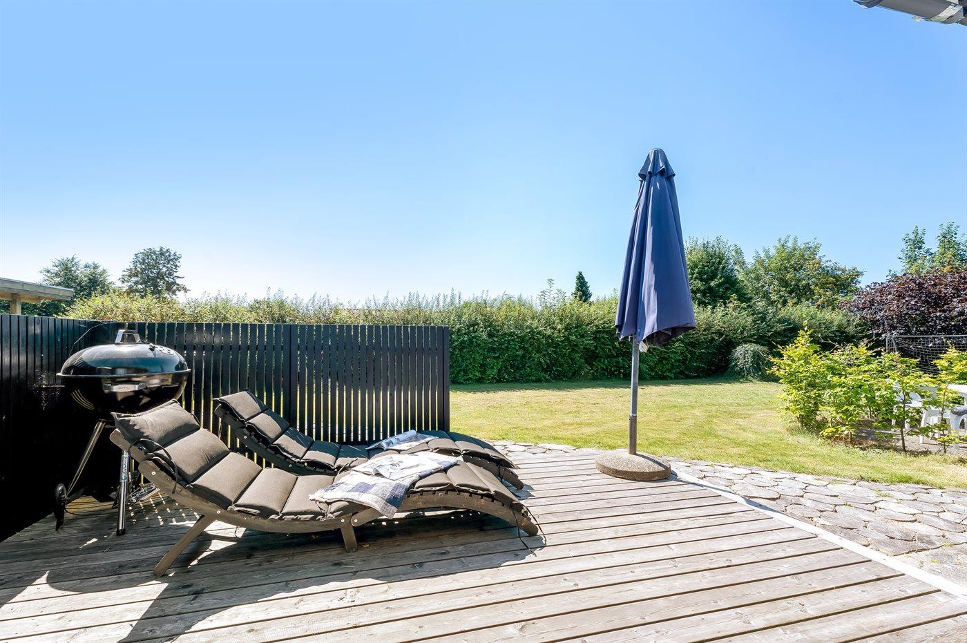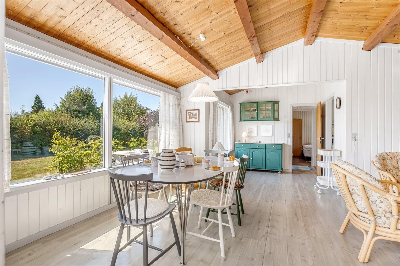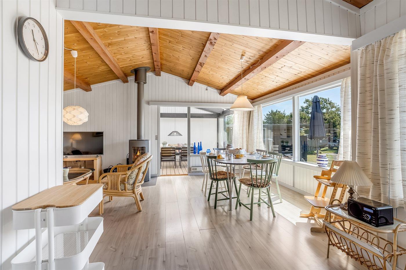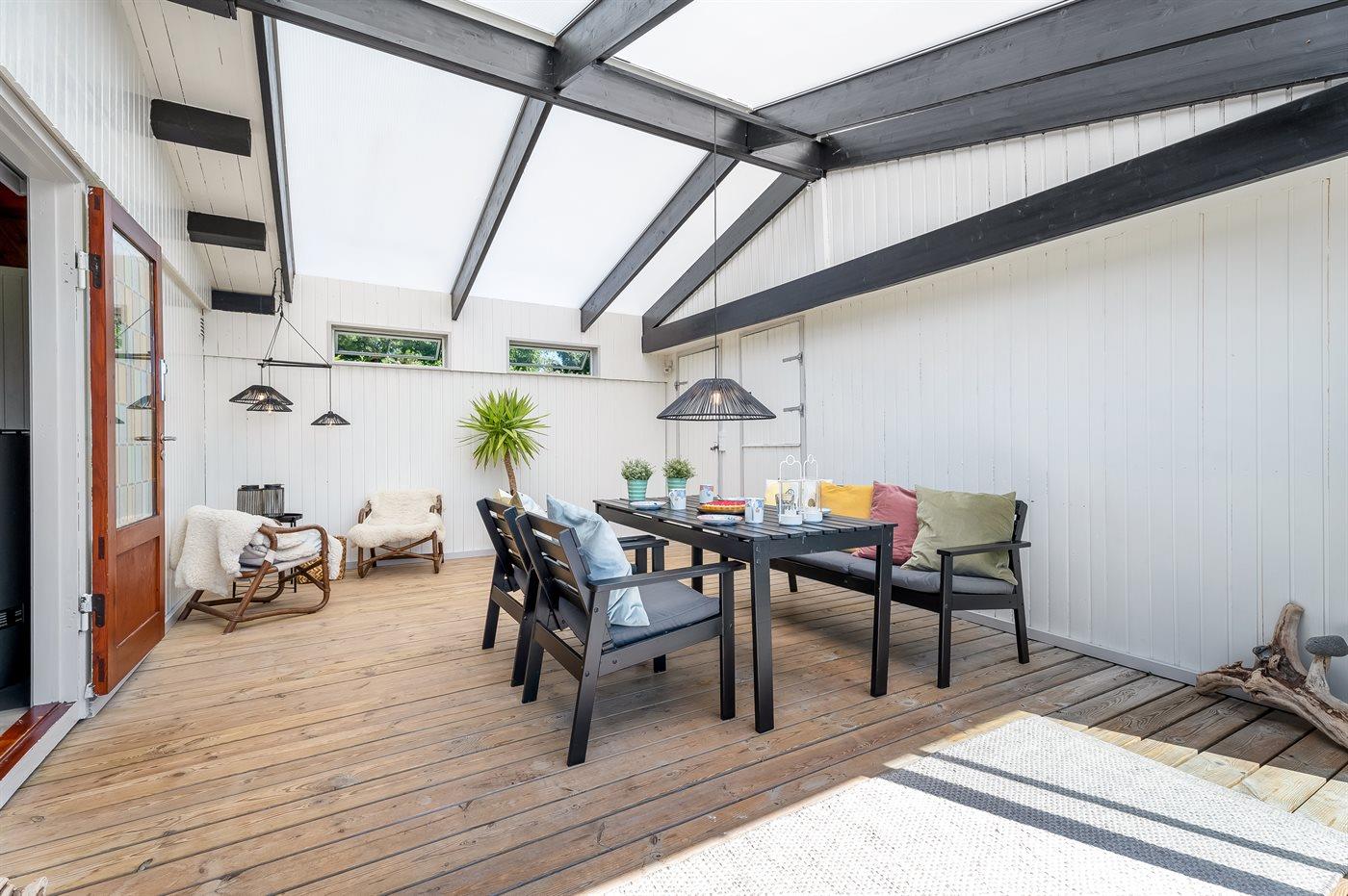 Sommerhuset har en skøn udestue, som man kan sidde i og nyde haven, eller man kan skyde døren helt fra ud til terrassen, hvor der er grill og havemøbler. Til de mindste er der ydermere sandkasse, legehus og fodboldmål. Der er luft/luft varmepumpe i huset og en dejlig brændeovn til hygge på køligere dage.