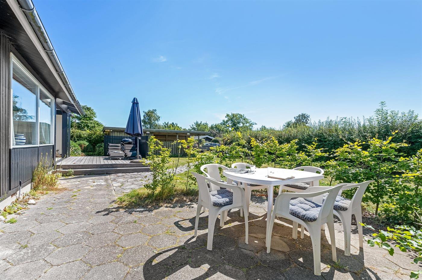 Ferieboligen er beliggende på en 804 m² stor havegrund. Der er 120 m til havet. Nærmeste forretning er beliggende i en afstand af 1200 m. Til ferieboligen hører åbent terrasseareal. Ligeledes er der adgang til udestue. Der er redskabsrum. Sandkasse. Legehus. Fodboldmål. Grill til rådighed. Der er carport til rådighed. Parkering ved ferieboligen.