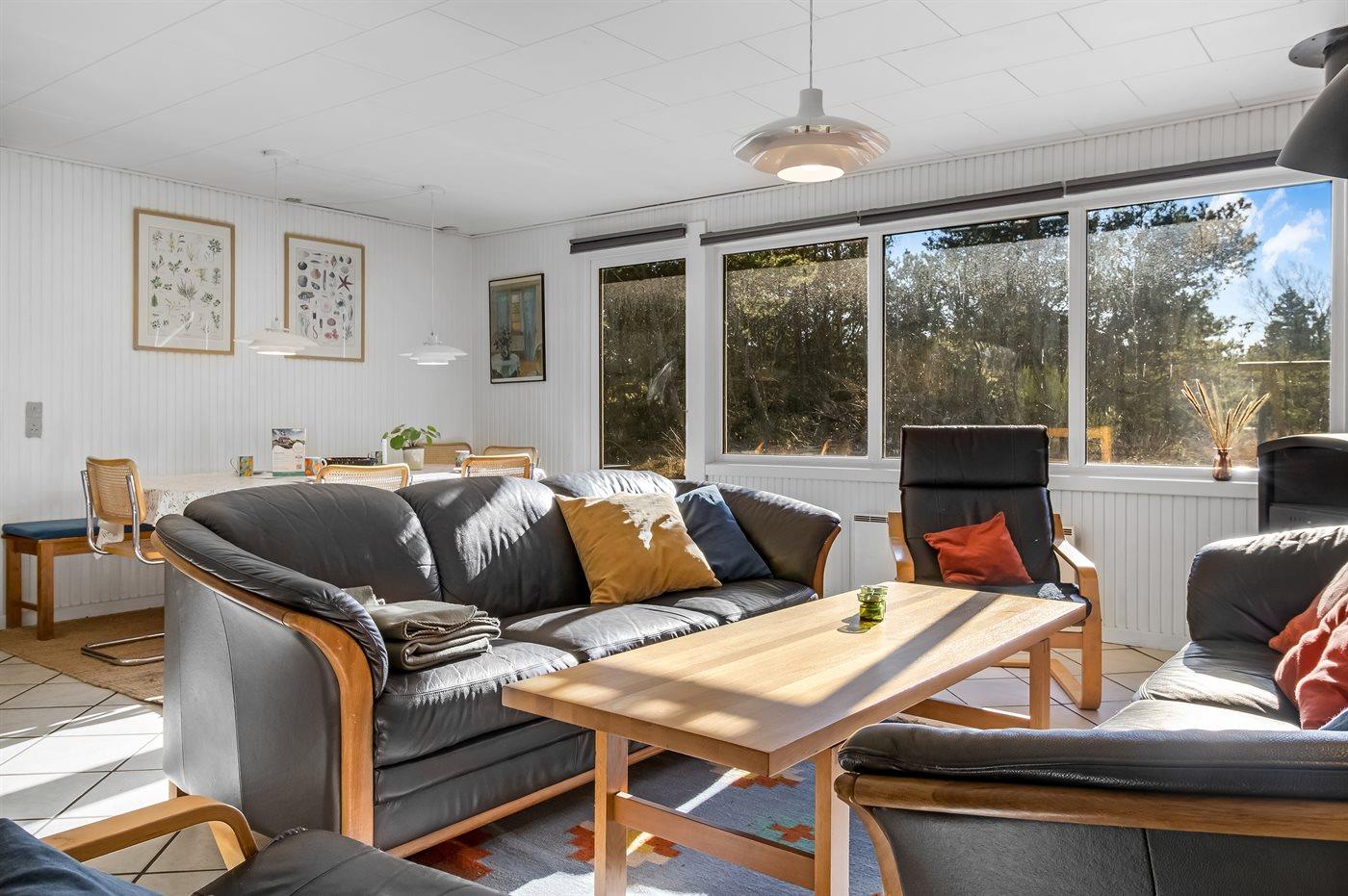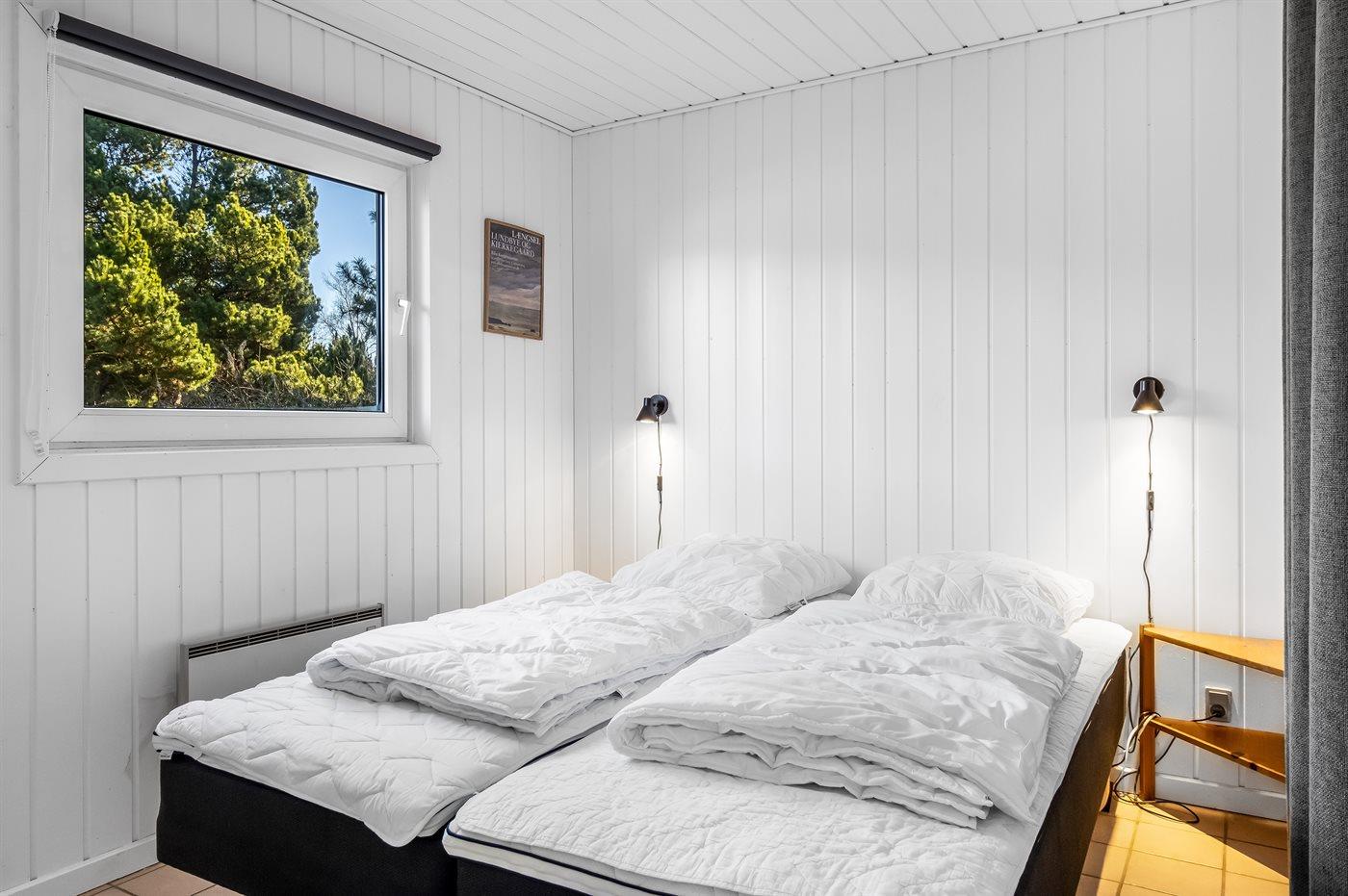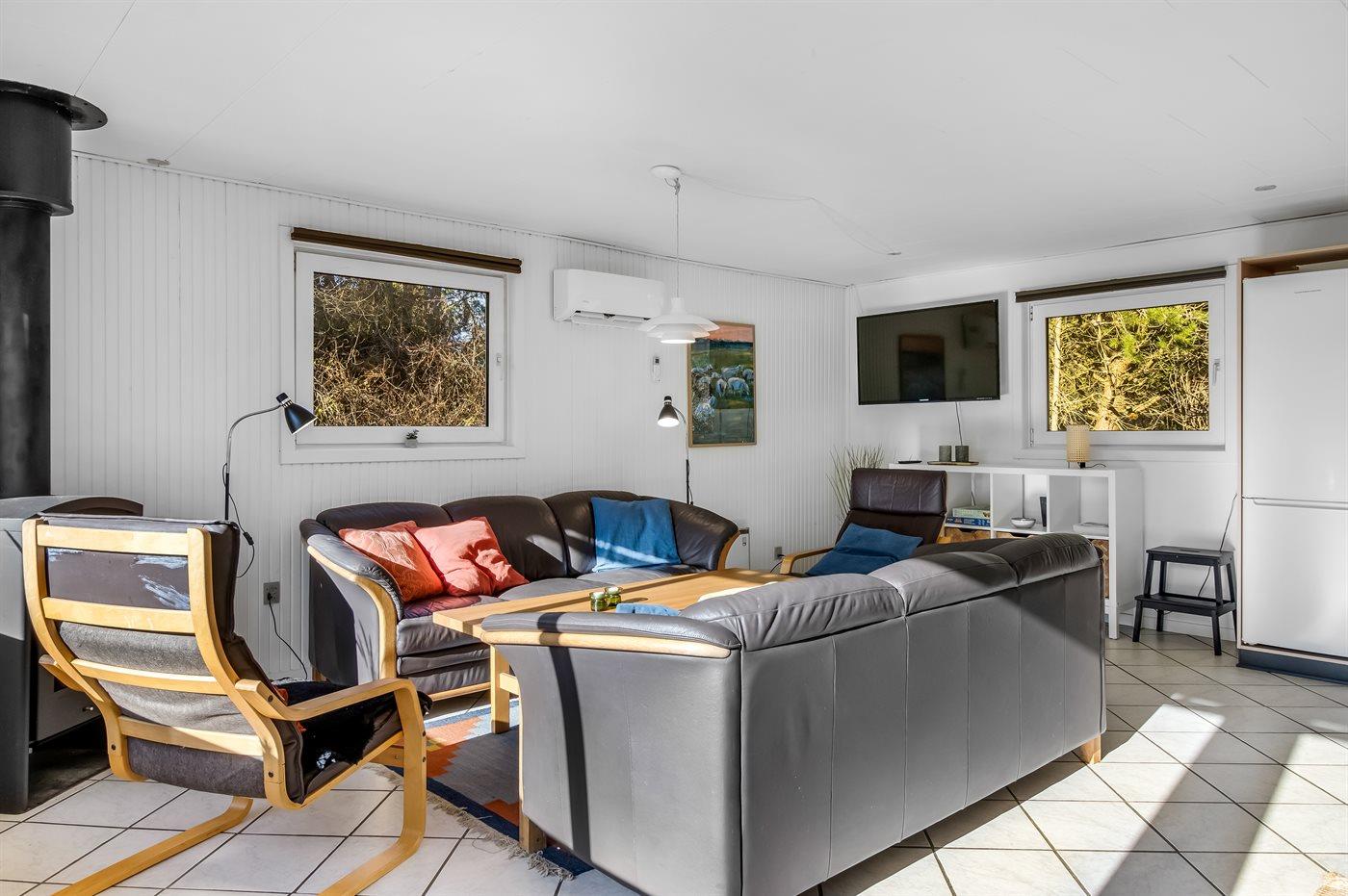 Sommerhus i træ, bygget i 1967 og renoveret i 1997, beliggende på en naturgrund. Til huset hører et stort, åbent terrasseareal med havemøbler. Åbent køkken med bl.a. fryser, komfur med keramiske kogeplader, mikrobølgeovn og opvaskemaskine. Køkkenet ligger i åben forbindelse med opholdsstuen med spiseafdeling, brændeovn, TV med parabol (digital - tyske programmer) og stereoanlæg samt udgang til terrassen. Husets sovepladser fordeler sig på 3 soveværelser med dobbeltseng samt 1 værelse med 2 enkeltsenge. Badeværelse med gulvvarme, bruseniche, 6-pers. spa (standvand) samt direkte adgang til husets sauna. Endnu et badeværelse med bruser. Vaskemaskine og tørretumbler til rådighed. Der er installeret energibesparende varmepumpe i huset. Klinkegulve overalt. Gynge på grunden til de små feriegæster. Sommerhuset er velegnet til 2 familier og ligger i et naturskønt område med gode aktivitetsmuligheder.