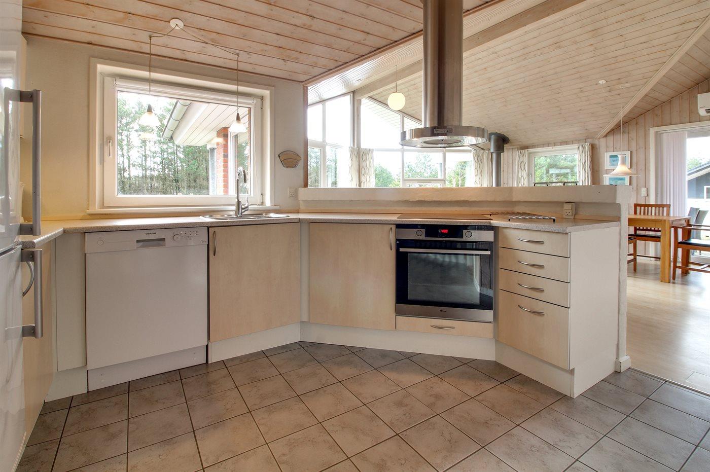 Køkkenet er udstyret med 1 køleskab. Der er 4 elkogeplader, bageovn, mikrobølgeovn samt opvaskemaskine.