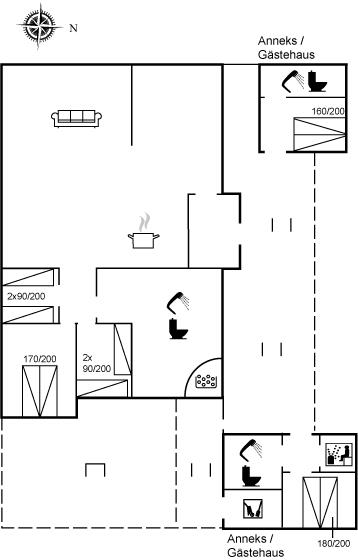 Indvendigt er huset indrettet med kvalitetsmøbler. Dejligt badeværelse med bruseniche, gulvvarme, 2-pers. spa, vaskemaskine og tørretumbler samt puslebord. Ekstra badeværelse og almindelig sauna i det ene anneks samt badeværelse med bruseniche i det andet anneks.