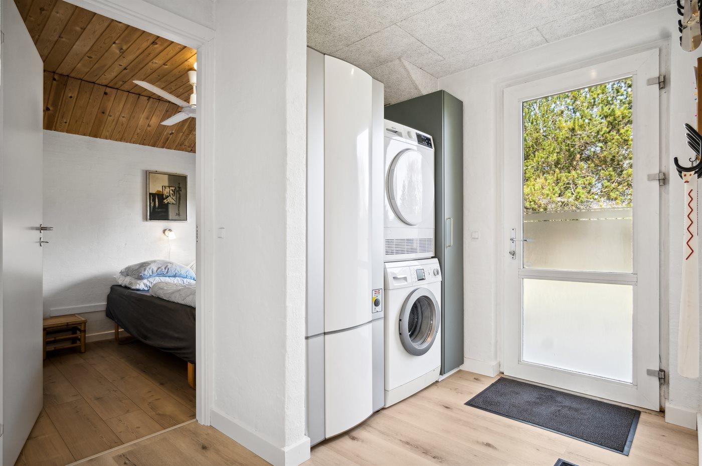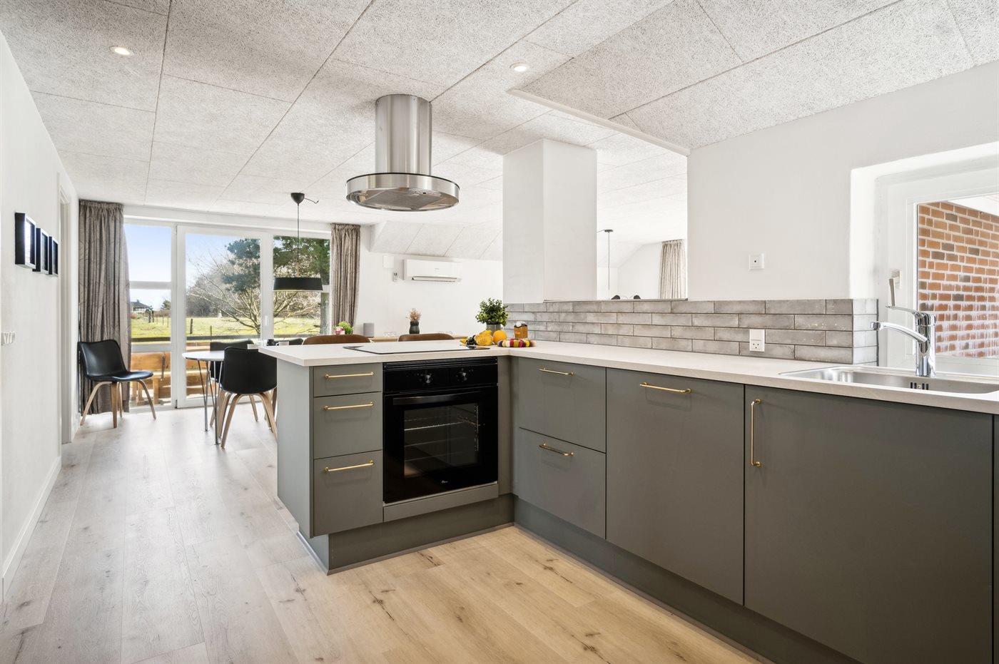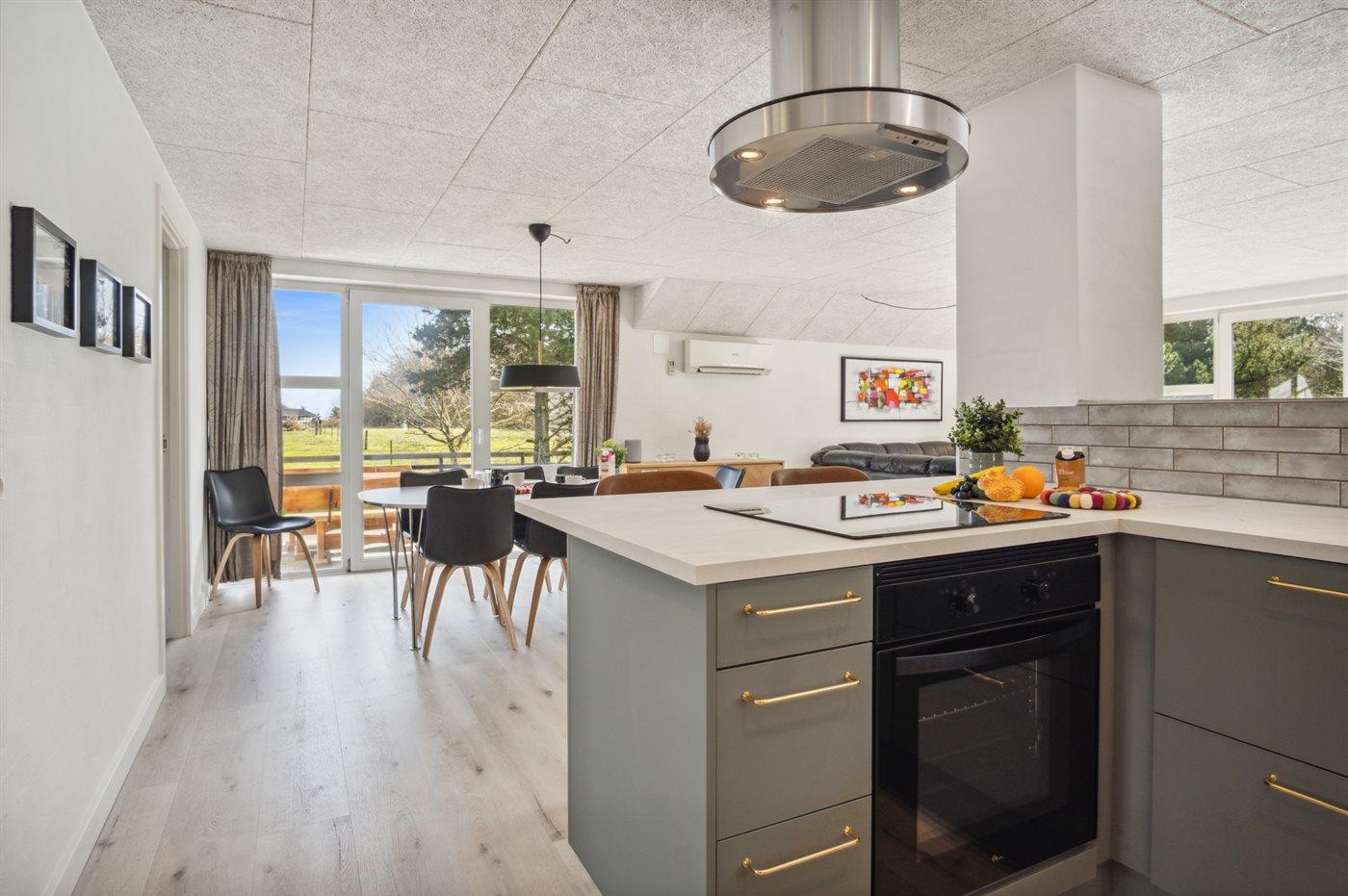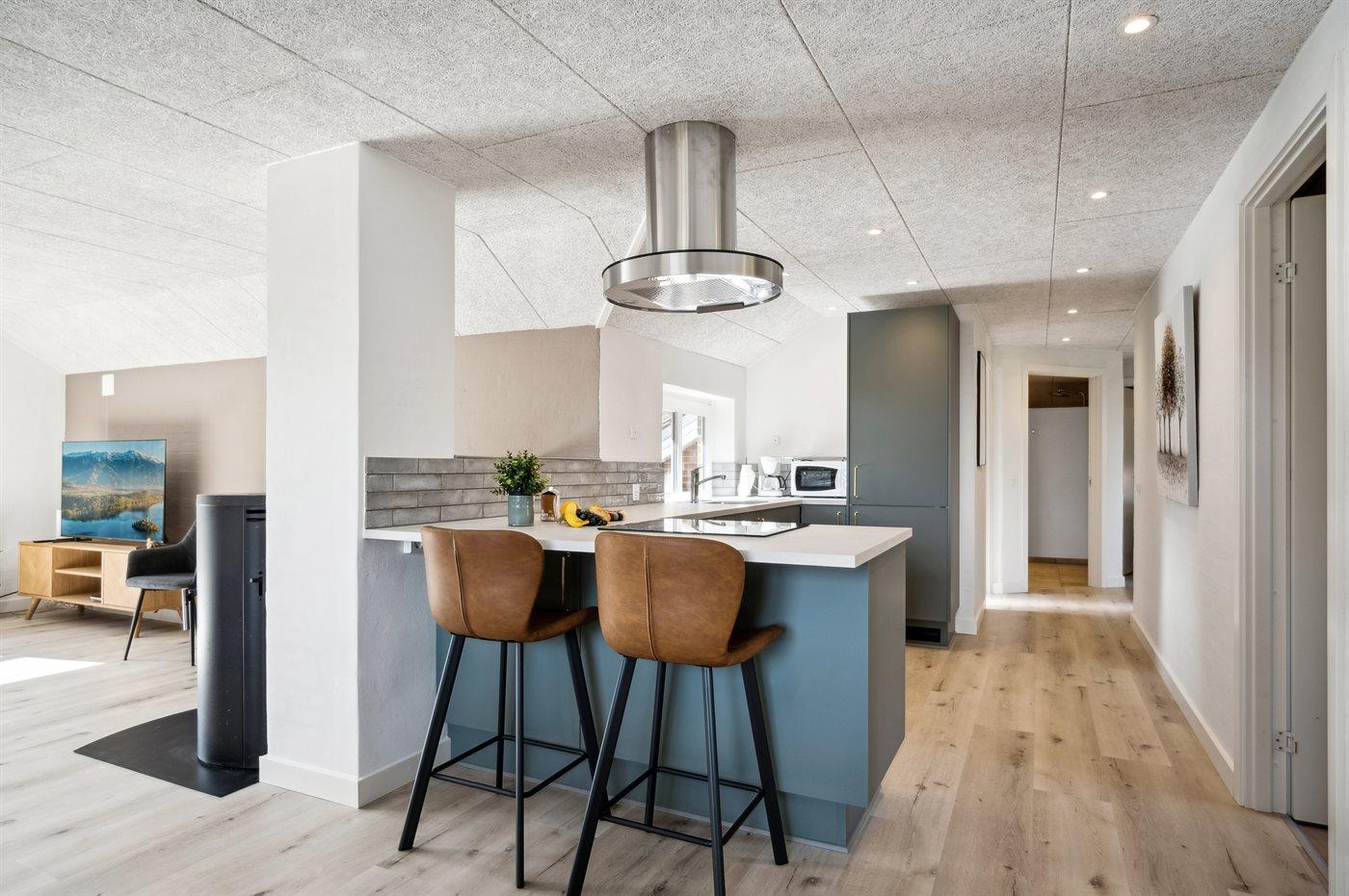 Køkkenet er udstyret med 1 køle-/fryseskab. Der er 4 elkogeplader, bageovn, varmluftovn, mikrobølgeovn samt opvaskemaskine Der er gulvvarme i køkkenet.