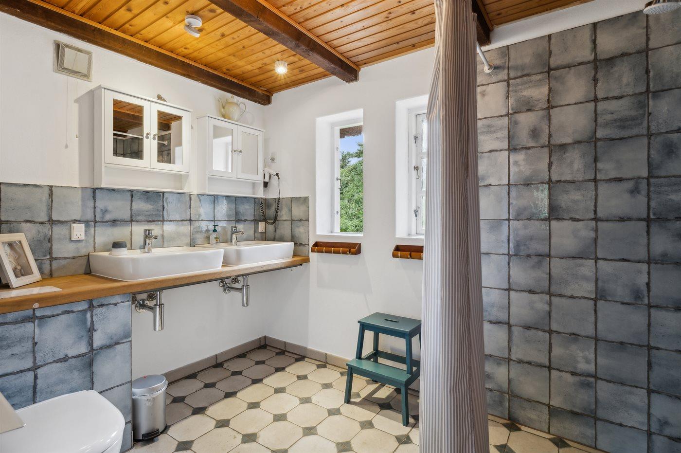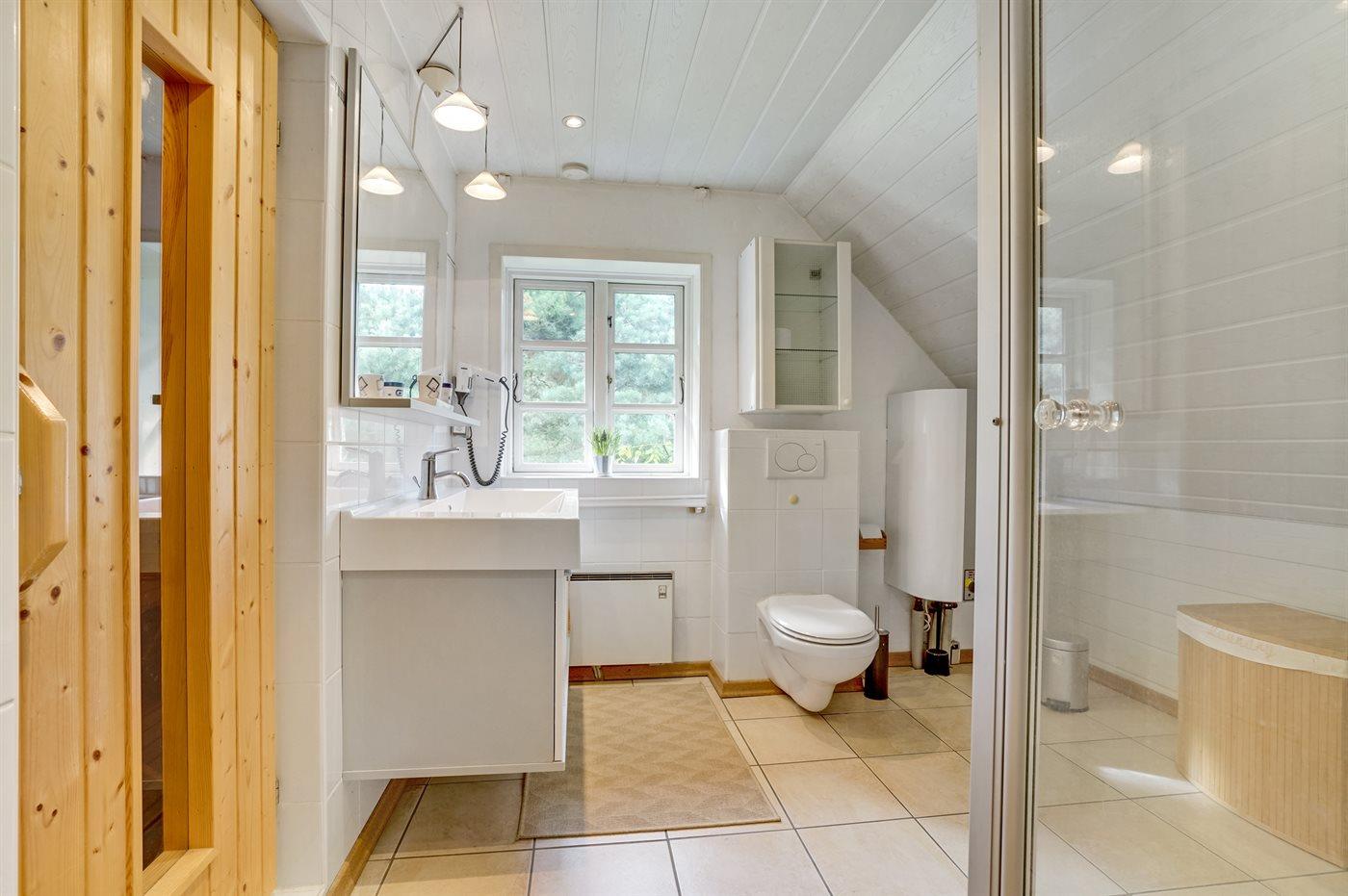 Der er 2 badeværelser med bruseniche og 2 toiletter. Der er gulvvarme på 1 badeværelse. I saunaen er der mulighed for afslapning.