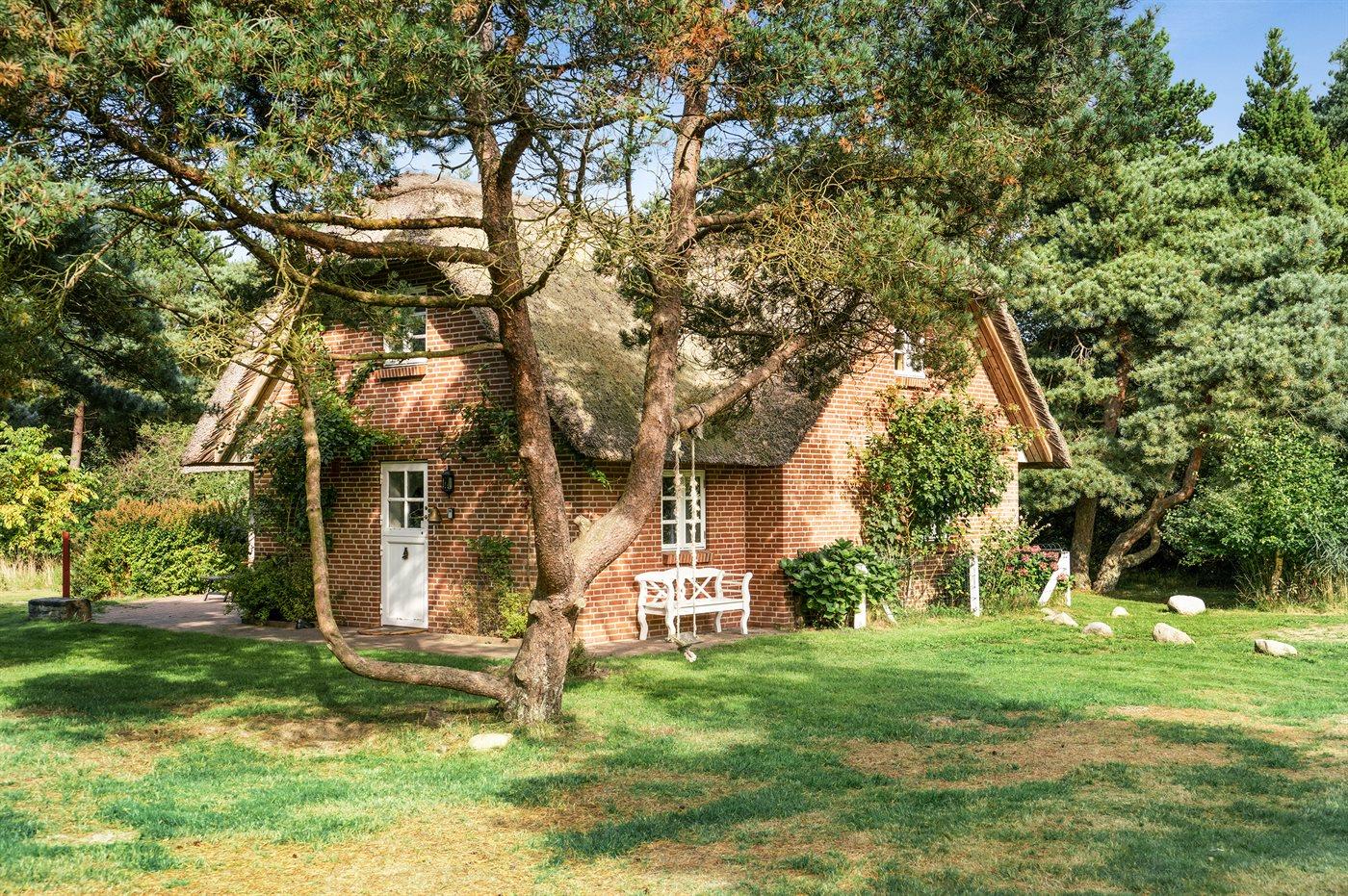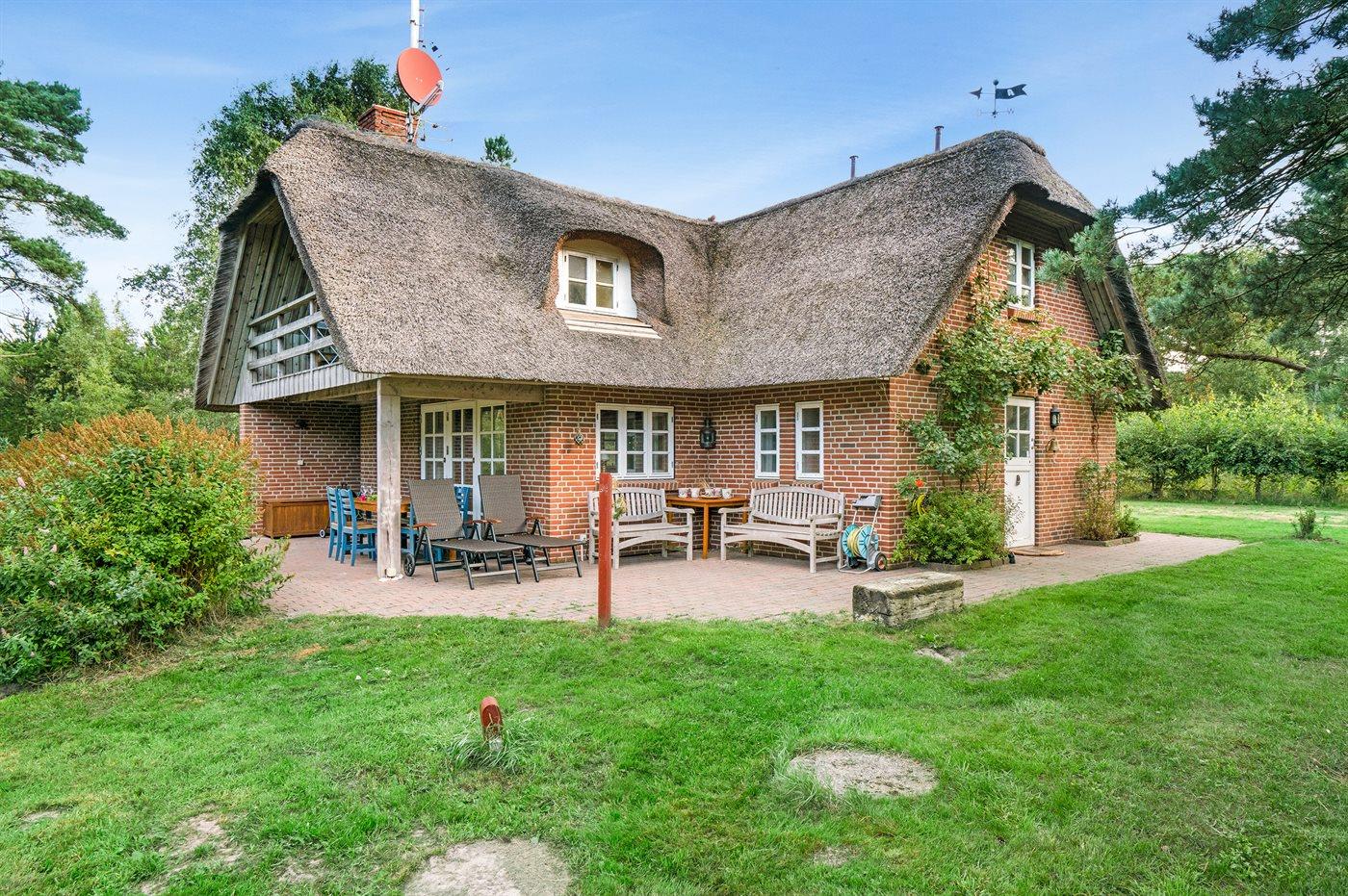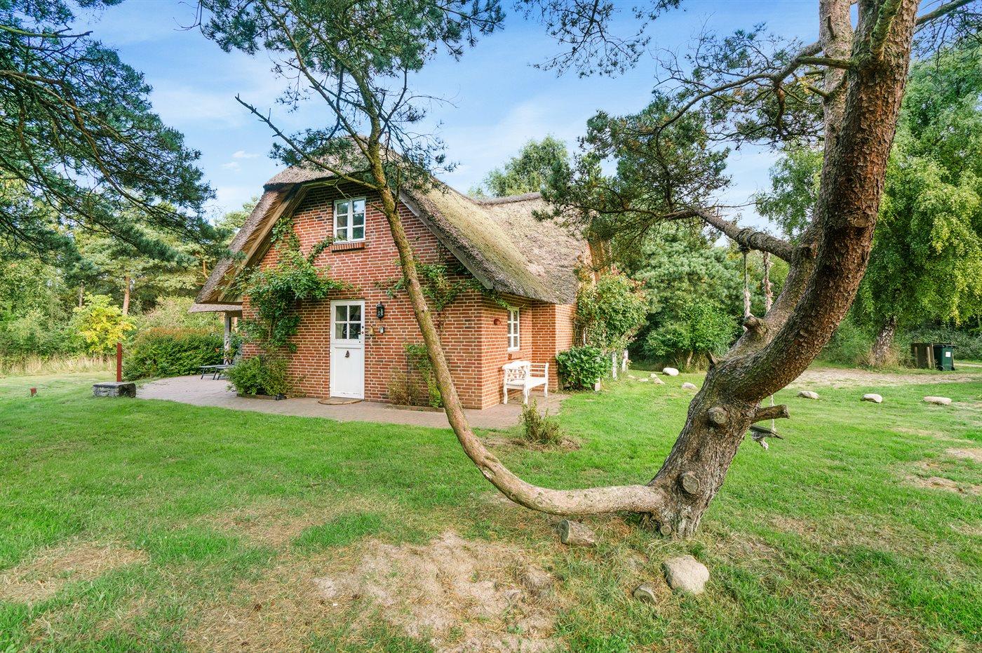 Dette dejlige stråtækte sommerhus ligger på en stor, lyngklædt grund med græsplæne nær Sønderstrand.