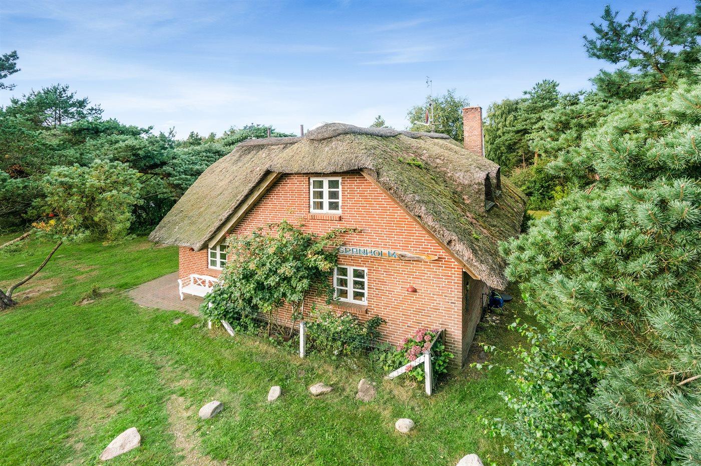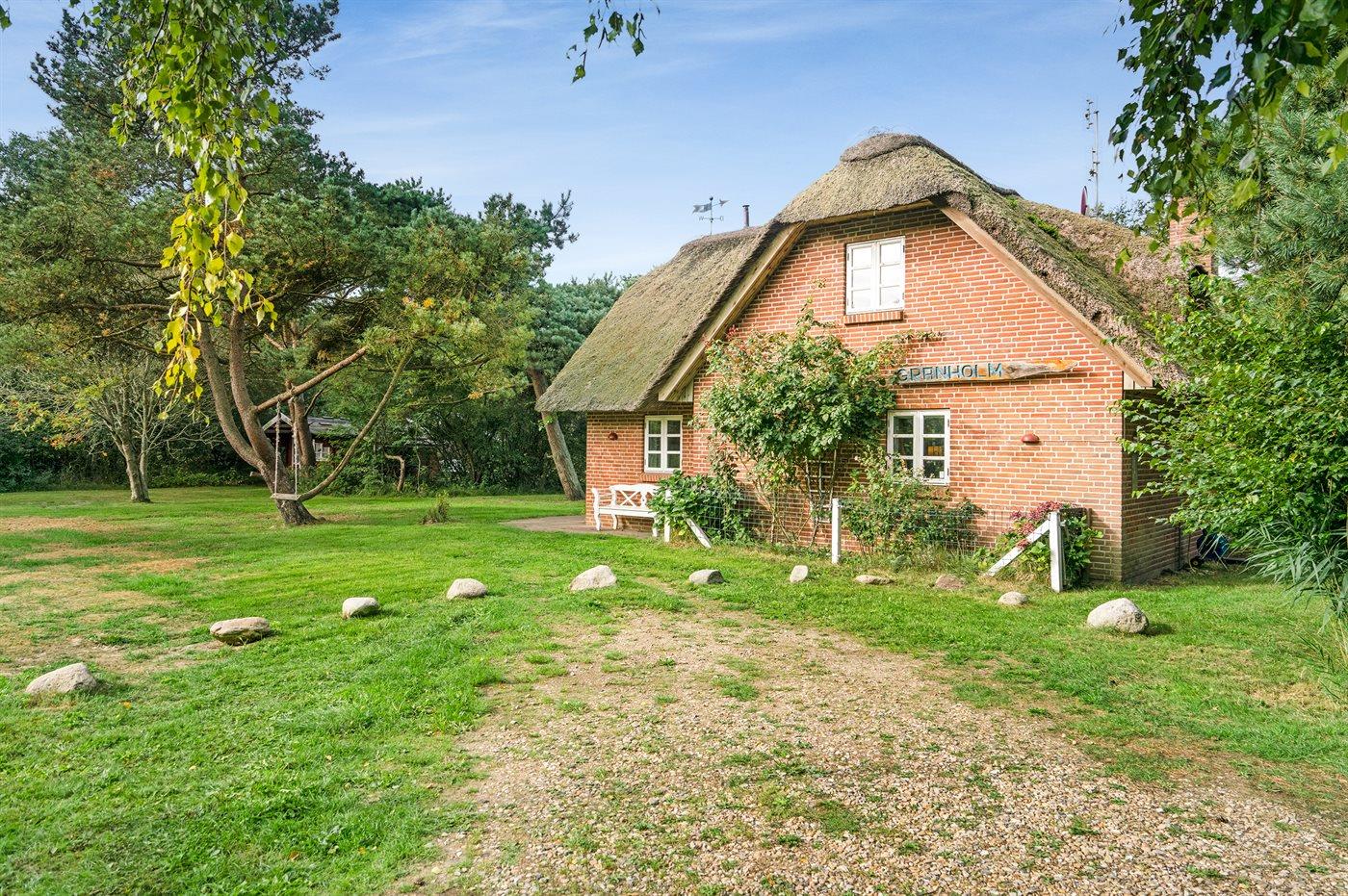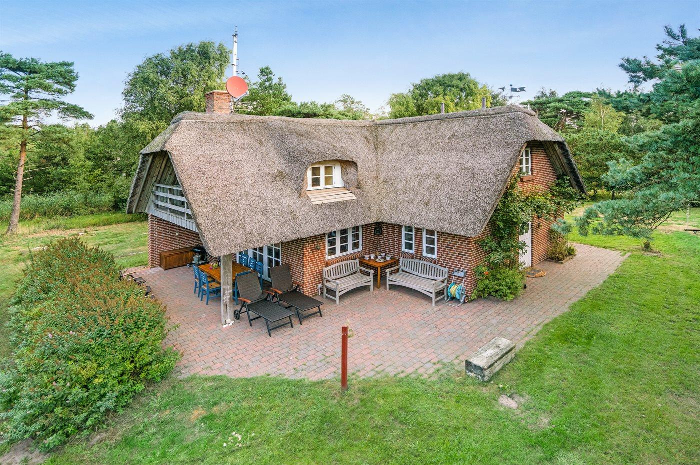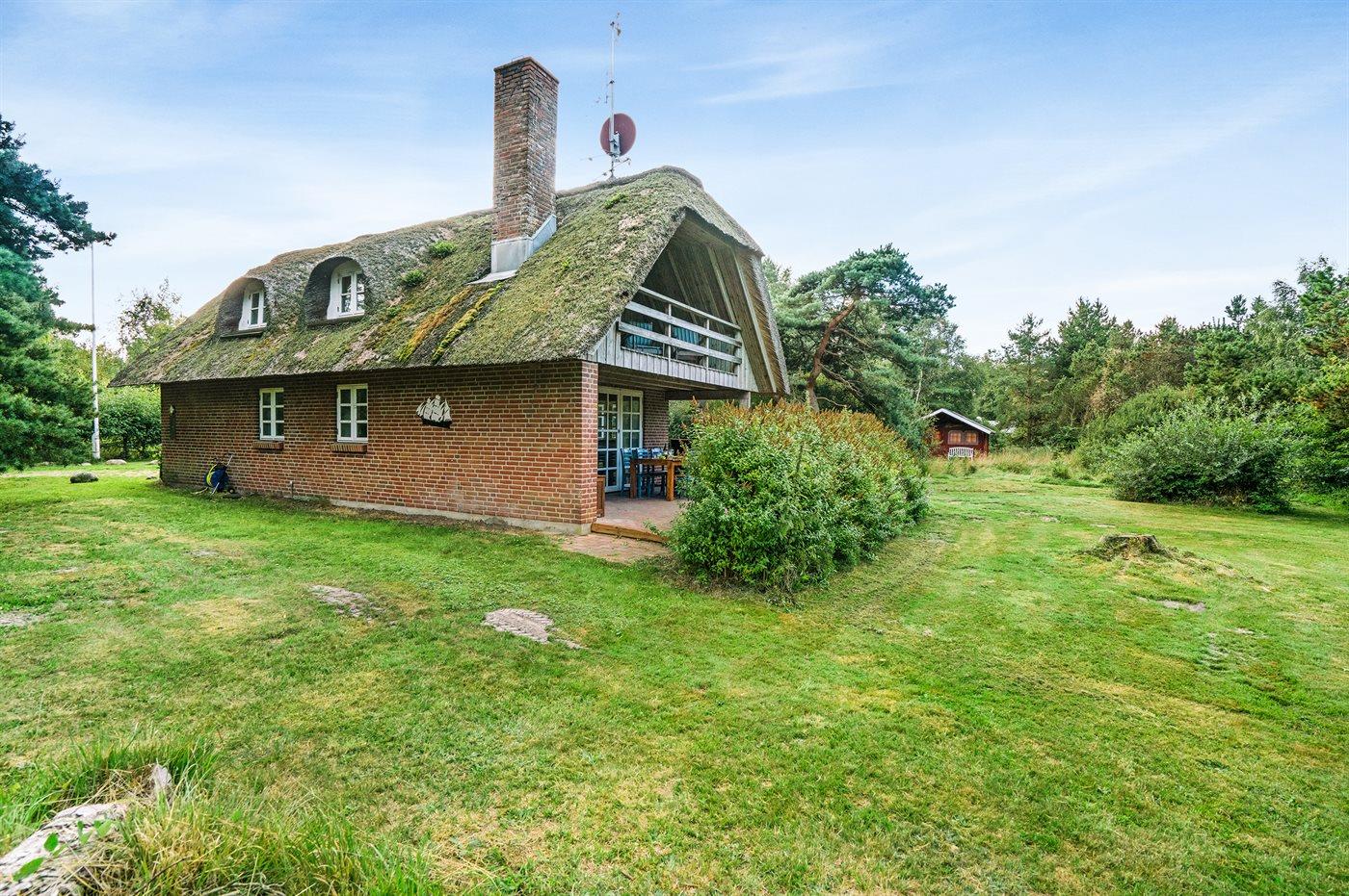 Dette dejlige stråtækte sommerhus ligger på en stor, lyngklædt grund med græsplæne nær Sønderstrand.