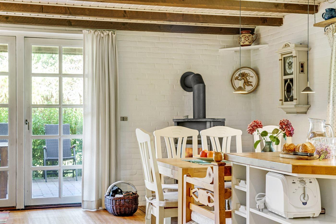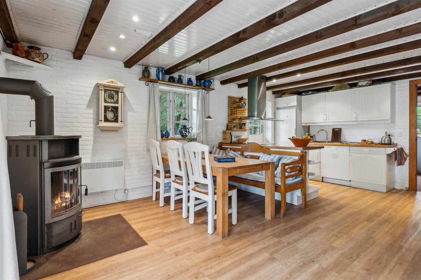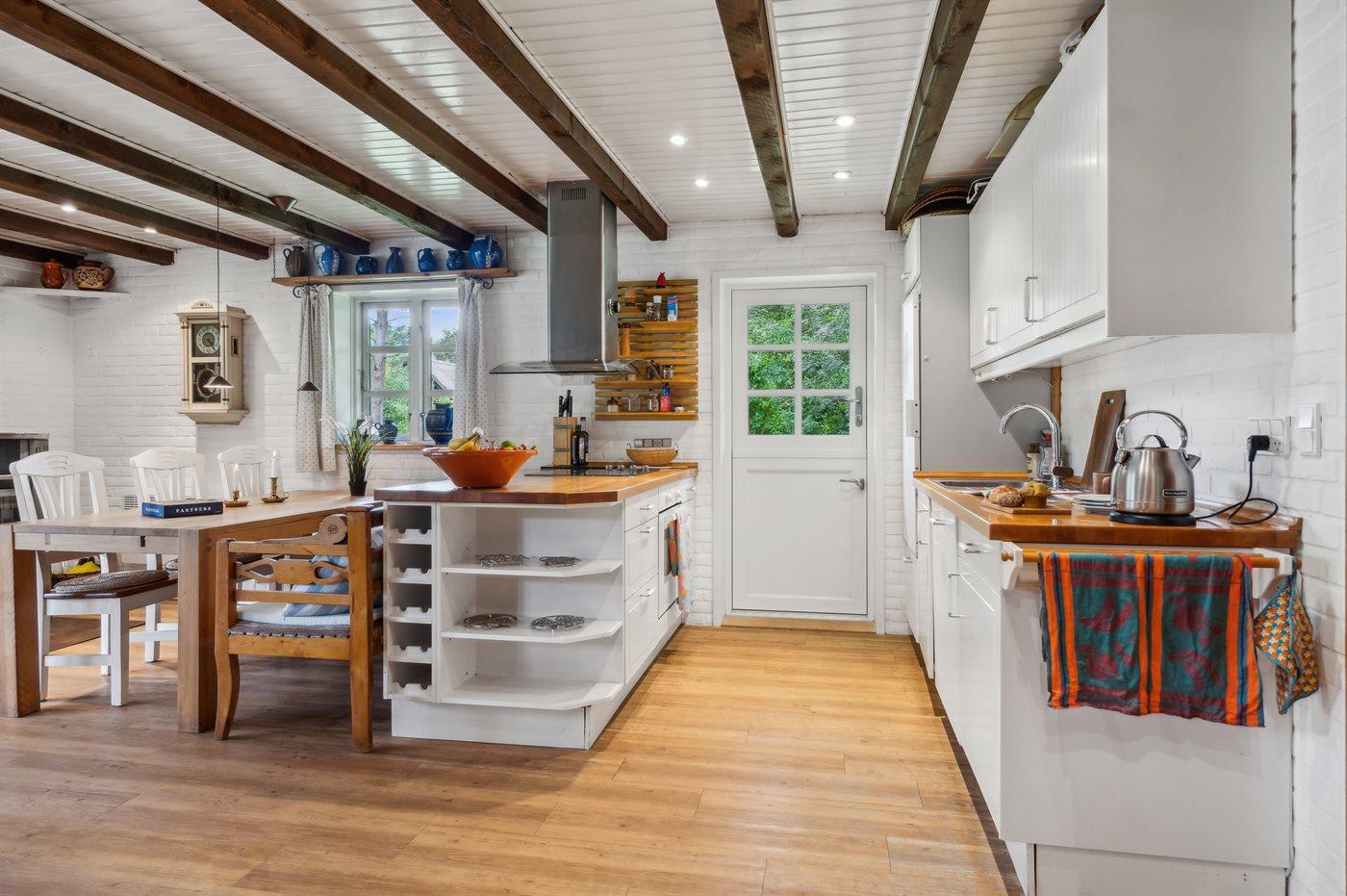 Køkkenet er udstyret med 1 køleskab. Der er 4 elkogeplader, bageovn, mikrobølgeovn samt opvaskemaskine.