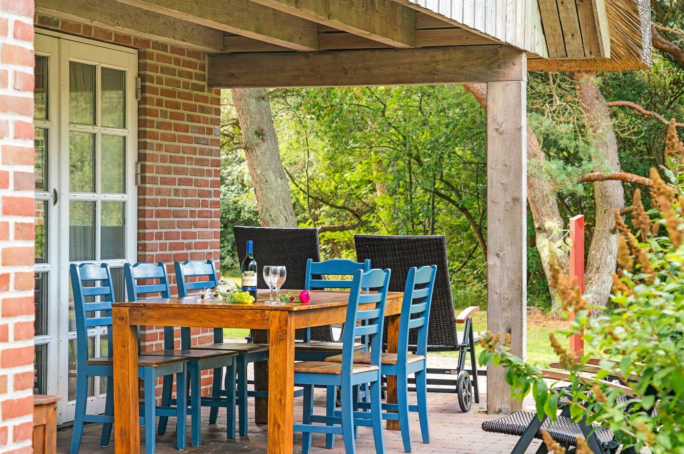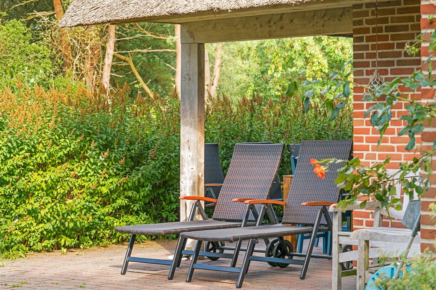 Hyggeligt stråtækt sommerhus på stor naturgrund nær Sønderstrand i Rømø, perfekt til familieferie med sauna og brændeovn.