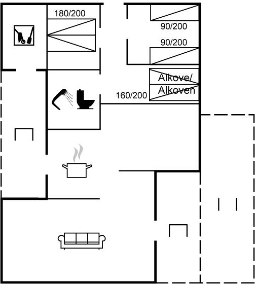 Der er i alt 2 soveværelser. Sovepladserne fordeler sig på: 2 sovepladser i dobbeltseng. 2 sovepladser i enkeltsenge. 2 sovepladser i alkove.