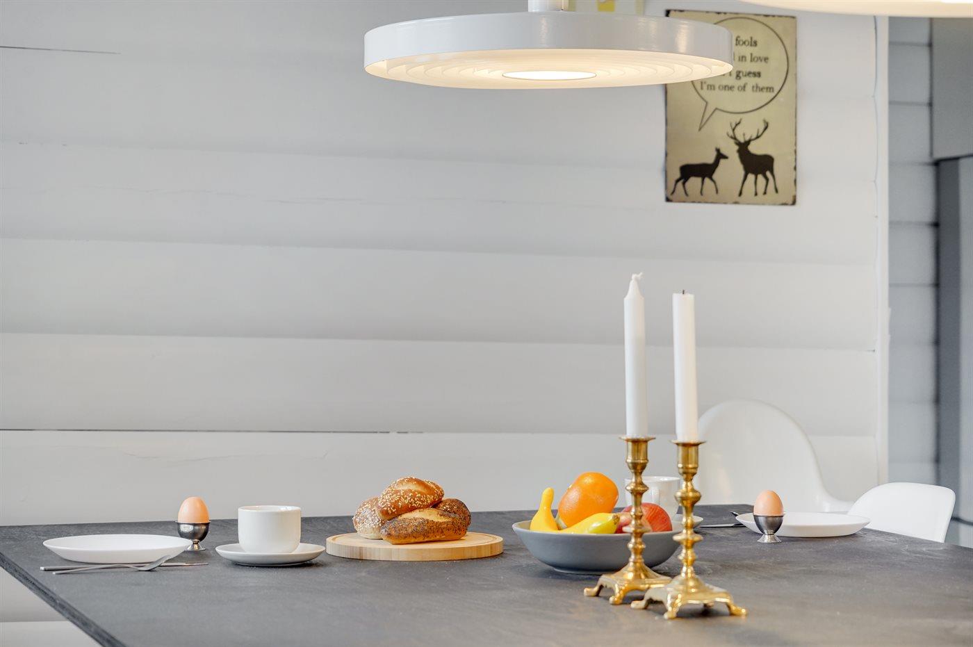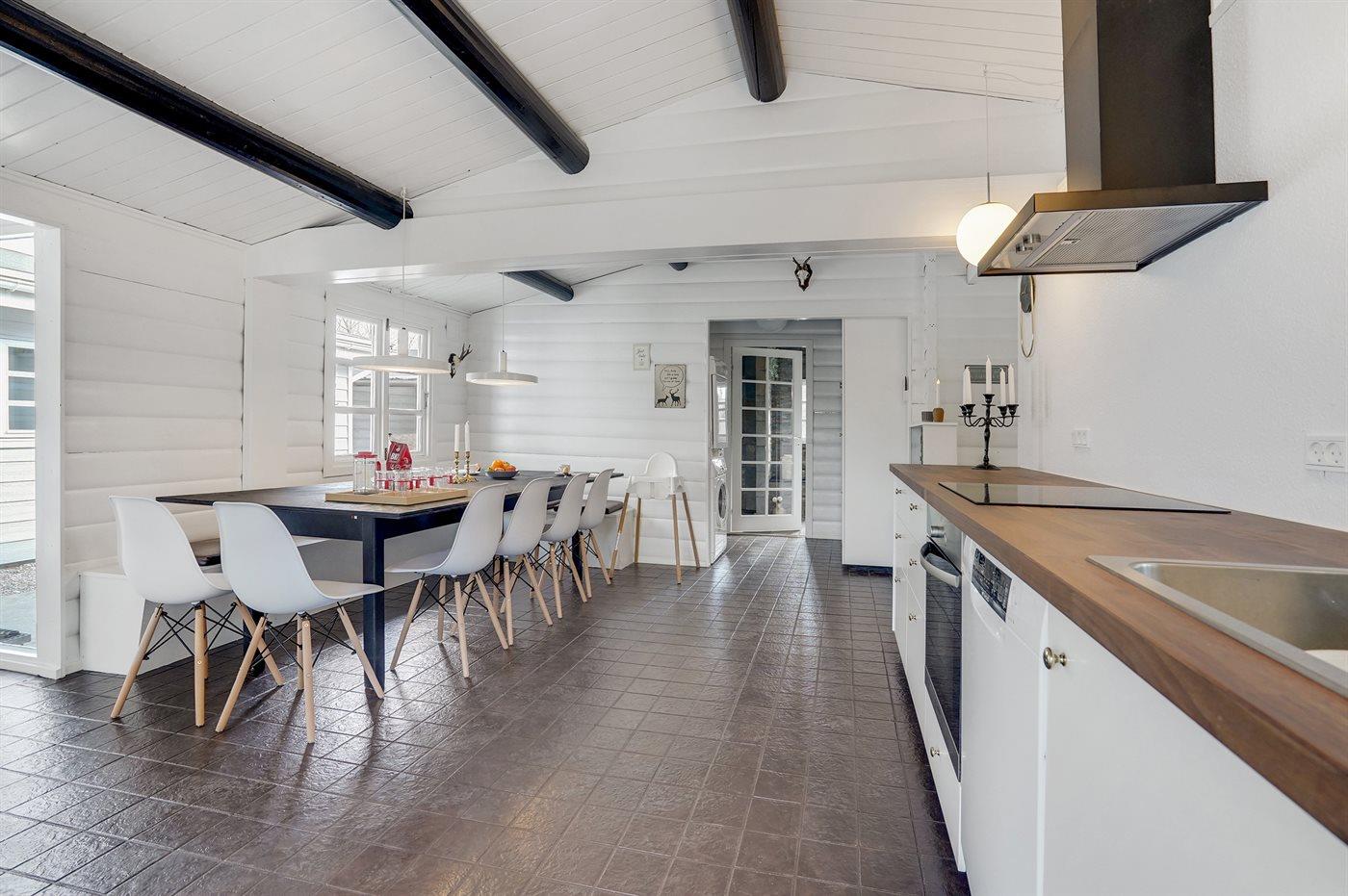 Køkkenet er udstyret med 1 køleskab. Der er 4 elkogeplader, bageovn, mikrobølgeovn samt opvaskemaskine.