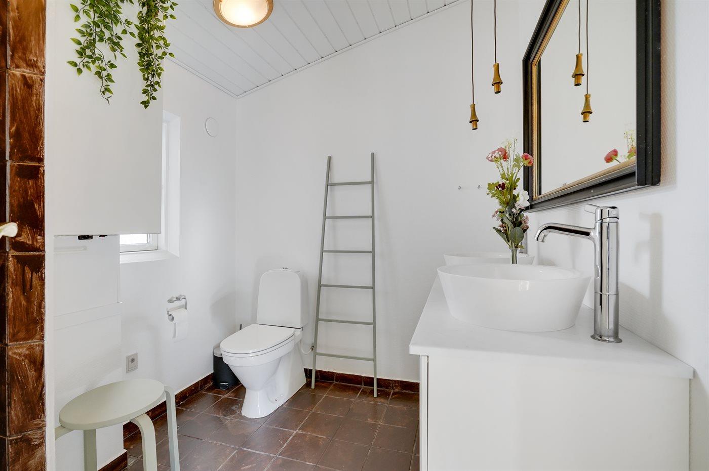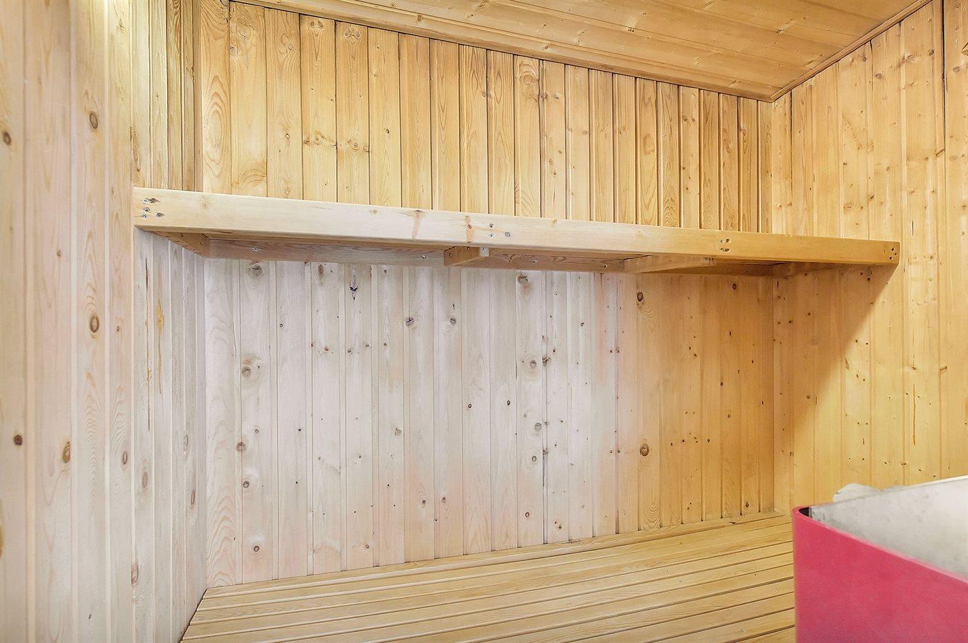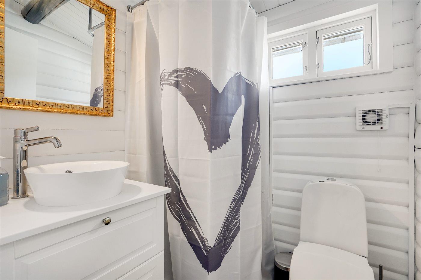 Der er 2 badeværelser med bruser og 3 toiletter, heraf 1 gæstetoilet. Der er gulvvarme på 2 badeværelser. I saunaen er der mulighed for afslapning.