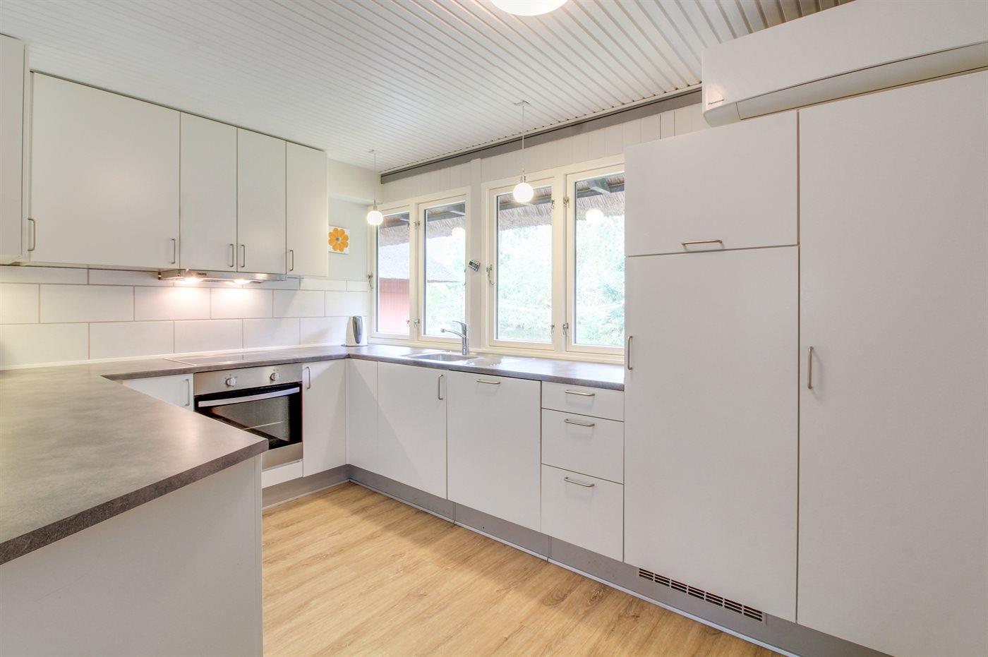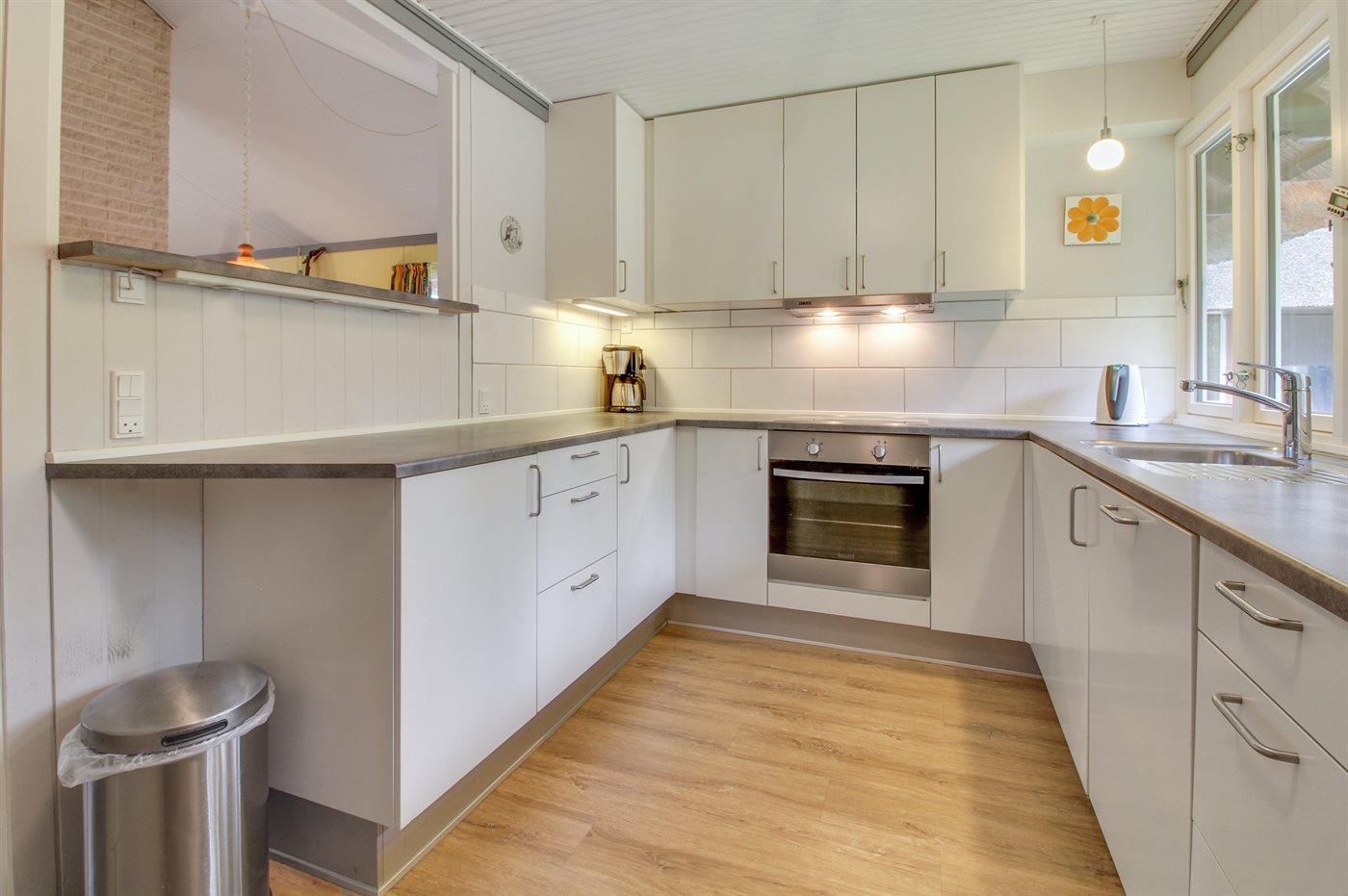 Køkkenet er udstyret med 1 køleskab. Der er 4 elkogeplader, bageovn, mikrobølgeovn samt opvaskemaskine.