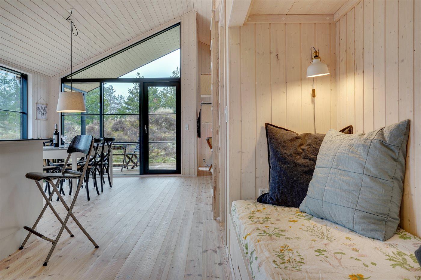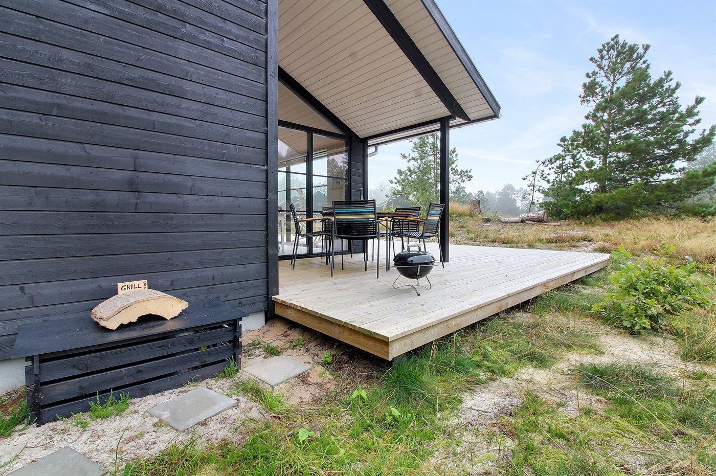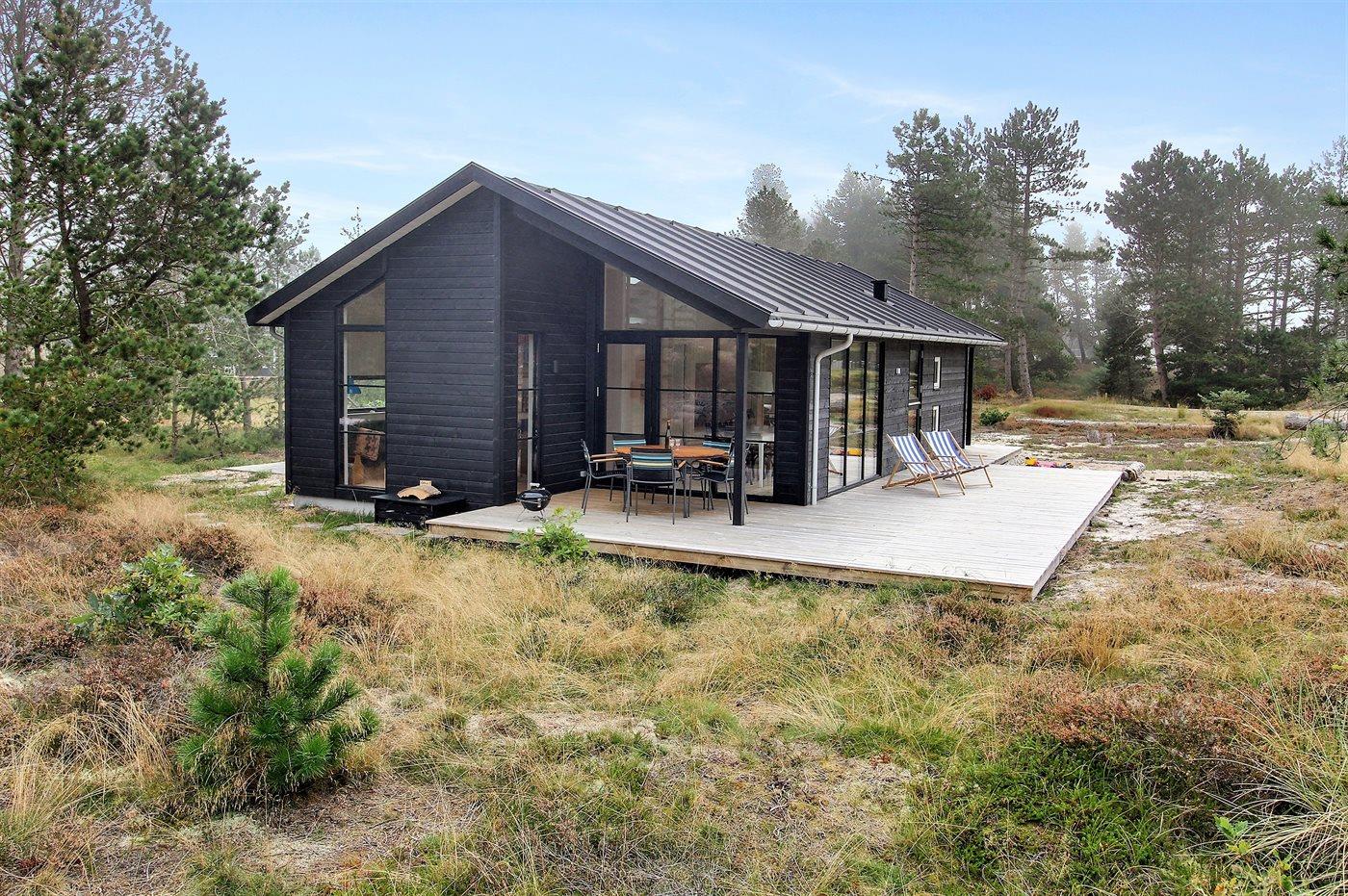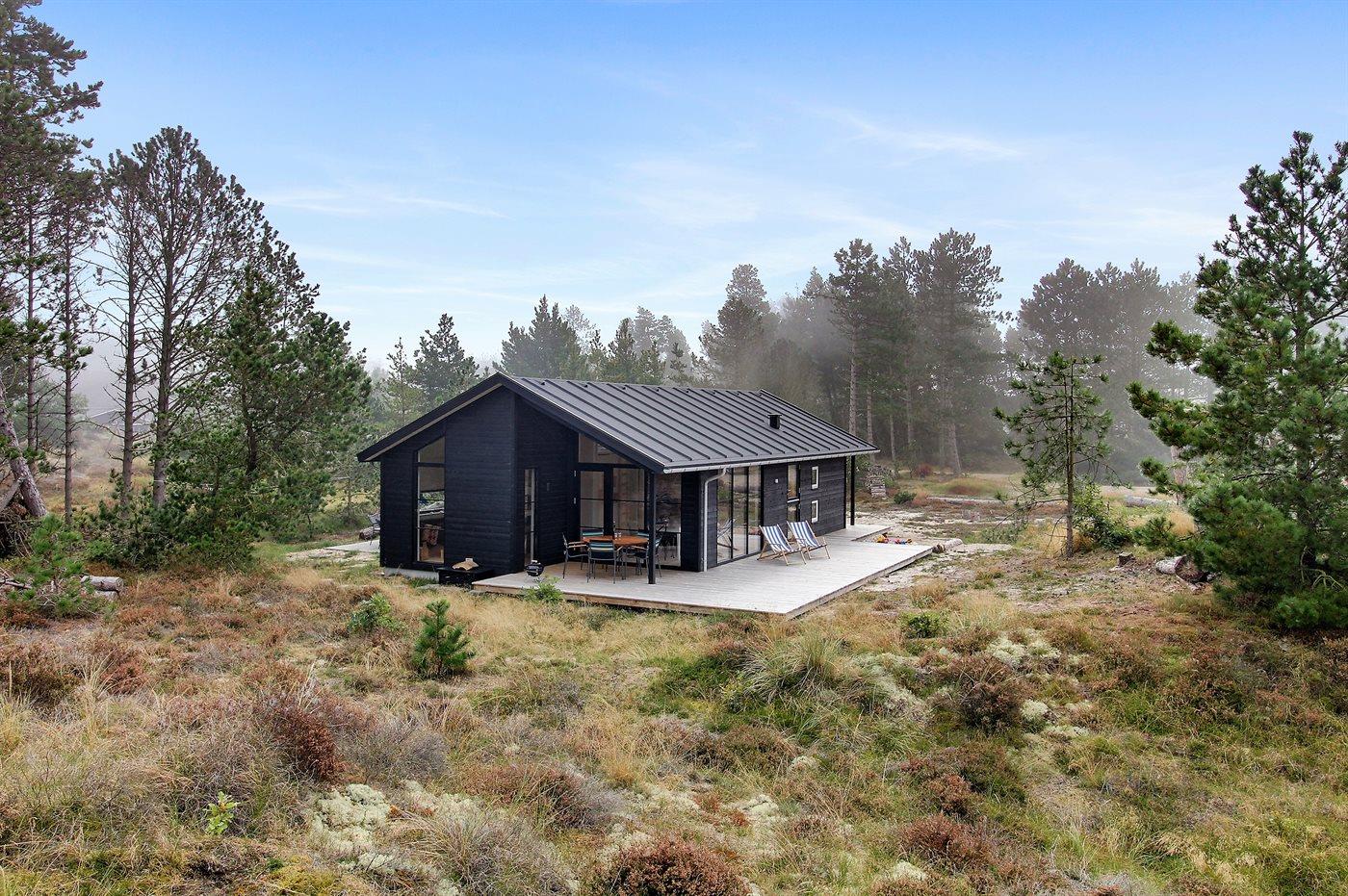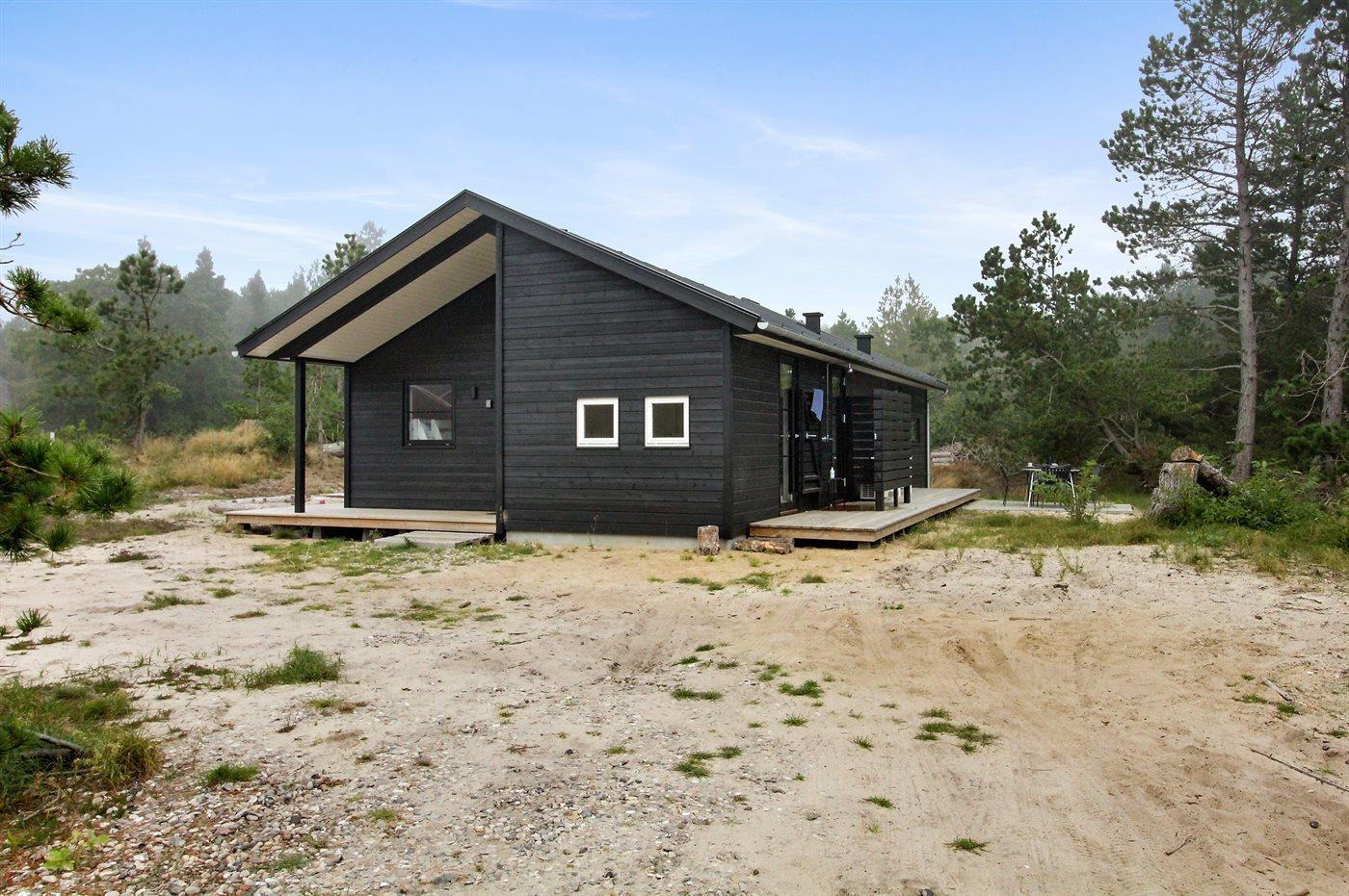 Dette nybyggede sommerhus på 77 m2 fra 2019 på en 2500 m2 stor naturgrund har en særdeles charmerende og personlig indretning, hvor der er kælet for detaljerne. Herunder kan nævnes hyggelig alkove i køkken-alrum, egen udgang fra soveværelse, udebruser bag afskærmning med direkte adgang fra badeværelse, adgang til terrasse fra køkken, velindrettet og lys hems med ovenlysvindue samt stor træterrasse vendt mod den kuperede og private del af den store lyngbevoksede naturgrund. Til børnene er der både gynge og sandkasse samt gode klatretræer. Der er også en hængekøje mellem træerne. Af og til kan man i de stille timer få besøg af rådyr på grunden. Der er grill til rådighed, og naturligvis parkering ved huset. Fra grunden er der via flere stier (se billeder) fin adgang til Vadehavet (kun 400 m.), hvor der netop her er hvid sandstrand. Herfra er der rigtig gode muligheder for at udforske vadehavets rige dyreliv, herunder fange krabber, muslinger (og østers) mv.