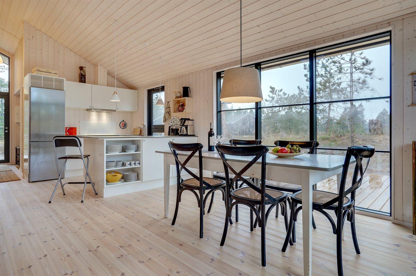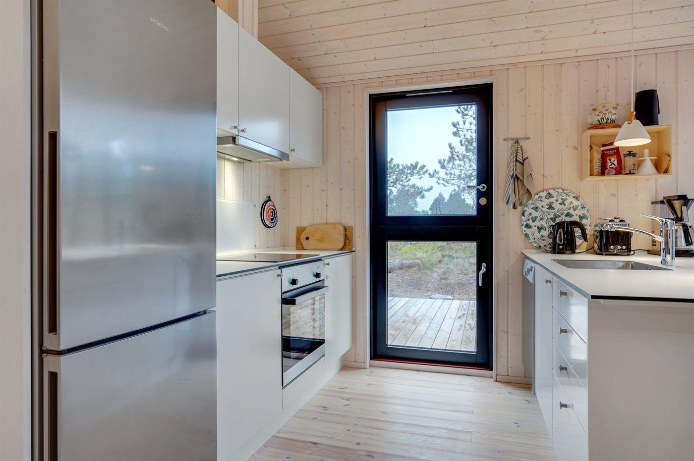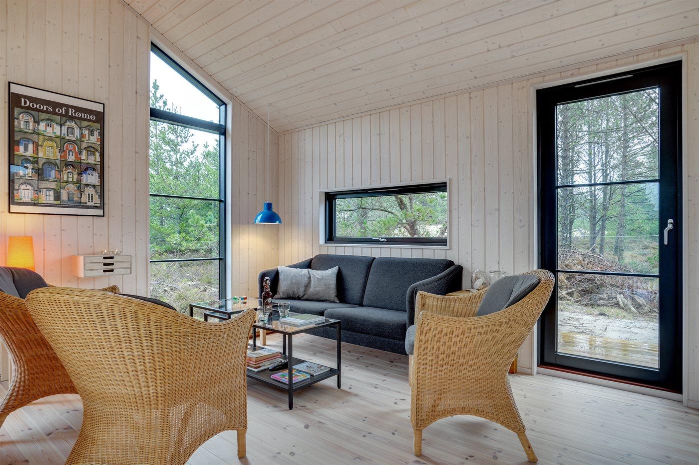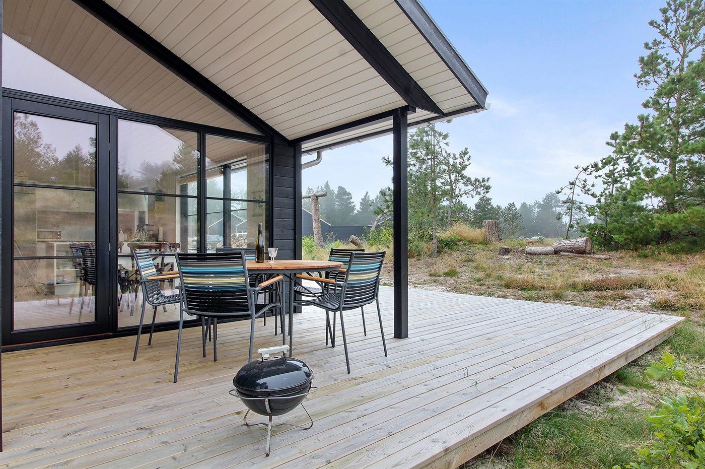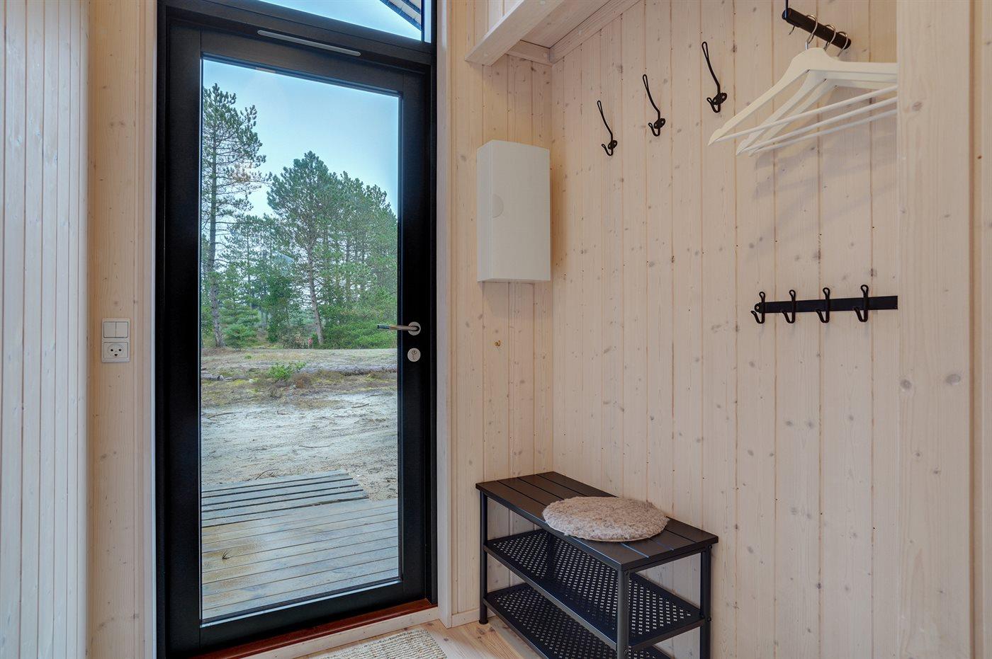 Dette nybyggede sommerhus på 77 m2 fra 2019 på en 2500 m2 stor naturgrund har en særdeles charmerende og personlig indretning, hvor der er kælet for detaljerne. Herunder kan nævnes hyggelig alkove i køkken-alrum, egen udgang fra soveværelse, udebruser bag afskærmning med direkte adgang fra badeværelse, adgang til terrasse fra køkken, velindrettet og lys hems med ovenlysvindue samt stor træterrasse vendt mod den kuperede og private del af den store lyngbevoksede naturgrund. Til børnene er der både gynge og sandkasse samt gode klatretræer. Der er også en hængekøje mellem træerne. Af og til kan man i de stille timer få besøg af rådyr på grunden. Der er grill til rådighed, og naturligvis parkering ved huset. Fra grunden er der via flere stier (se billeder) fin adgang til Vadehavet (kun 400 m.), hvor der netop her er hvid sandstrand. Herfra er der rigtig gode muligheder for at udforske vadehavets rige dyreliv, herunder fange krabber, muslinger (og østers) mv.