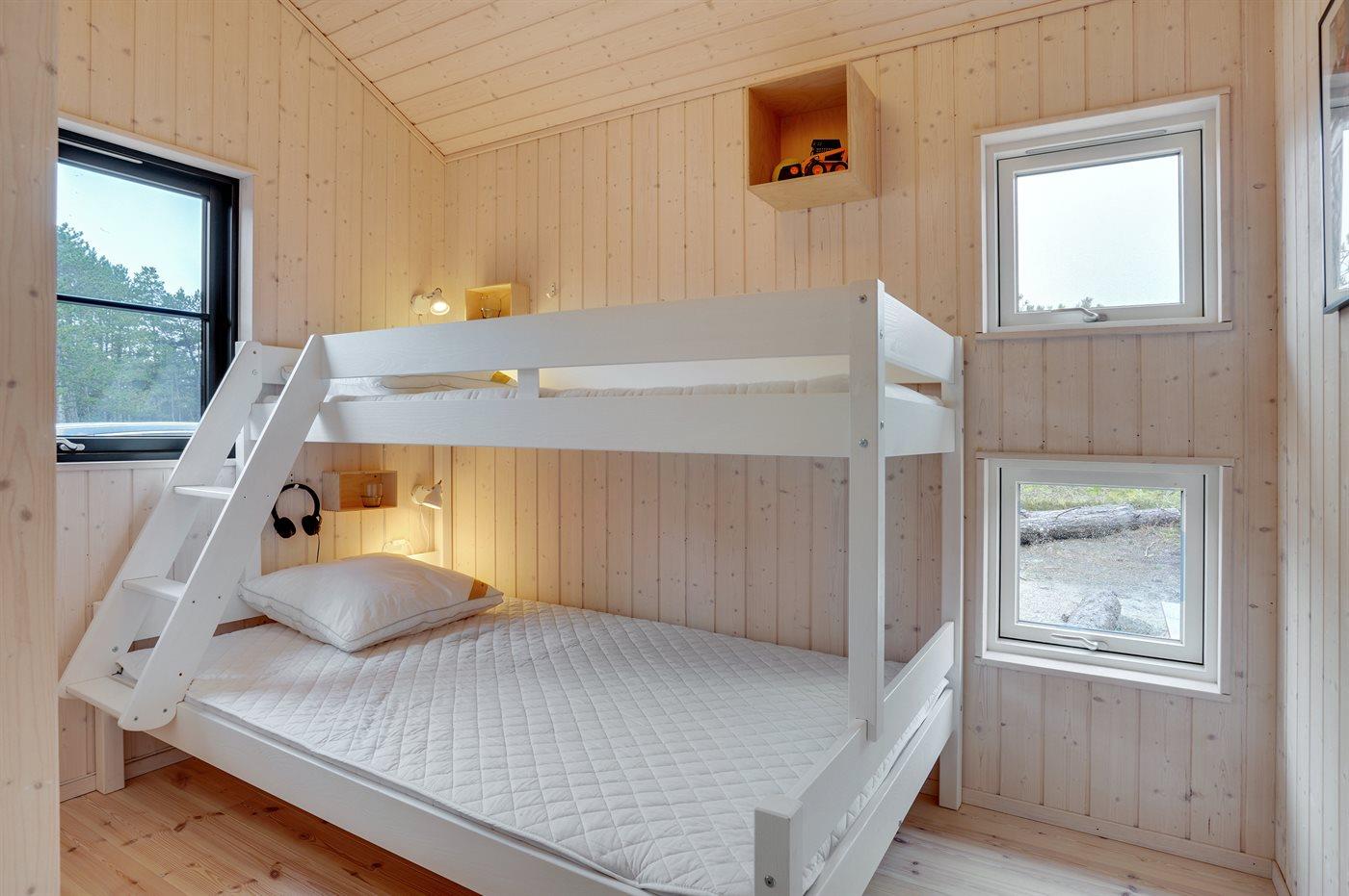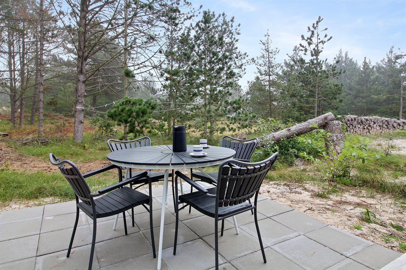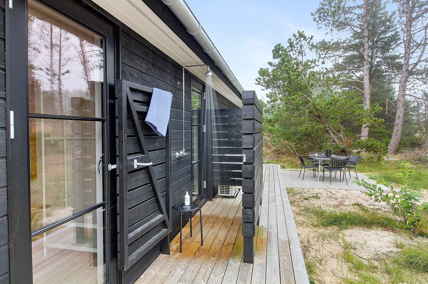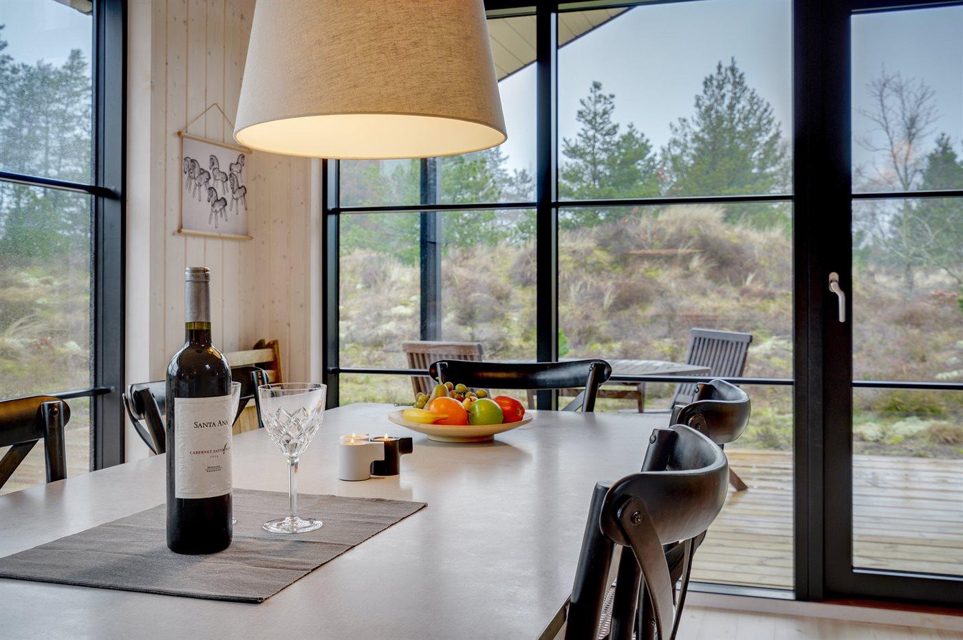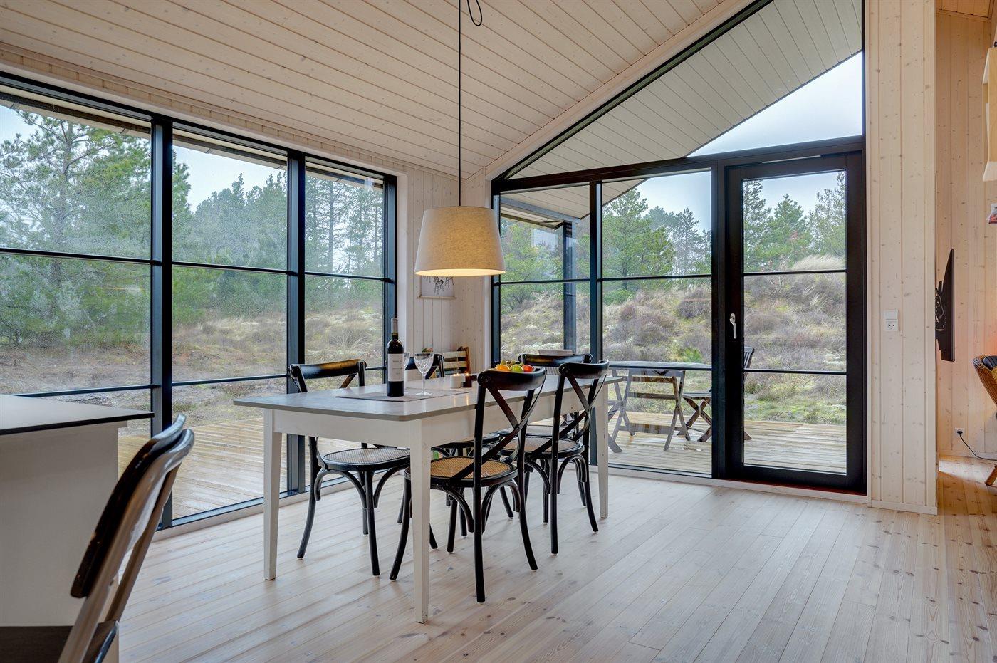 Dette nybyggede sommerhus på 77 m2 fra 2019 på en 2500 m2 stor naturgrund har en særdeles charmerende og personlig indretning, hvor der er kælet for detaljerne. Herunder kan nævnes hyggelig alkove i køkken-alrum, egen udgang fra soveværelse, udebruser bag afskærmning med direkte adgang fra badeværelse, adgang til terrasse fra køkken, velindrettet og lys hems med ovenlysvindue samt stor træterrasse vendt mod den kuperede og private del af den store lyngbevoksede naturgrund. Til børnene er der både gynge og sandkasse samt gode klatretræer. Der er også en hængekøje mellem træerne. Af og til kan man i de stille timer få besøg af rådyr på grunden. Der er grill til rådighed, og naturligvis parkering ved huset. Fra grunden er der via flere stier (se billeder) fin adgang til Vadehavet (kun 400 m.), hvor der netop her er hvid sandstrand. Herfra er der rigtig gode muligheder for at udforske vadehavets rige dyreliv, herunder fange krabber, muslinger (og østers) mv.