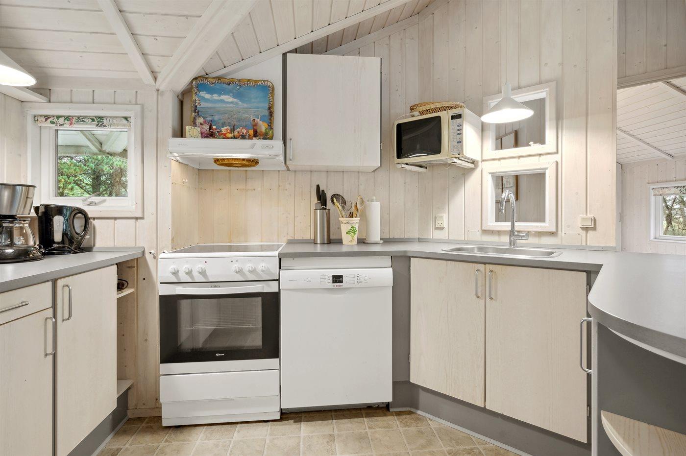 Køkkenet er udstyret med 1 køleskab. Der er 4 keramiske kogeplader, varmluftovn, mikrobølgeovn samt opvaskemaskine.