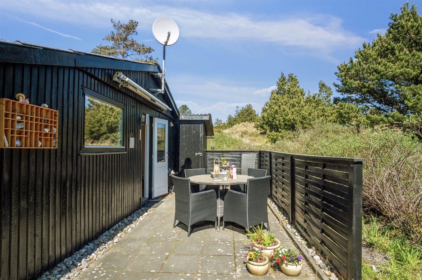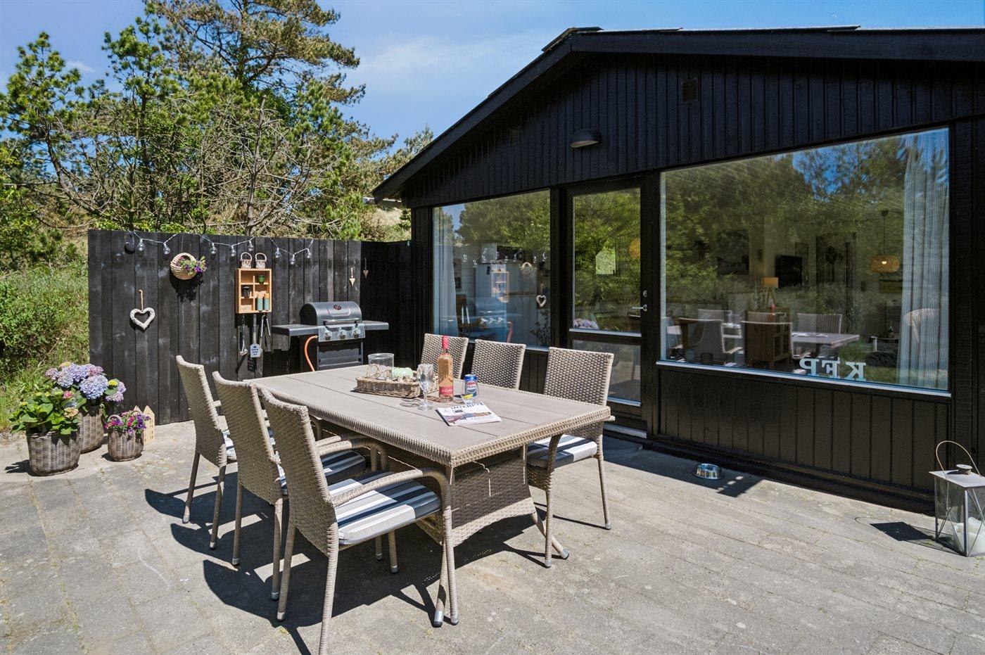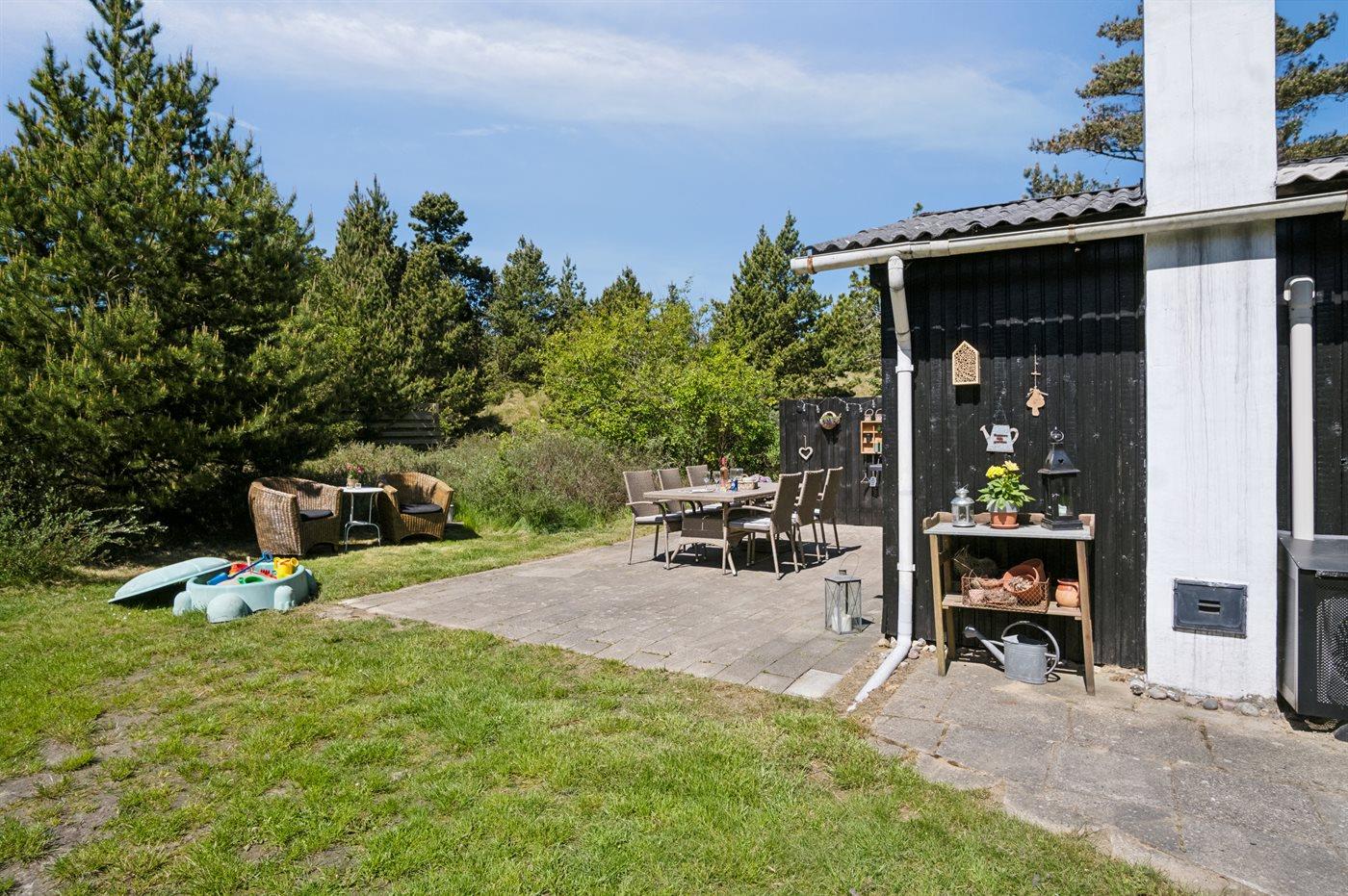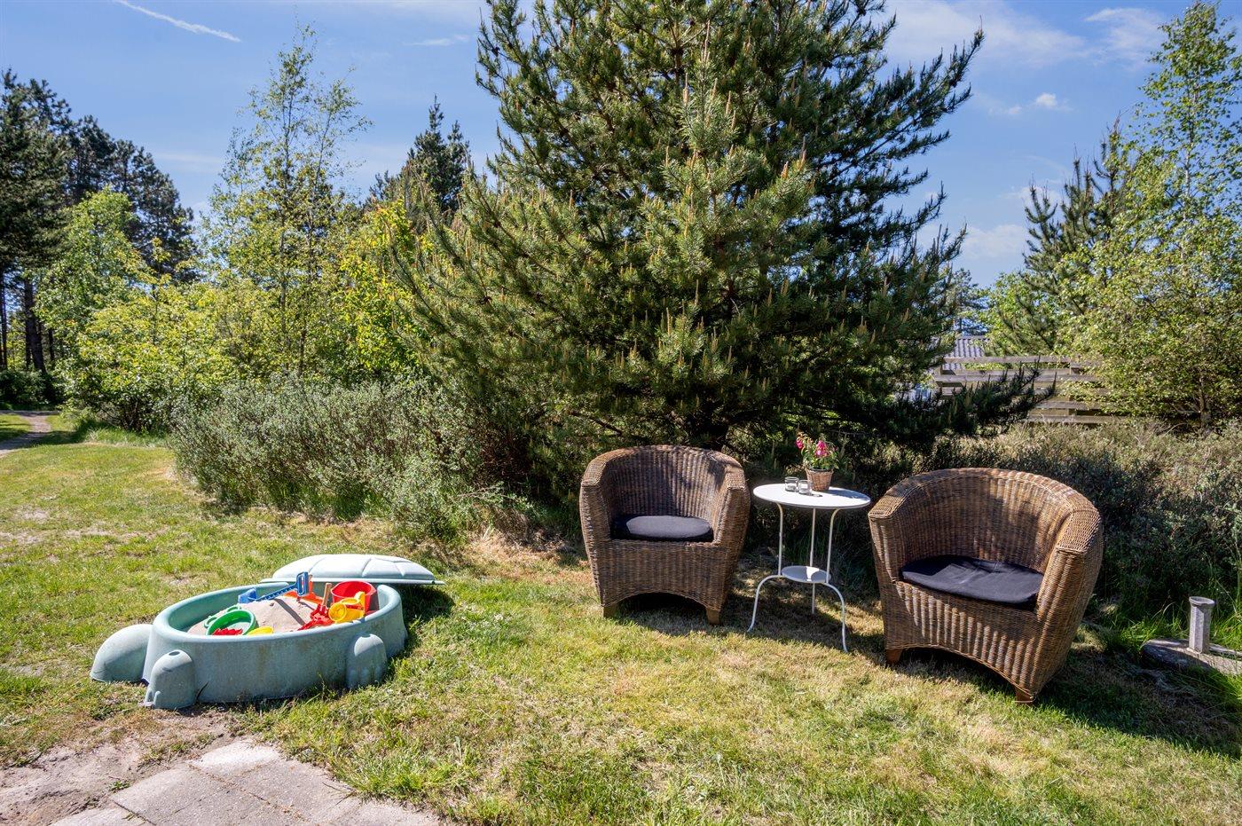 Udenfor kan I nyde naturen på den åbne terrasse, hvor der findes grill, havemøbler og sandkasse.