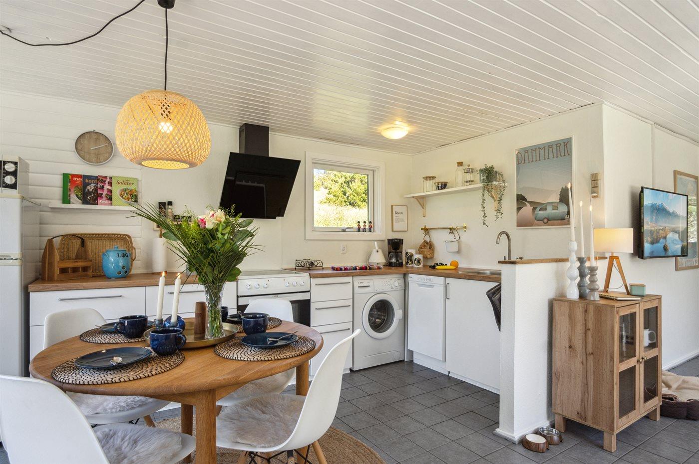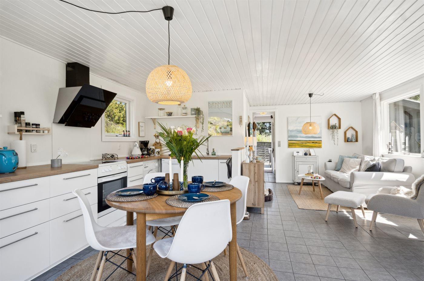 Sommerhuset der er bygget i 1965, er løbende renoveret og fremstår lyst og indbydende med mange moderne faciliteter. Der er en entré med gulvvarme og plads til jakker og sko, to gode soveværelser med henholdsvis en dobbeltseng og to enkeltsenge, en hyggelig stue med brændeovn og åben forbindelse til det lyse køkken, hvor der er spiseplads og udgang til terrassen. Husets badeværelse har gulvvarme og bruseniche. Til de mindste feriegæster findes barnestol og barneseng. Sommerhuset opvarmes ved hjælp af luft til luft varmepumpe, der sikrer et godt indeklima, hele året.