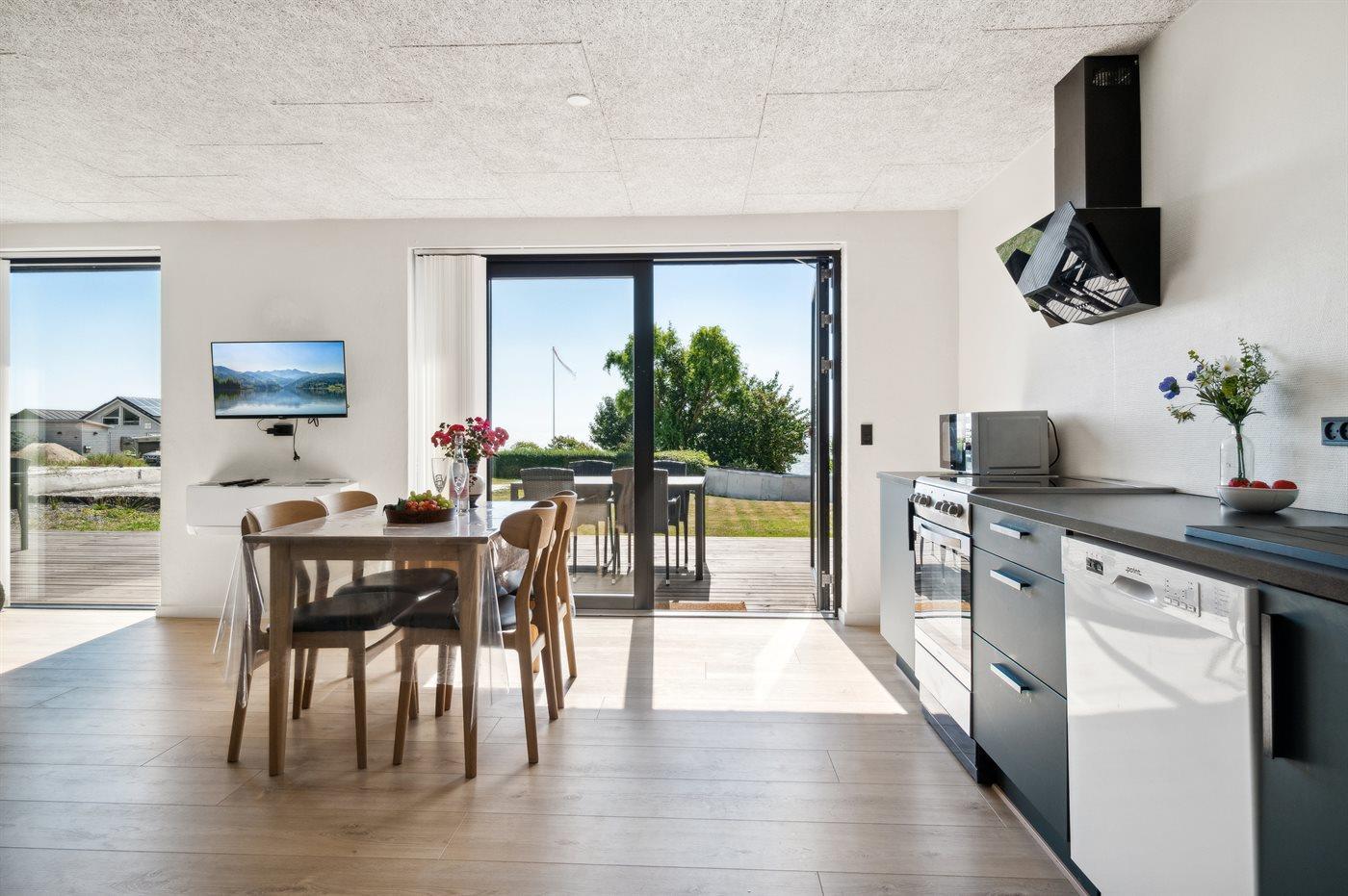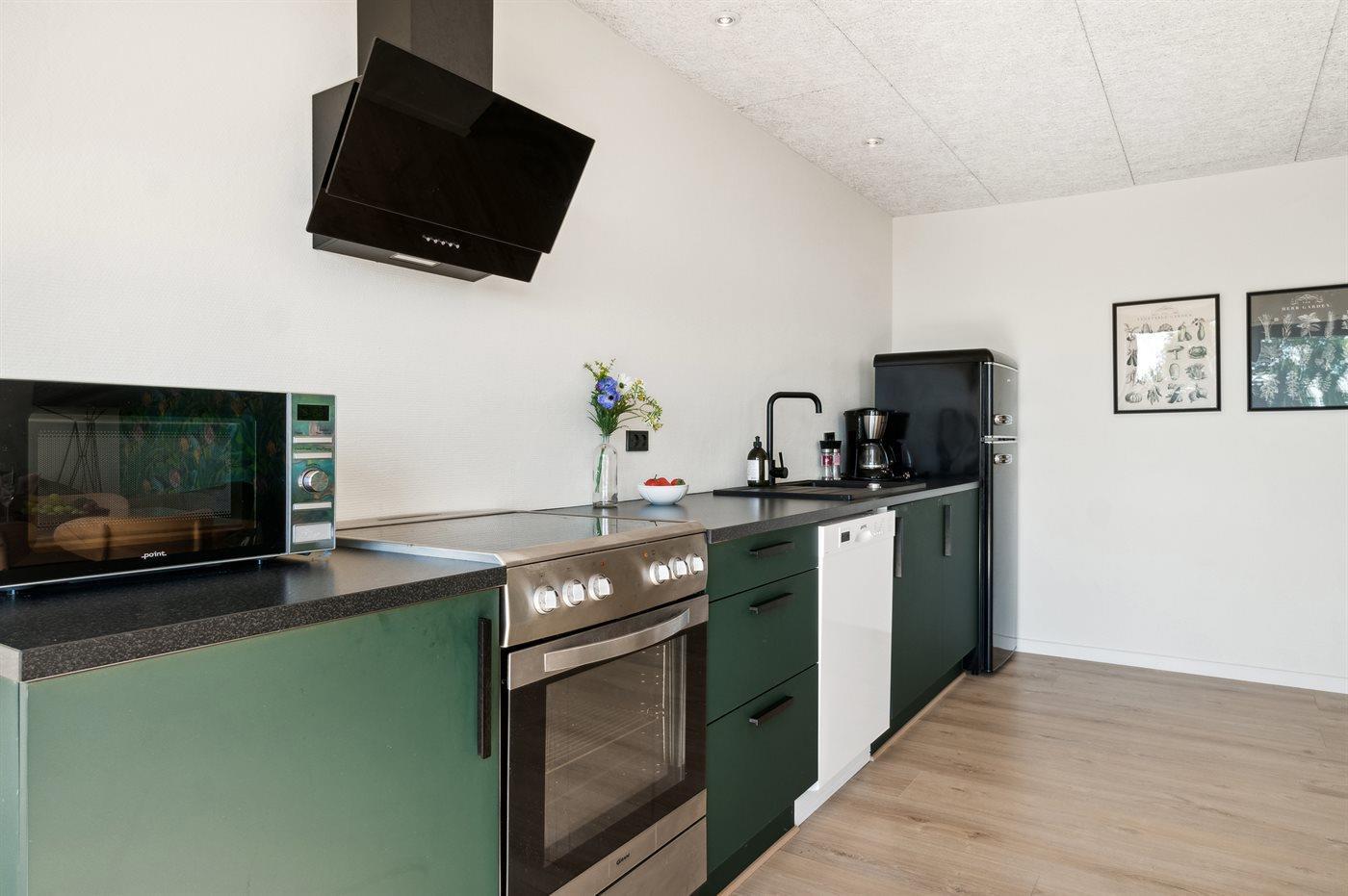Køkkenet er udstyret med 1 køleskab. Der er 4 keramiske kogeplader, varmluftovn, mikrobølgeovn samt opvaskemaskine.