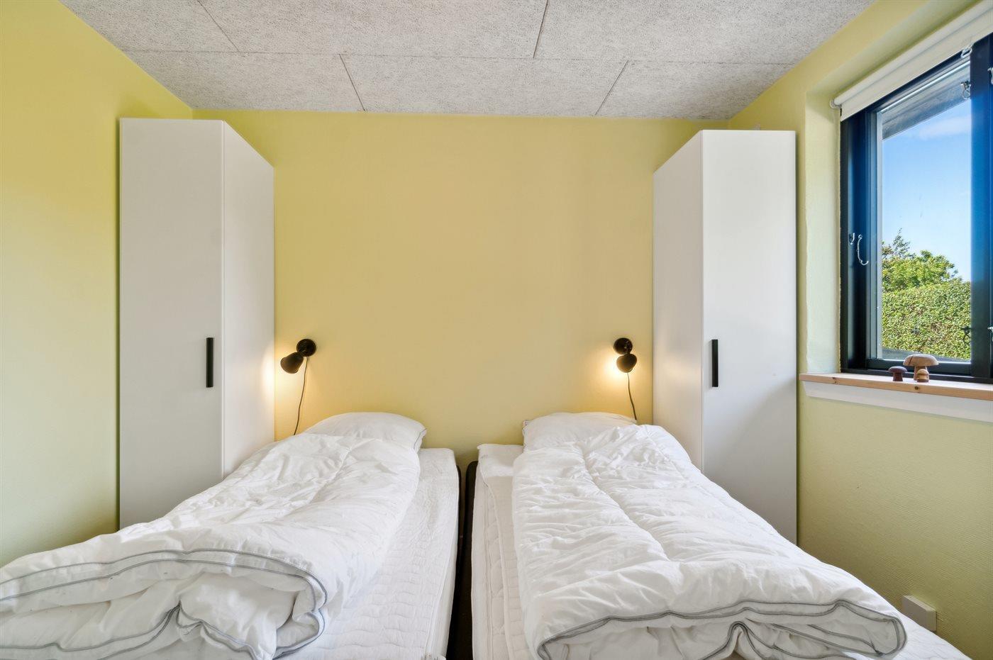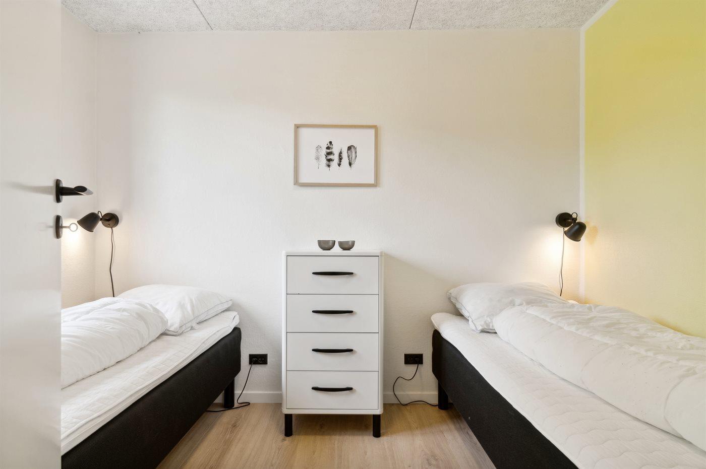 Der er i alt 2 soveværelser. Sovepladserne fordeler sig på: 2 sovepladser i dobbeltseng. 2 sovepladser i enkeltsenge.