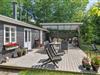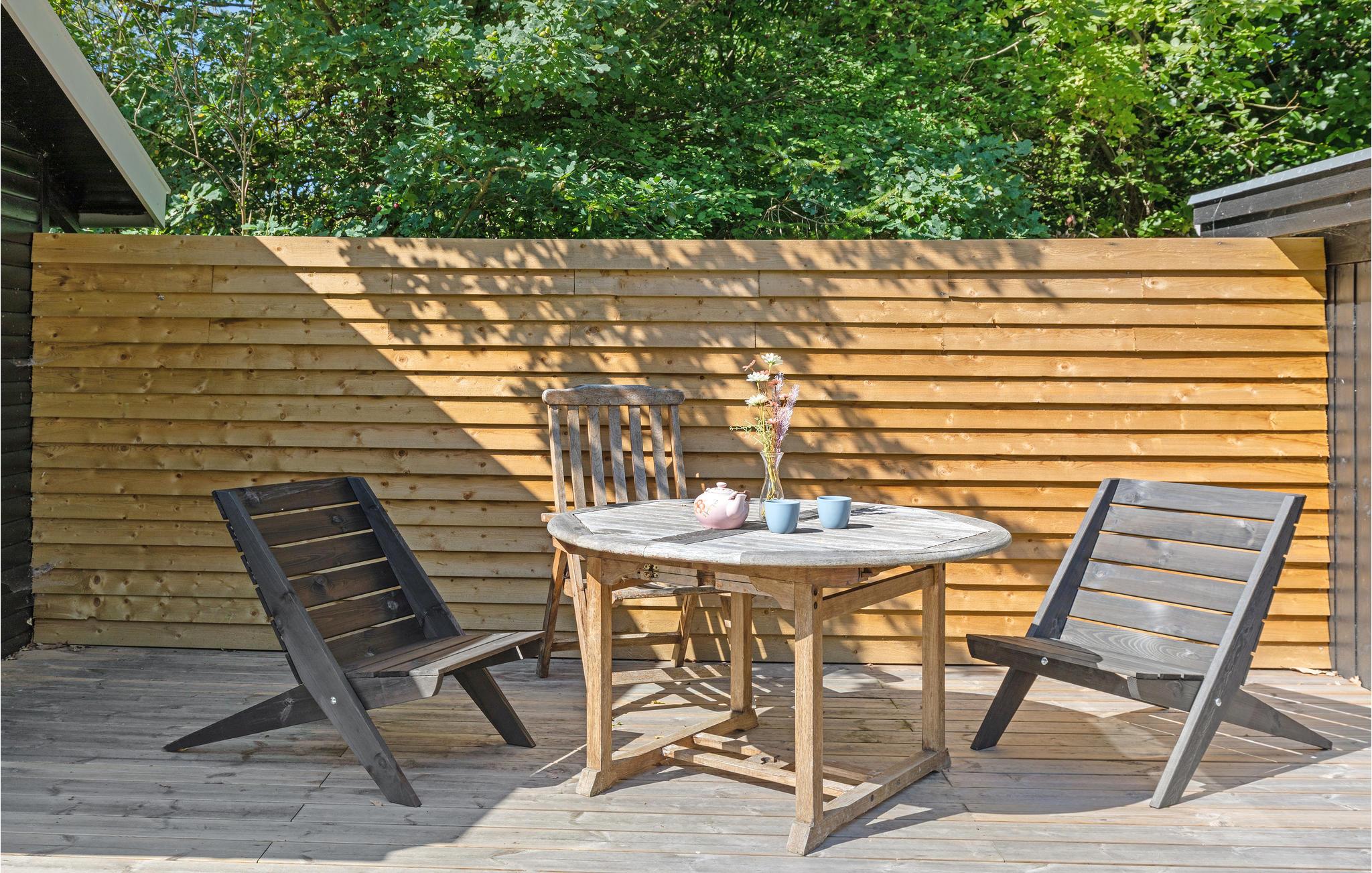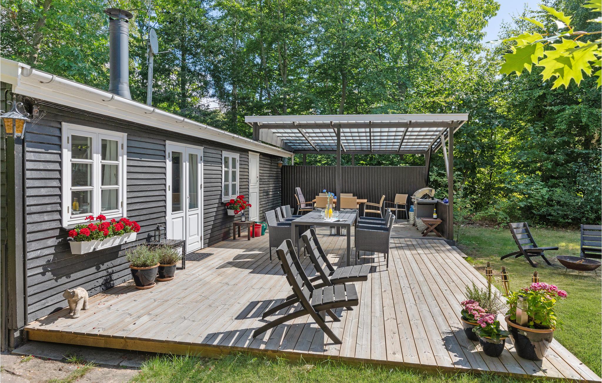 Fra stuen har I udgang til terrasseområdet, der byder på en stor overdækket fliseterrasse med havemøbler og stor grill, og en mindre åben terrasse med fliser samt en stor græsplæne, hvor der er mulighed for at nyde ferien i ro og mag. På grunden er der en stor trampolin, som kan bruges af legelystne børn og voksne, men på eget ansvar naturligvis. I det nærliggende anneks, finder I et stort soveværelse samt eget nyere badeværelse, og sommerhuset er derfor ideelt til f.eks. 2 vennepar eller en familie med teenagebørn. Der er en træterrasse imellem anneks og carport, et smukt og hyggeligt sted at indtage sin morgenkaffe i skønne omgivelser.