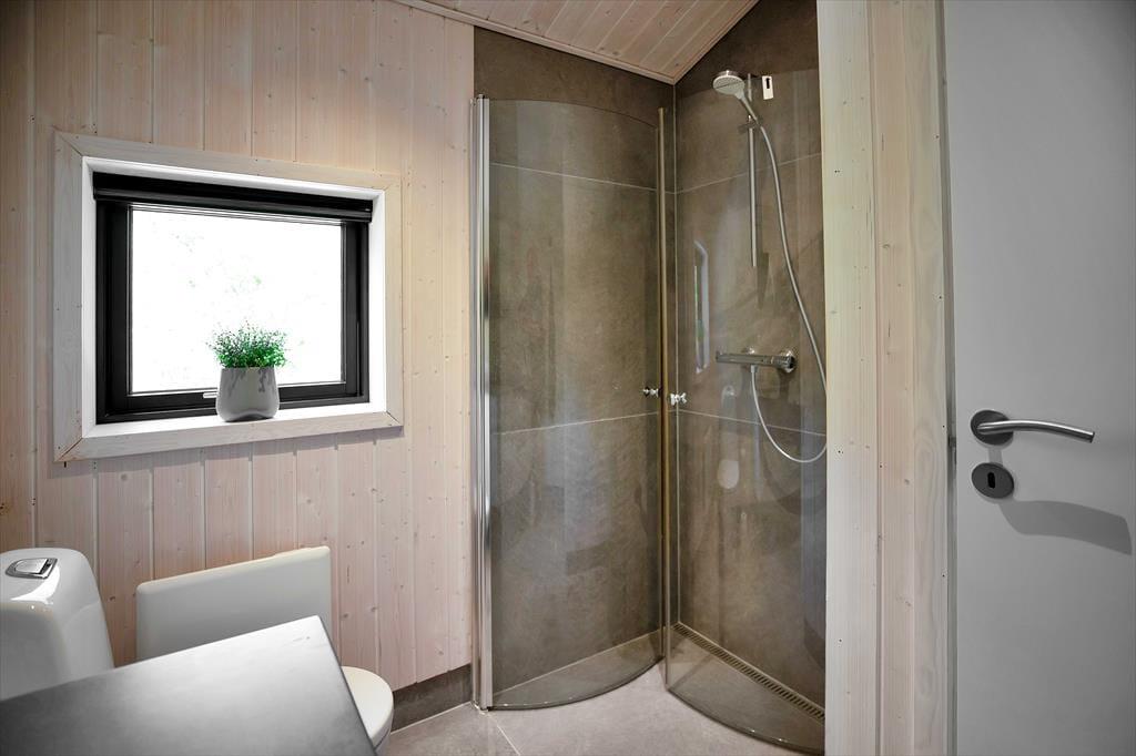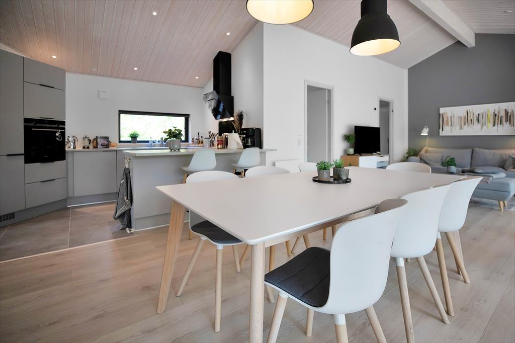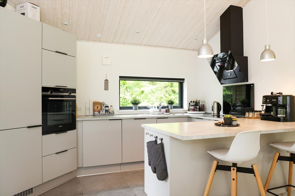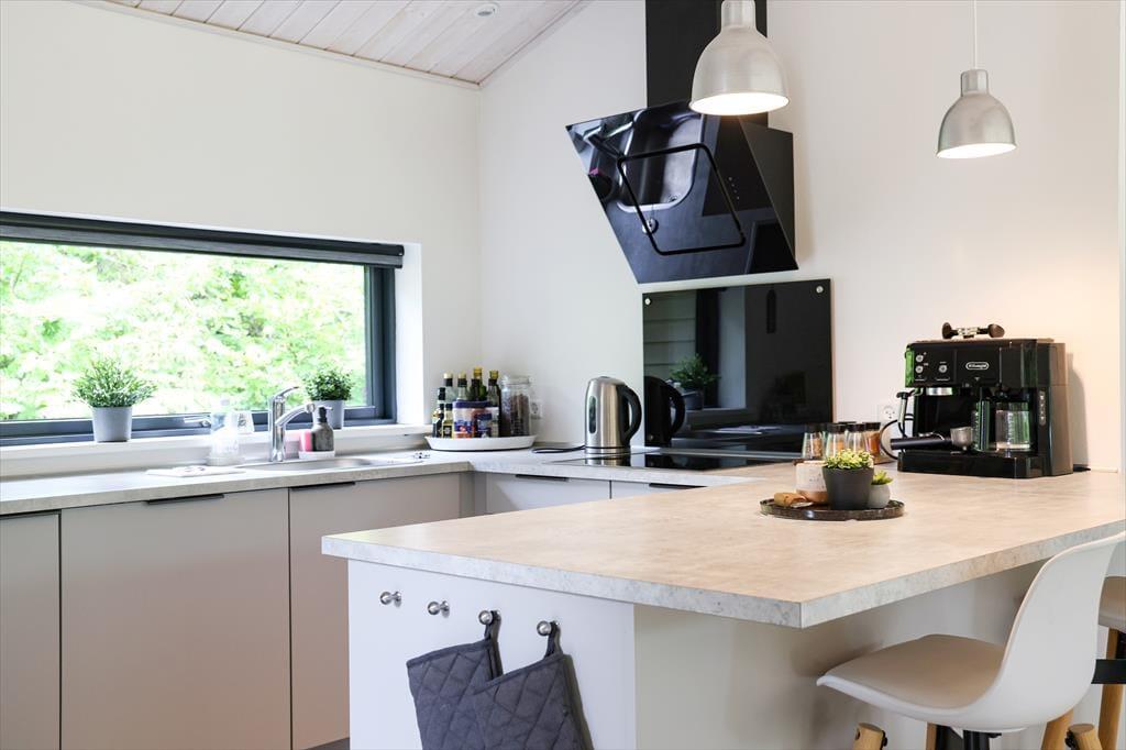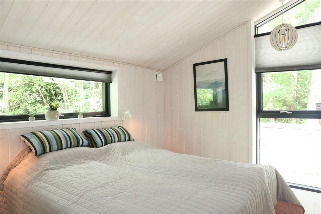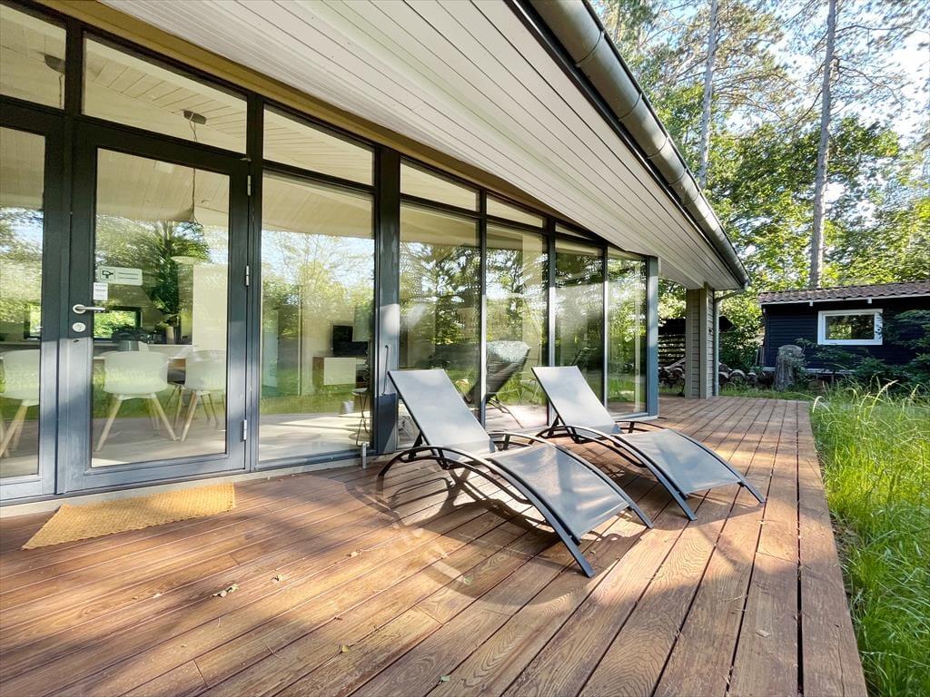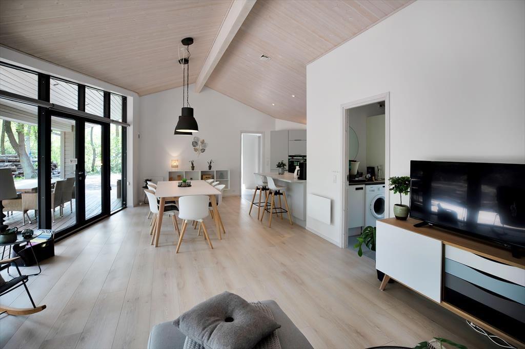 Sommerhuset er med gulvvarme i alle rum og indrettet således: Bryggers med vaskemaskine. 2 soveværelser med dobbelt senge og soveværelse med 2 enkeltsenge. Der tilhører også 2 lækre badeværelser, det ene med et dejligt spabad. Køkken/alrum i hvide elementer med alt i moderne udstyr, her kan man hjælpes om at tilberede en god frokost, køkkenet er i åben forbindelse med skøn stue, hvor du f.eks. kan slappe af med en latte. Fra stuen er der udgang til stor træterrasse der er opdelt i flere åbne og en overdækket afdeling, her kan I nyde solen fra morgen til aften samt komme et par gode bøffer på grillen. Haven er under etablering, græsset er på vej.