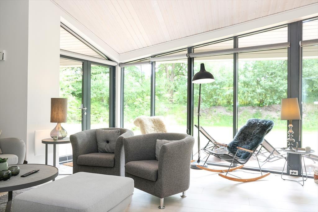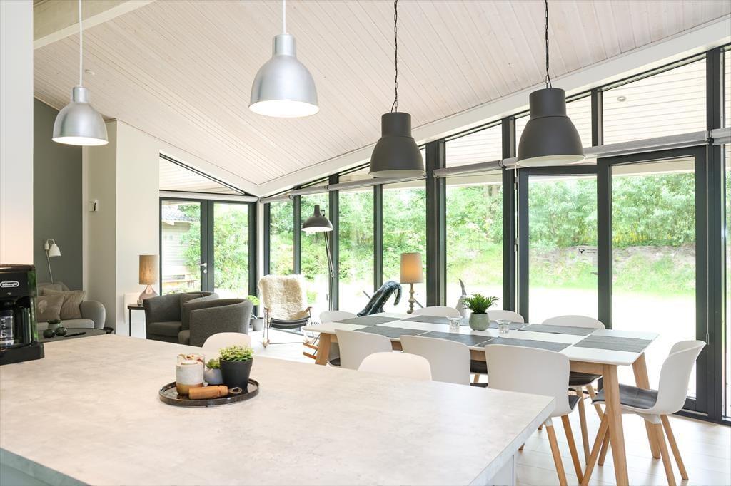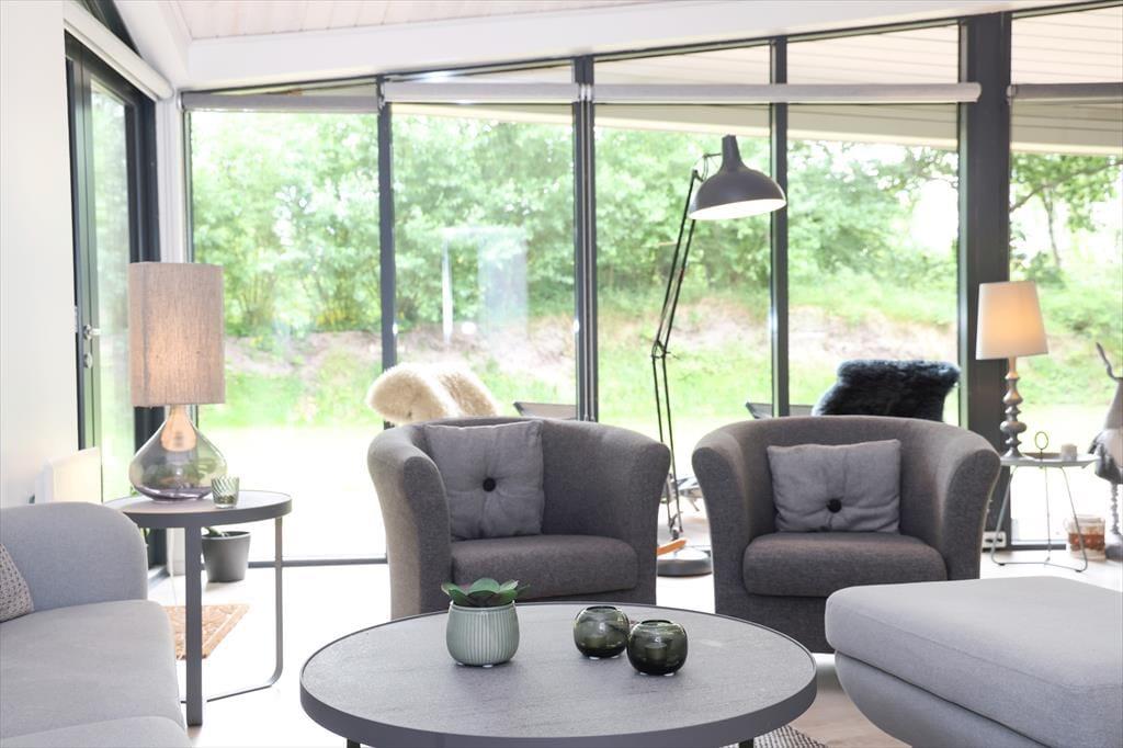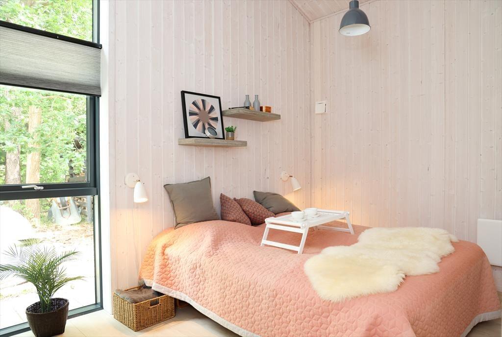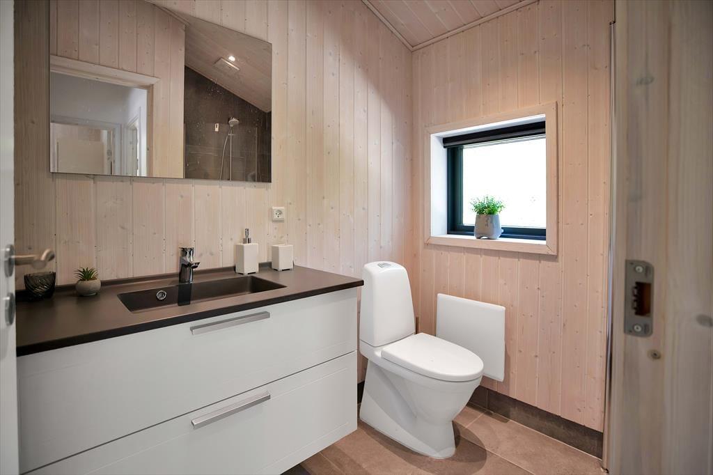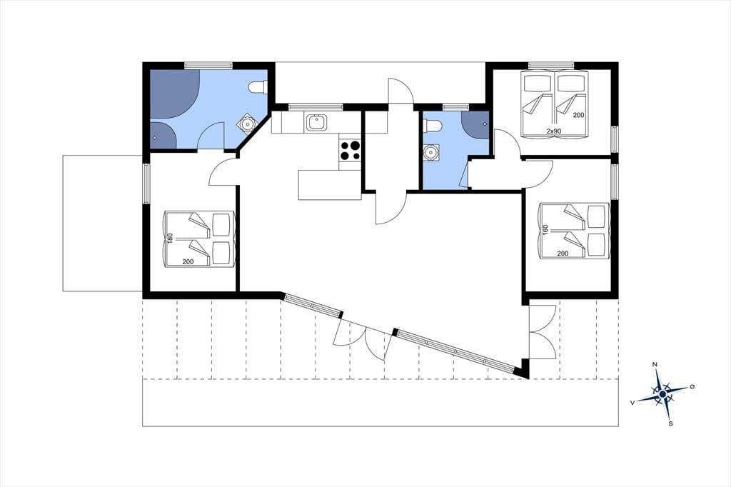 Sommerhuset er med gulvvarme i alle rum og indrettet således: Bryggers med vaskemaskine. 2 soveværelser med dobbelt senge og soveværelse med 2 enkeltsenge. Der tilhører også 2 lækre badeværelser, det ene med et dejligt spabad. Køkken/alrum i hvide elementer med alt i moderne udstyr, her kan man hjælpes om at tilberede en god frokost, køkkenet er i åben forbindelse med skøn stue, hvor du f.eks. kan slappe af med en latte. Fra stuen er der udgang til stor træterrasse der er opdelt i flere åbne og en overdækket afdeling, her kan I nyde solen fra morgen til aften samt komme et par gode bøffer på grillen. Haven er under etablering, græsset er på vej.