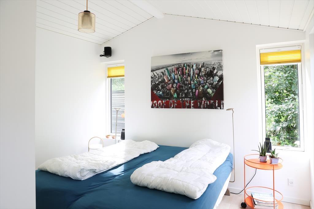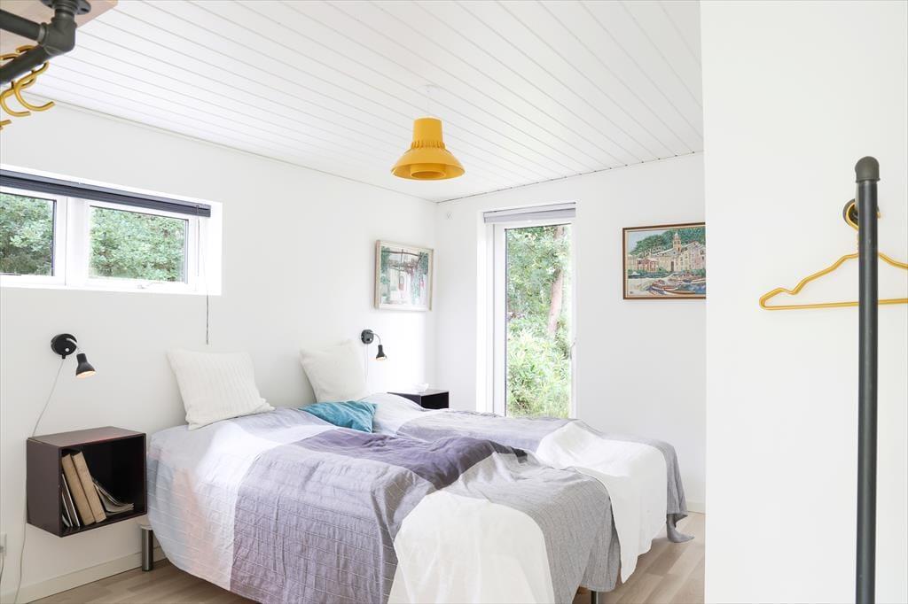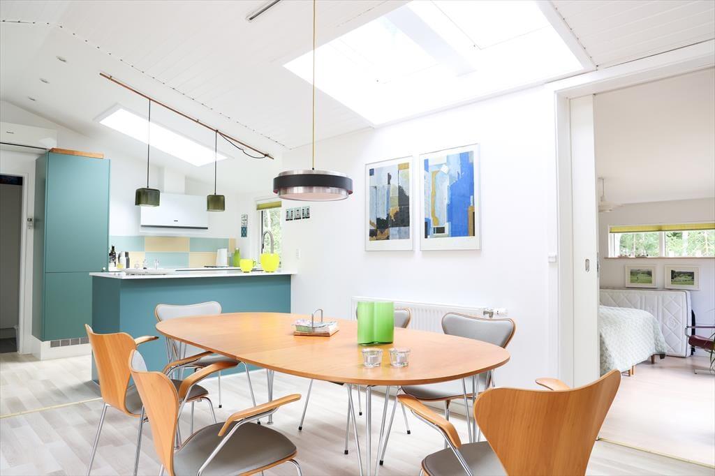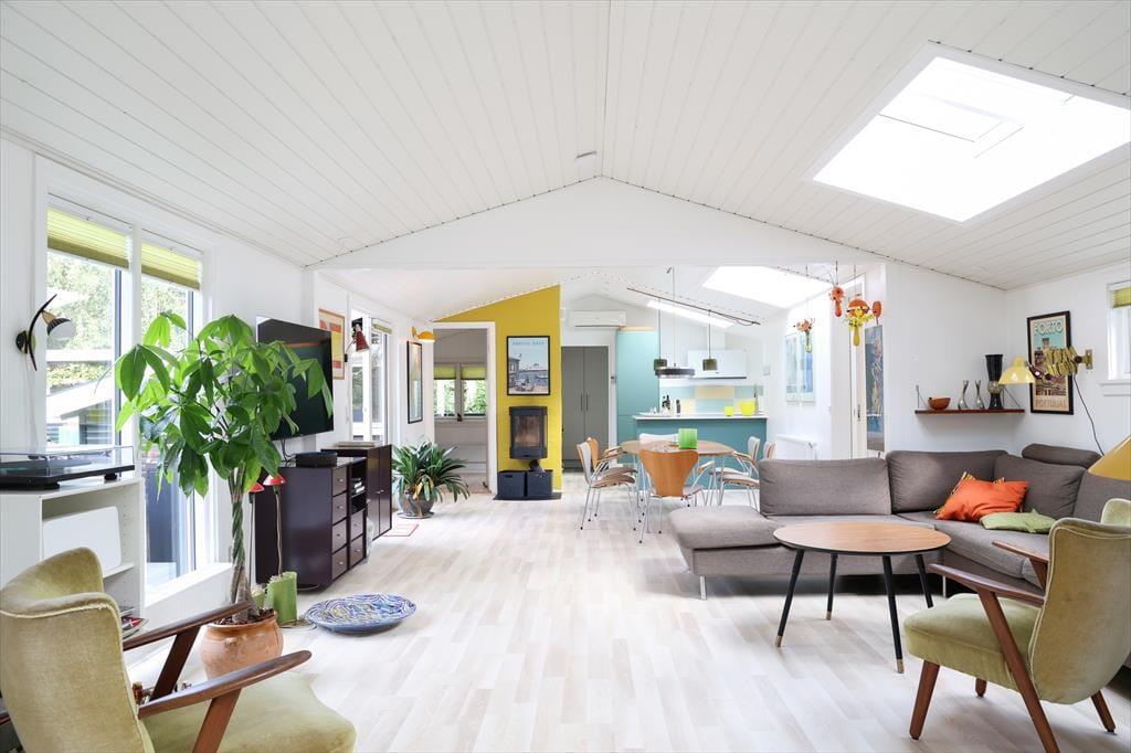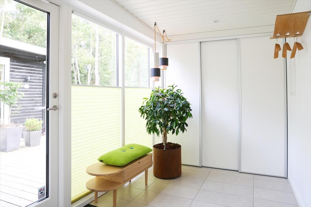 Indendørs fremstår sommerhuset lyst, indbydende og i moderne stil. Der er godt lysindfald i huset fra de store vinduer, især i stuen hvor der også er udgang til den store træterrasse. Såvel soveværelser som entré er rummelige i dette sommerhus. Sommerhusets hjerterum er den store stue hvor der er åben forbindelse til køkkenet. Det er her alle kan samles om bordet og nyde en lækker brunch inden dagens aktiviteter og samles om aftenen til aftenhygge med brætspil og gode historier. Sommerhusets rummelighed giver mulighed for familier at mødes på ferie og der er også 2 gode badeværelser i hver sin ende af huset.