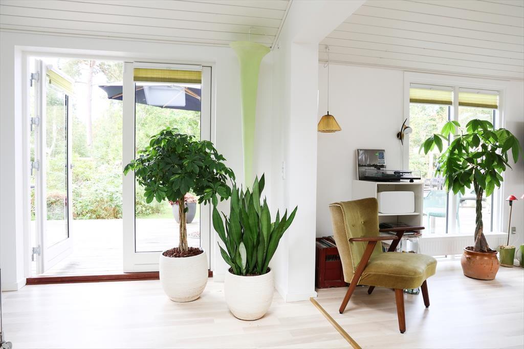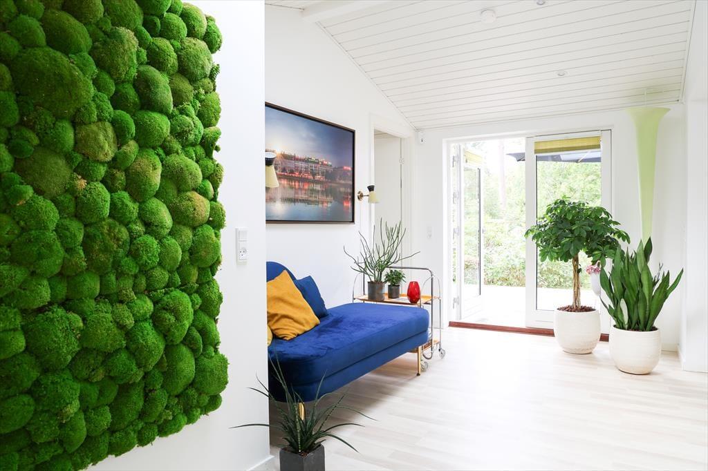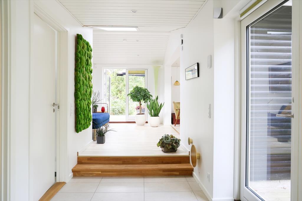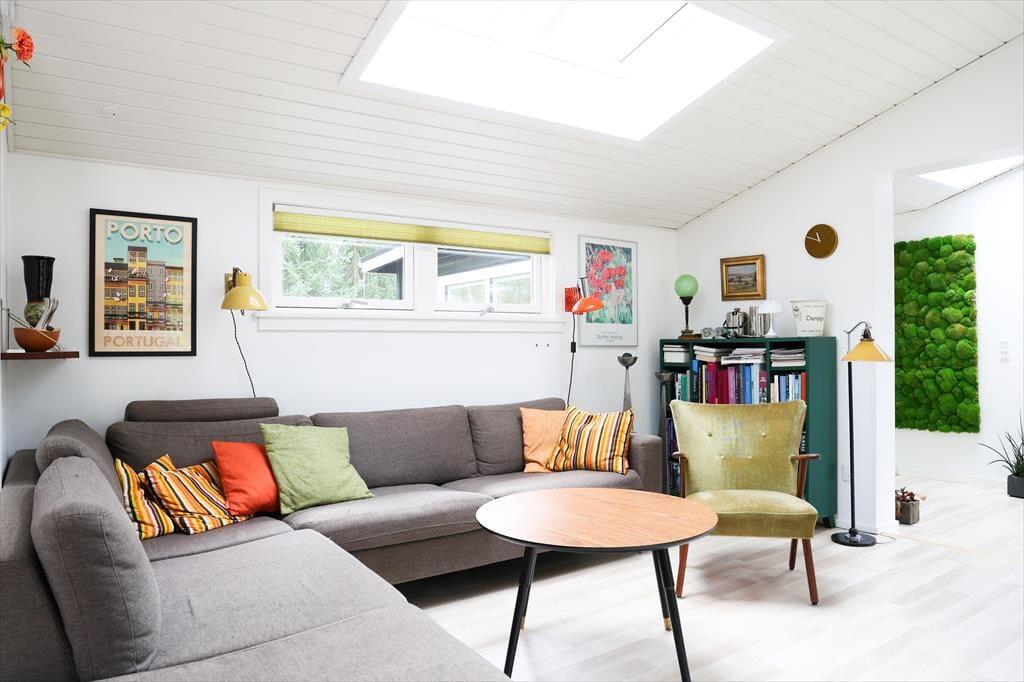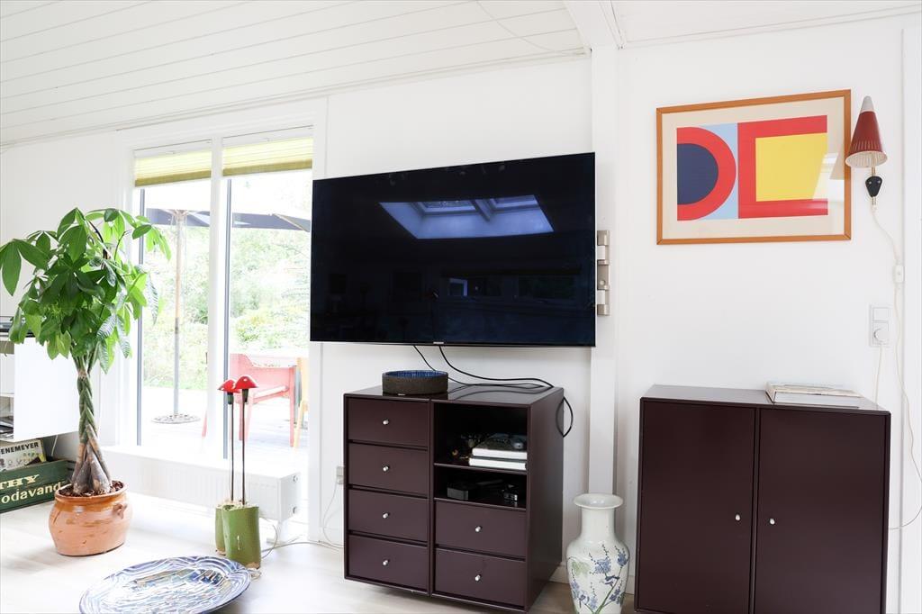 Indendørs fremstår sommerhuset lyst, indbydende og i moderne stil. Der er godt lysindfald i huset fra de store vinduer, især i stuen hvor der også er udgang til den store træterrasse. Såvel soveværelser som entré er rummelige i dette sommerhus. Sommerhusets hjerterum er den store stue hvor der er åben forbindelse til køkkenet. Det er her alle kan samles om bordet og nyde en lækker brunch inden dagens aktiviteter og samles om aftenen til aftenhygge med brætspil og gode historier. Sommerhusets rummelighed giver mulighed for familier at mødes på ferie og der er også 2 gode badeværelser i hver sin ende af huset.