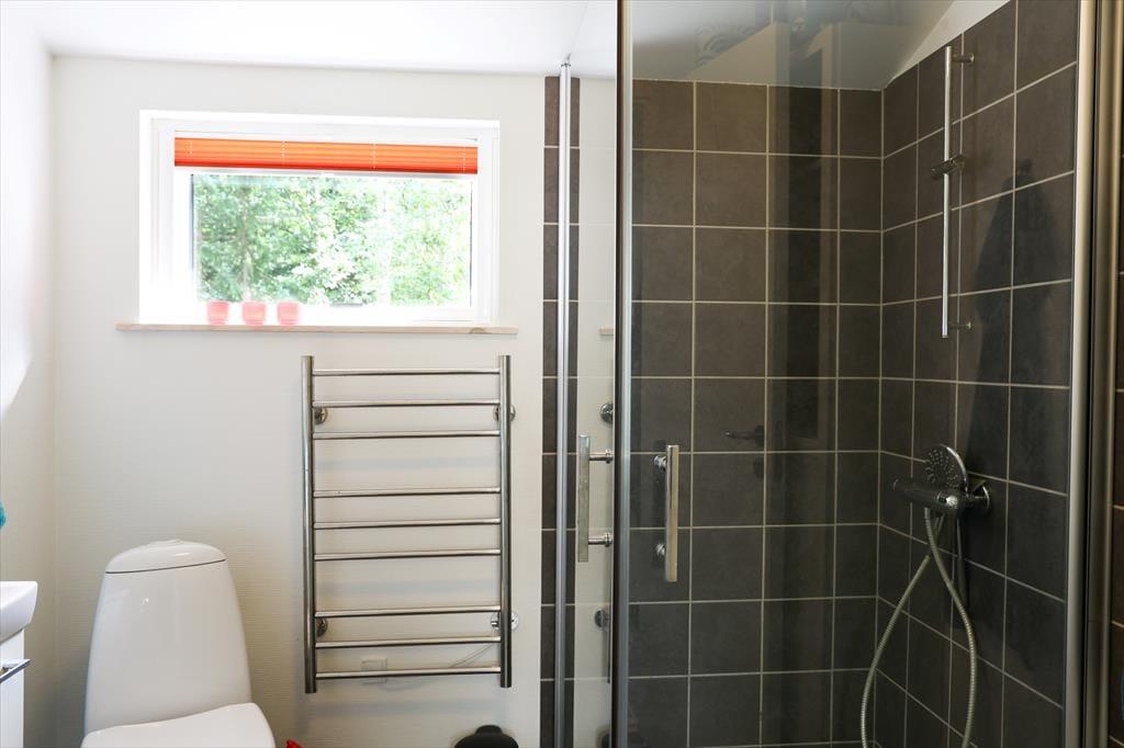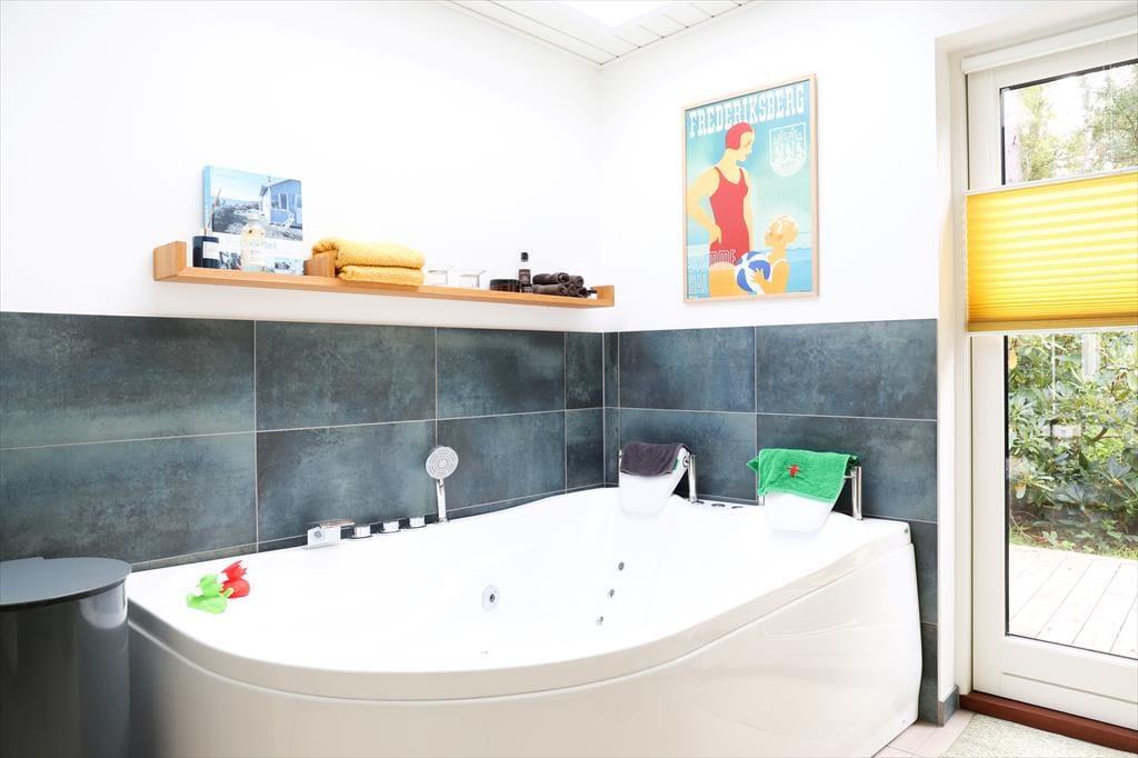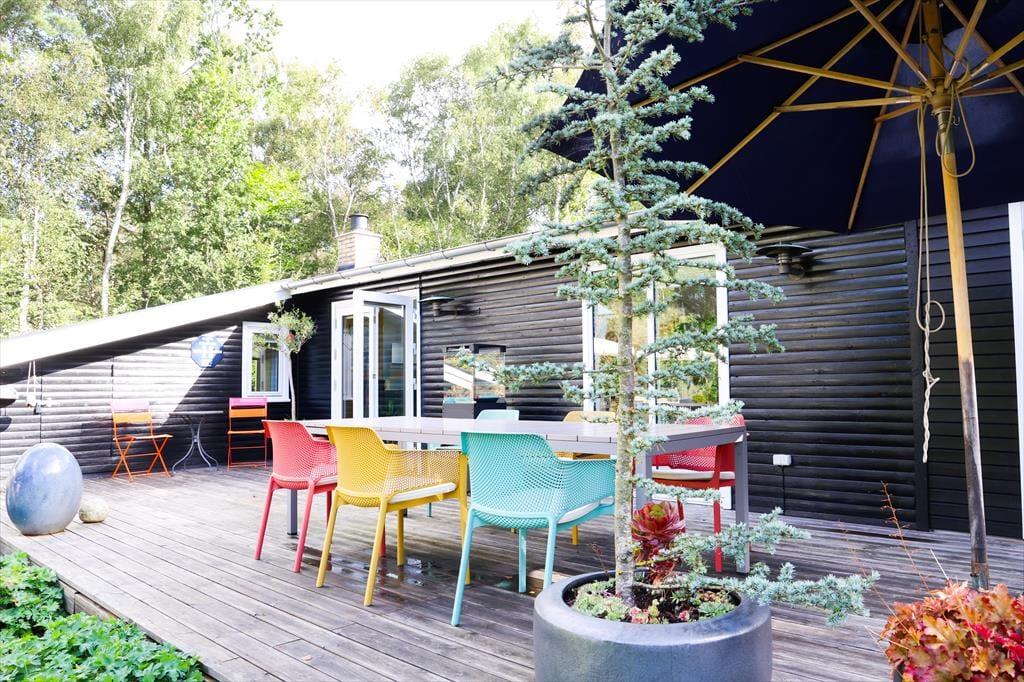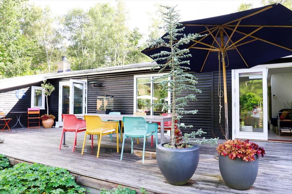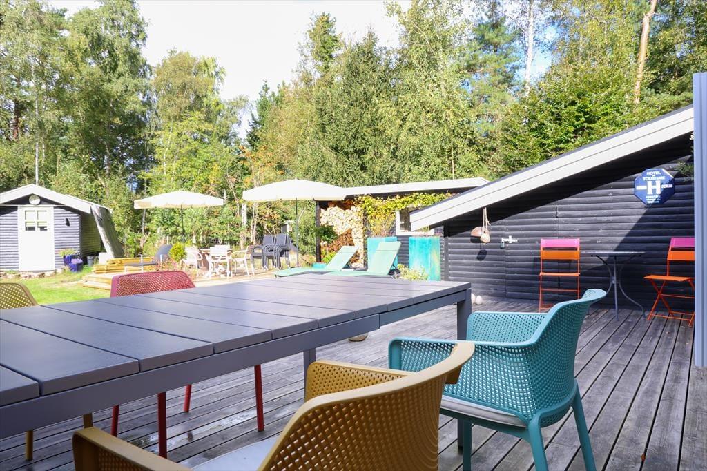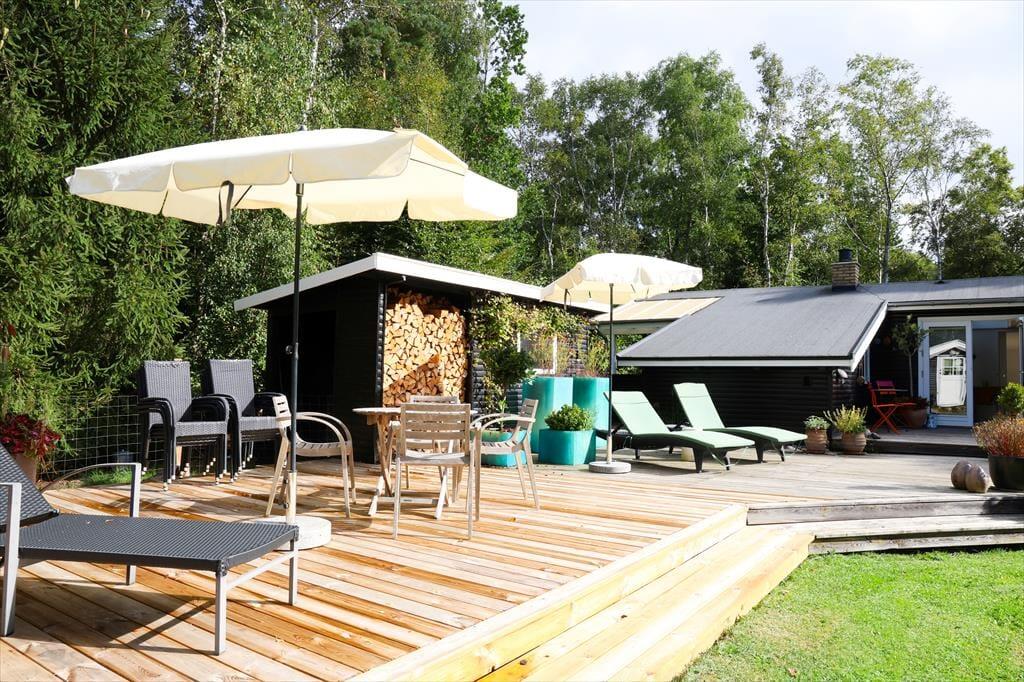 Udendørs kan sommerhusets store træterrasse nydes, her kan du ligge og slikke sol eller nyde en god bog imens børnene boltrer sig i haven med medbragte havespil. Der er på den syd- og vestvendte terrasse god plads til at alle kan samles til en god frokost, eller middag om aftenen. Sommerhusets store naturgrund er godt afskærmet så du og familien kan nyde jeres ferie i ugenerte omgivelser. Har du været nede at bade på den gode sandstrand, så kan du nemt skylle sandet af når du kommer tilbage til sommerhuset, der er nemlig udendørs bruser med både koldt og varmt vand.