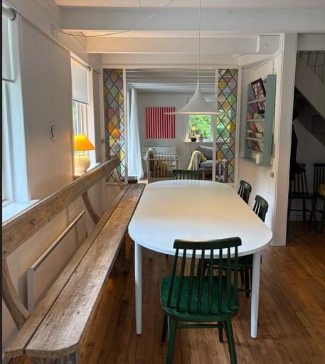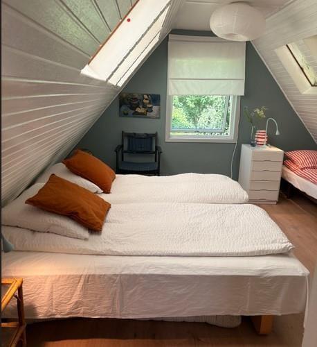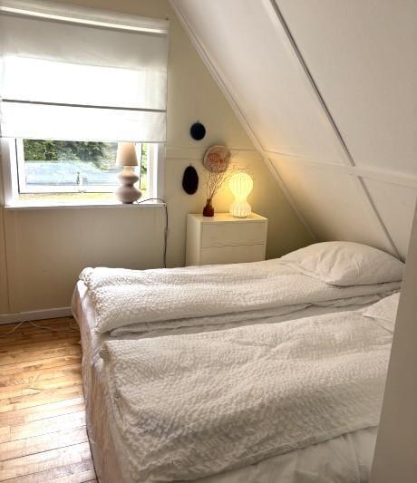 Sommerhusets hjerterum er den hyggelige stue hvor I samles om aftenen til aftenhygge med brætspil og gode historier. Stuen er i åben forbindelse til køkkenet, hvor I kan hjælpe hinanden med at tilberede en god frokost eller samles om bordet og nyde en lækker brunch inden dagens aktiviteter planlægges. På 1. sal er der soveafdeling med to dejlige værelser.