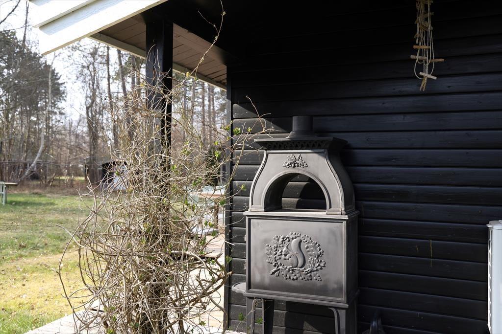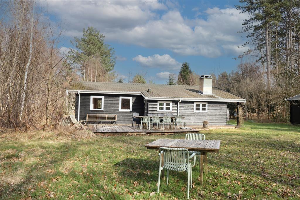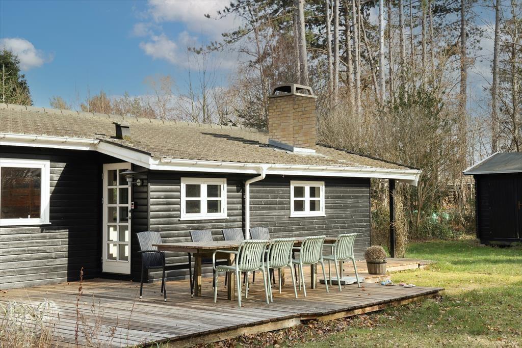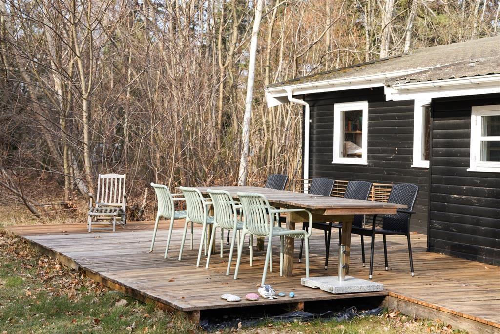 Udendørs kan sommerhusets store træterrasse nydes, her kan du ligge og slikke sol eller nyde en god bog imens børnene boltrer sig i haven med medbragte havespil. Der er på den store terrasse plads til, at alle kan samles til en god frokost, eller middag om aftenen. Sommerhusets store have er godt afskærmet så du og familien kan nyde jeres ferie i fredelige omgivelser. Når du har været nede at bade på den gode sandstrand, er det skønt bare at slænge dig på terrassen og lytte til fuglenes sang eller se på et rådyr der passerer forbi.