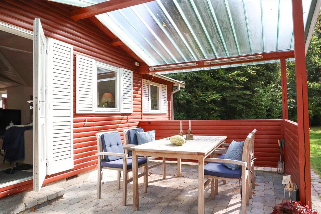 Udendørs kan sommerhusets store træterrasse nydes, her kan du ligge og slikke sol eller fordybe dig i en god bog imens børnene boltrer sig i haven med medbragte havespil. Der er også plads til, at alle kan samles til en god frokost, eller middag om aftenen på den overdækkede afdeling. Sommerhusets store have er godt afskærmet så du og familien kan nyde jeres ferie i fredelige omgivelser. Når du har været nede at bade på den gode sandstrand, er det skønt bare at slænge dig på terrassen og lytte til fuglenes sang eller se på et rådyr der passerer forbi.