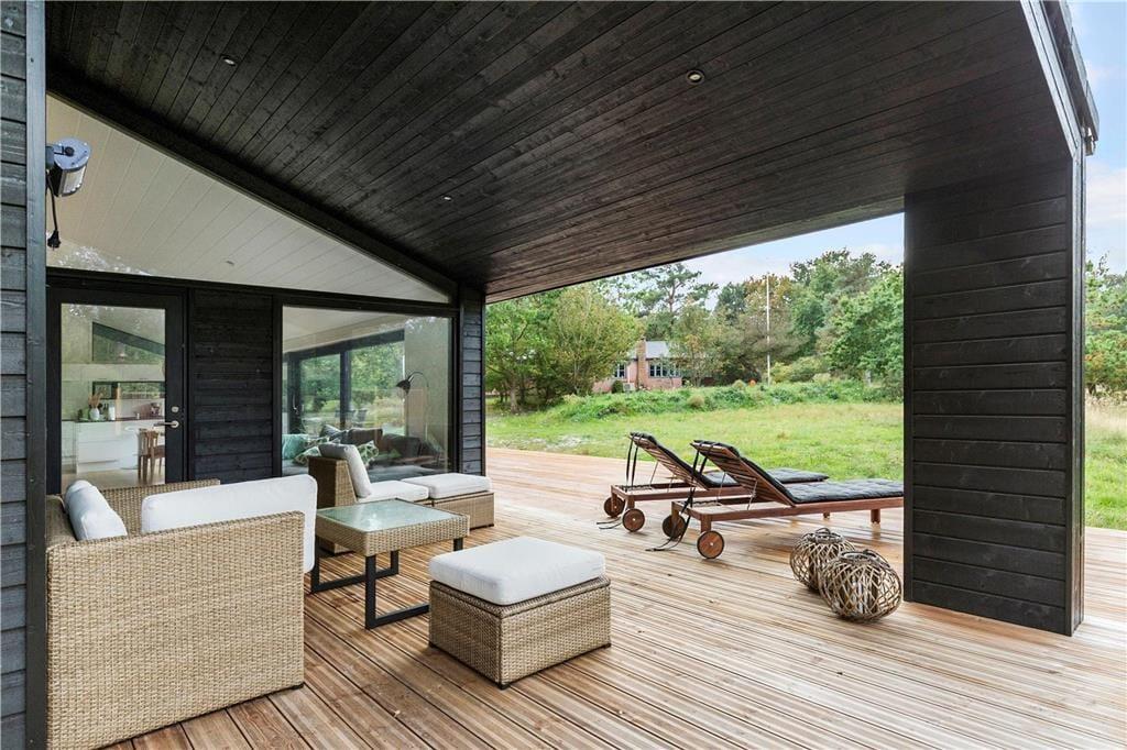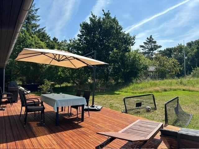 På den store, skønne terrasse, kan du nyde solen fra morgen til aften eller være heldig at se et rådyr gå forbi. Efter en dejlig dag på stranden så husk at skylle dig af under udebruseren, der både har varmt og koldt vand. Børnene vil sætte stor pris på trampolinen og klatrestativet