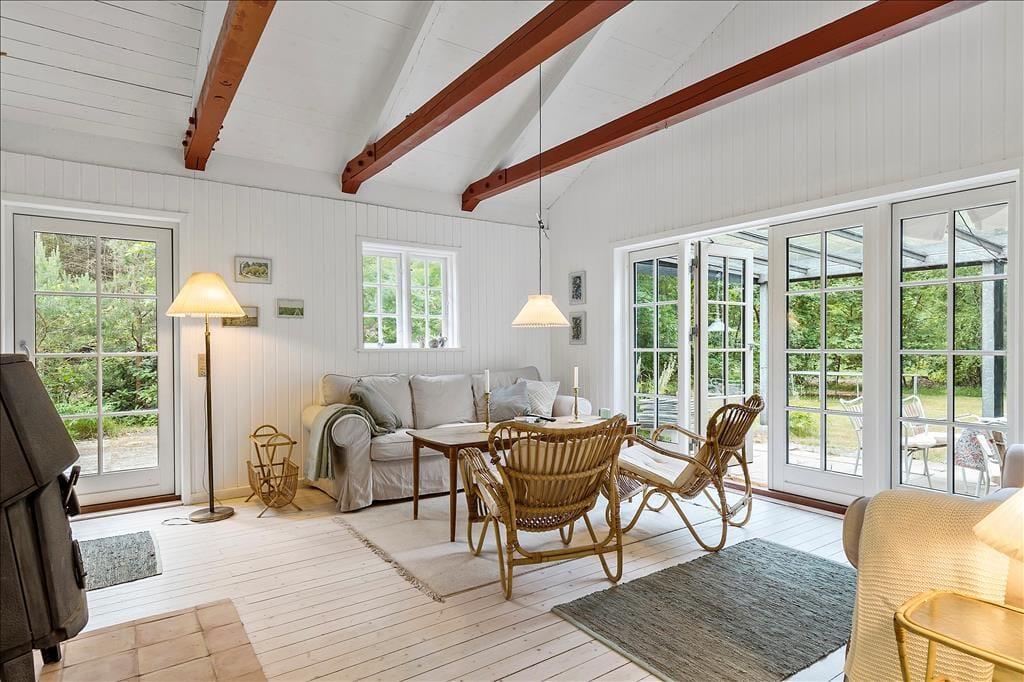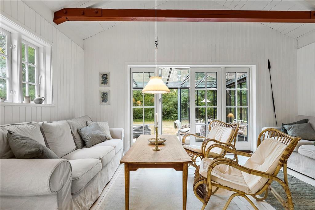 Huset indeholder stor stue, køkken/alrum på 55 m2, med direkte adgang til den overdækkede terrasse. Fra stuen er der også udsigt til den charmerende have, hvor rådyrene jævnligt krydser. Der er 4 gode soveværelser de to med køjesenge og de to andre med dobbeltsenge samt god skabsplads. Køkkenet er åbent og indeholder opvaskemaskine. Fra køkkenvinduet, kan du servere eftermiddagskaffen direkte ud på den hyggelige gårdterrasse. Huset indeholder desuden badeværelse med brus, separat toilet og udendørs bruser.