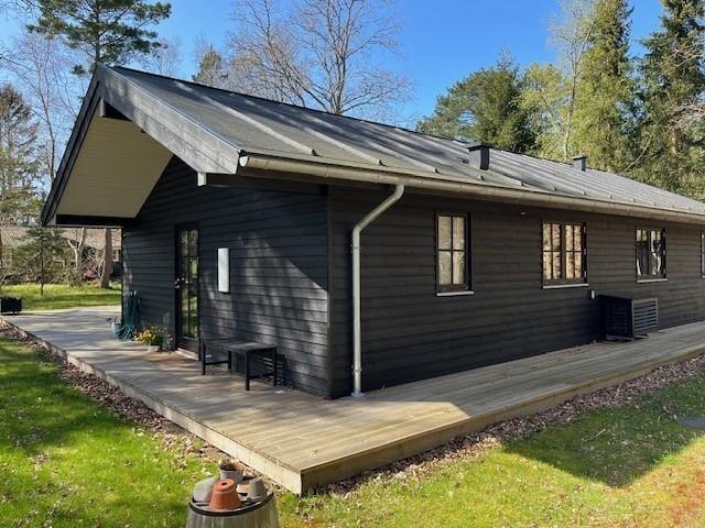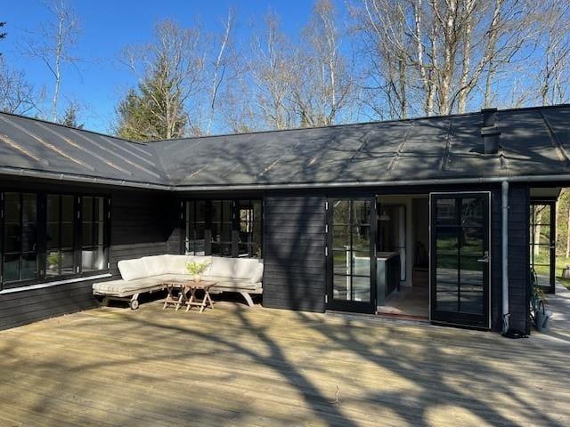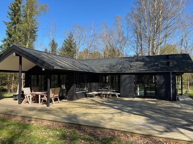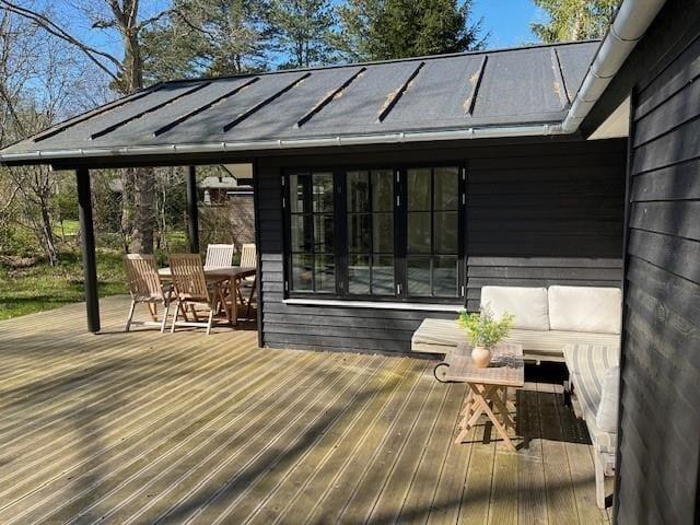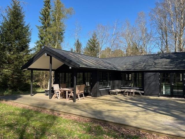 Udendørs er der rig mulighed for at slappe af og nyde solen på sommerhusets store syd og vestvendte træterrasse, hvor du både kan sidde og læse en god bog eller bare ligge og nyde solen på en af husets liggestole. Her er også en overdækning så det er muligt at søge skygge for solen, eller forlænge aftenen udendørs når duggen falder. På den store grund er der også rig mulighed for at hygge sig med medbragte havespil. Hvis du en dag har lyst til en picnic-tur, er der mange gode steder hvor madpakken kan nydes, hvad enten du er i bil, på cykel eller til fods.