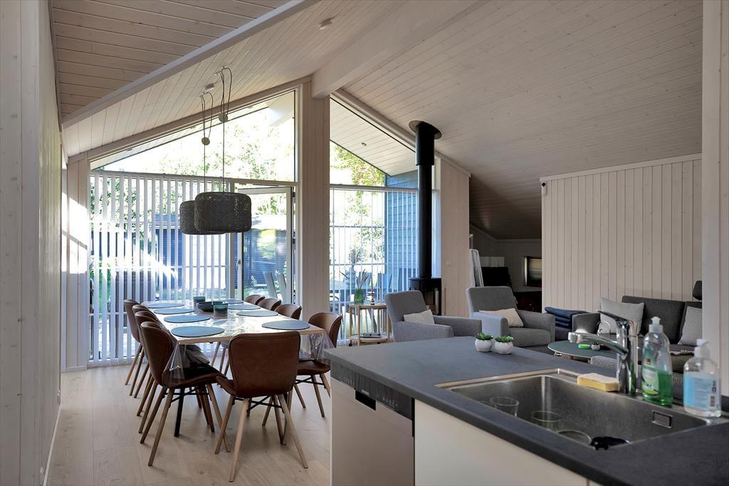 Skøn stue med god spiseafdeling og mulighed for både afslapning og hygge. I stuen, med tilhørende alkove, kan du fordybe dig i en god bog eller nyde en latte. Hvis ikke du foretrækker at slå dig ned på den store, skønne terrasse, hvor du både kan nyde solen fra morgen til aften eller bare opleve stilheden. l det dejlige Køkken med godt lysindfald er der bl.a. opvaskemaskine og mulighed for at tilberede en god frokost. Der er 2 lækre badeværelser med brus. Og tre gode soveværelser, det ene med dobbeltseng, det andet med to enkeltsenge, det tredje med enkeltseng og køjeseng. NB! Der er nu græs på grunden.