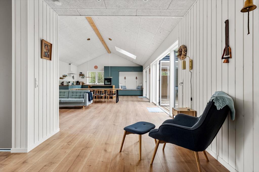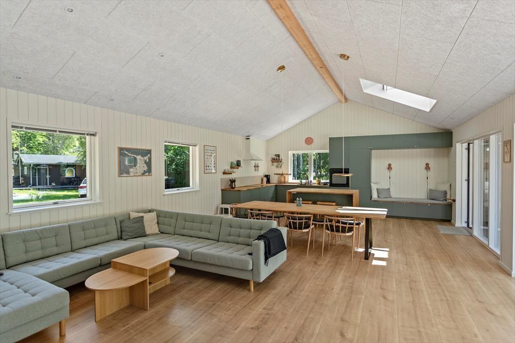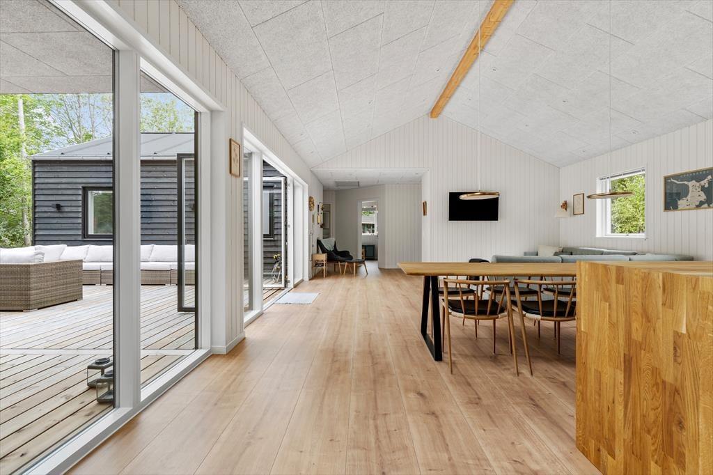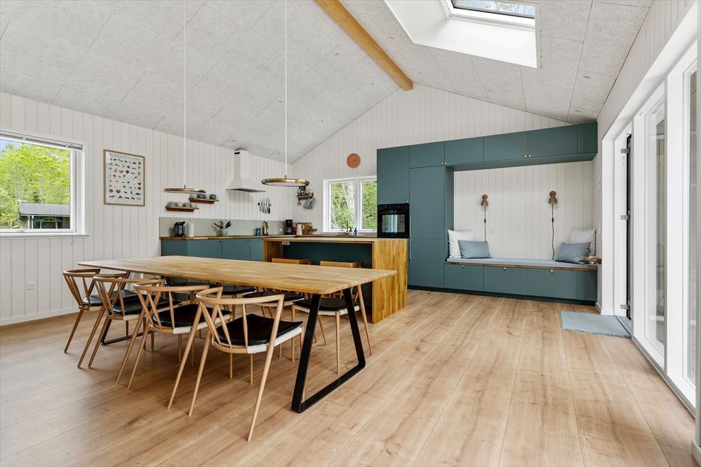 Indendørs fremstår sommerhuset lyst, indbydende og i moderne stil. Der er godt lysindfald i huset fra de store vinduer, især i det store køkken/alrum hvor der også er udgang til den store træterrasse. Det er også det store køkken/alrum der er sommerhusets hjerterum. Det er her alle kan samles om bordet og nyde en lækker brunch inden dagens aktiviteter, og samles om aftenen til aftenhygge med brætspil og gode historier. Sommerhusets rummelighed og 2 gode badeværelser giver mulighed for flere familier at mødes på ferie.