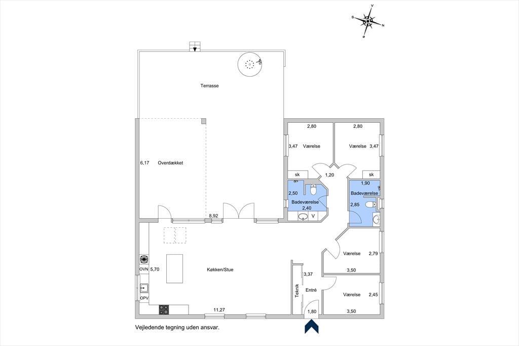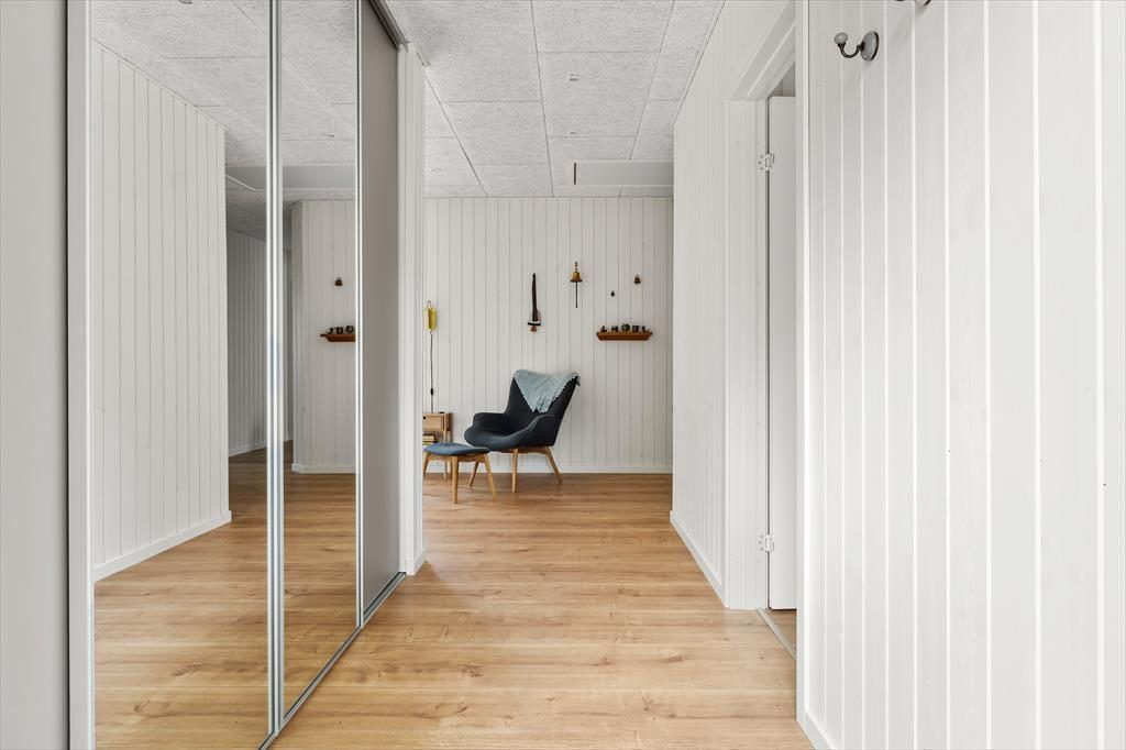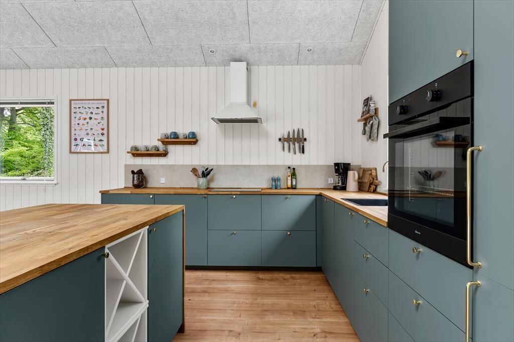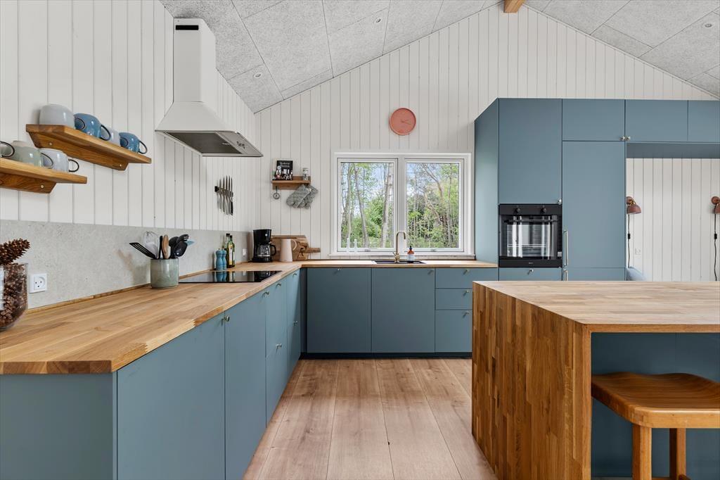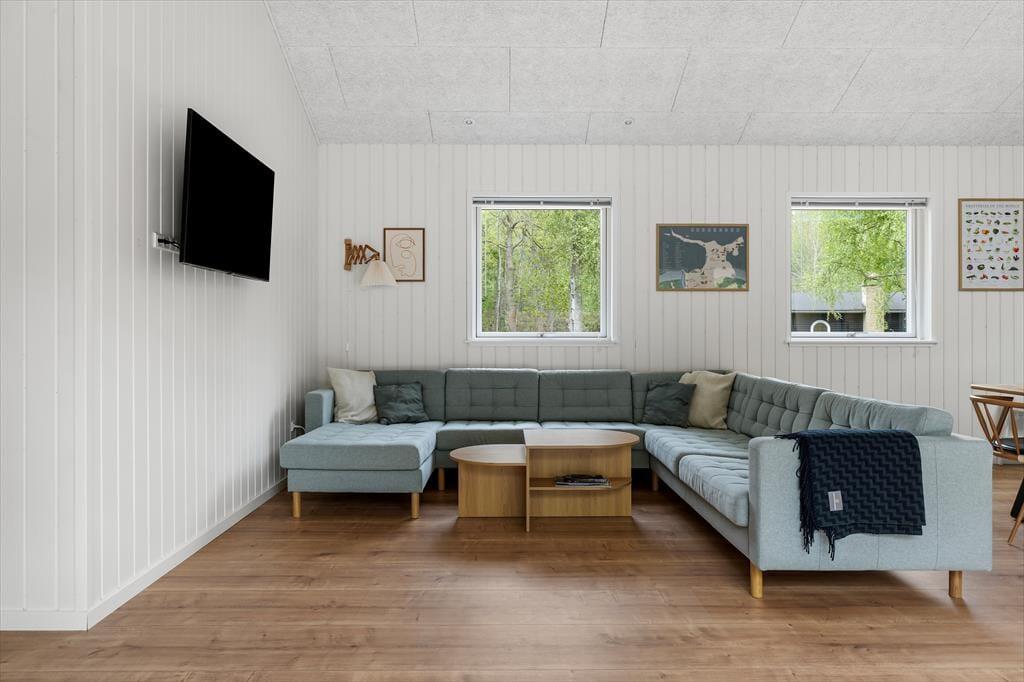Indendørs fremstår sommerhuset lyst, indbydende og i moderne stil. Der er godt lysindfald i huset fra de store vinduer, især i det store køkken/alrum hvor der også er udgang til den store træterrasse. Det er også det store køkken/alrum der er sommerhusets hjerterum. Det er her alle kan samles om bordet og nyde en lækker brunch inden dagens aktiviteter, og samles om aftenen til aftenhygge med brætspil og gode historier. Sommerhusets rummelighed og 2 gode badeværelser giver mulighed for flere familier at mødes på ferie.