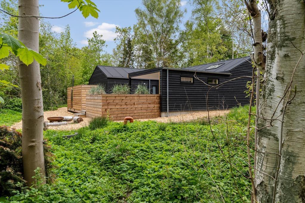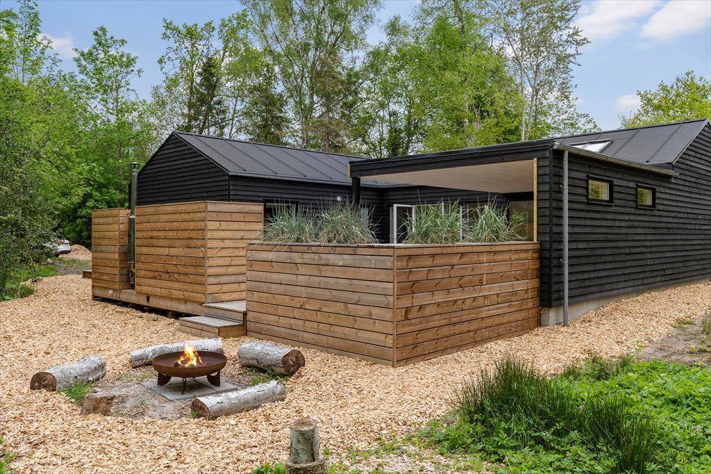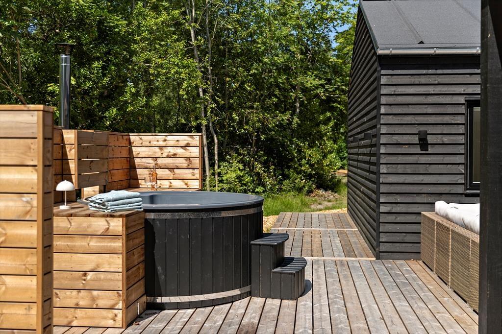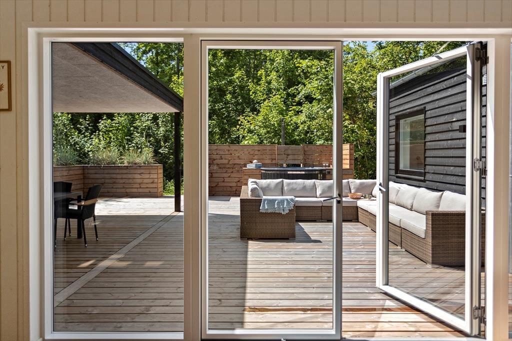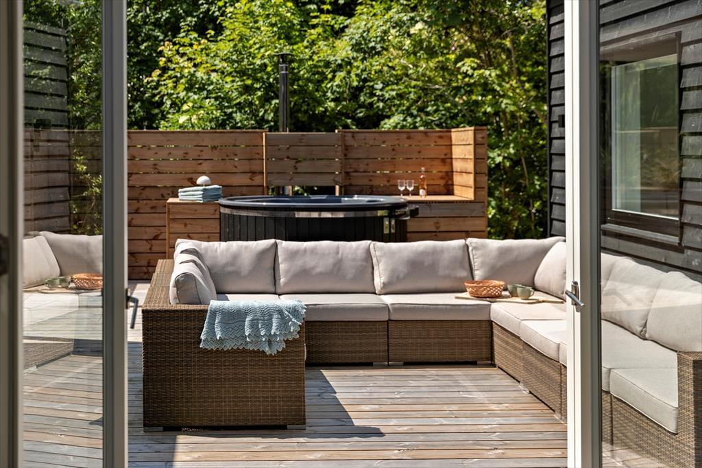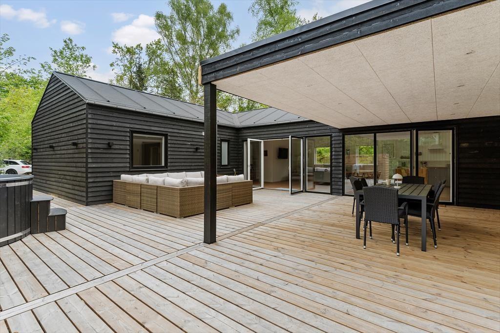Udendørs kan sommerhusets store træterrasse nydes, her kan du ligge og slikke sol eller nyde en god bog. Der er på den store vestvendte terrasse god plads til at alle kan samles til en god frokost, eller middag om aftenen, hvorefter der kan hygges i vildmarksspaen. Du kan fra huset gå direkte ud på den overdækkede del af terrassen, så selv om det skulle regne eller duggen falder kan du sagtens sidde ude.