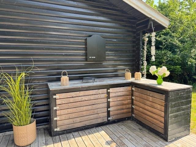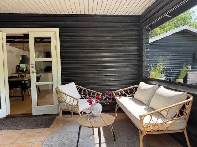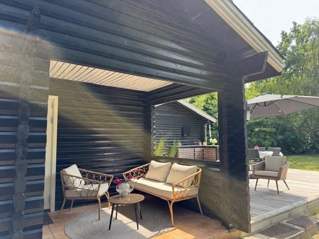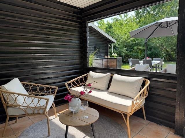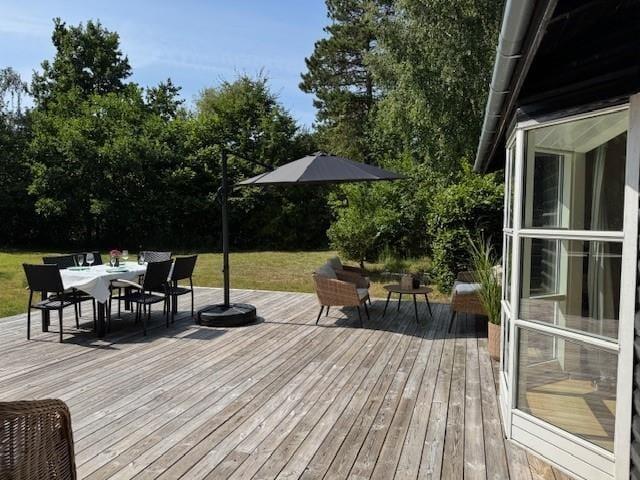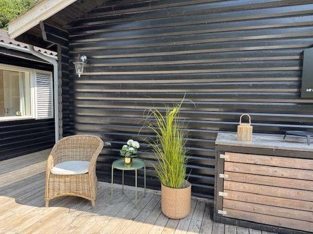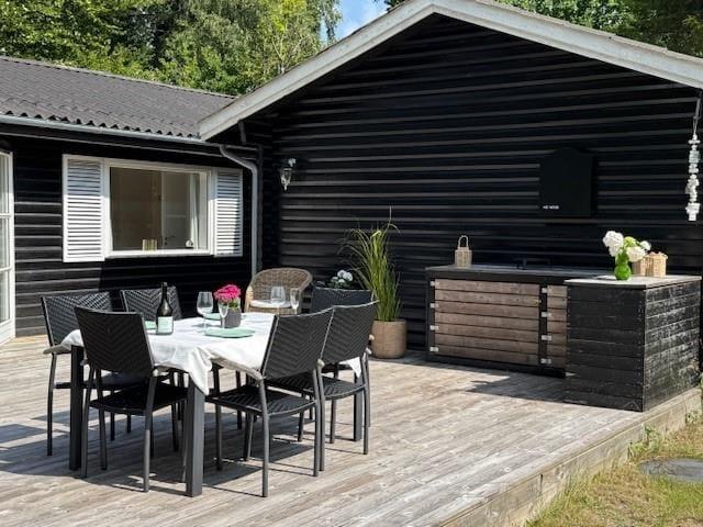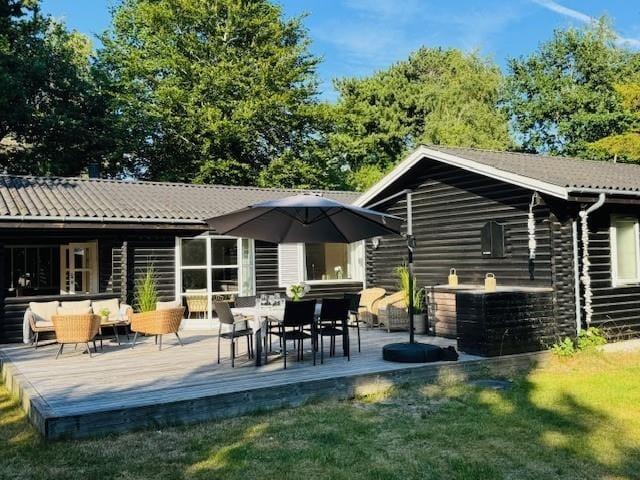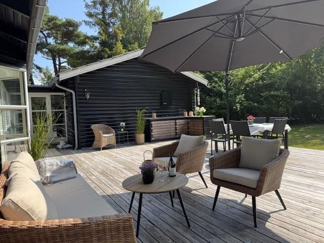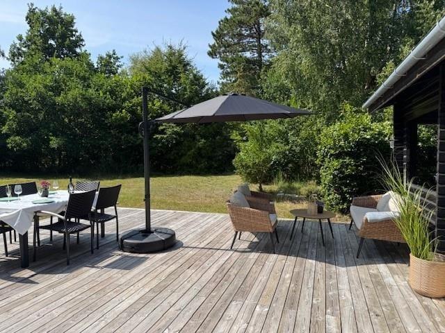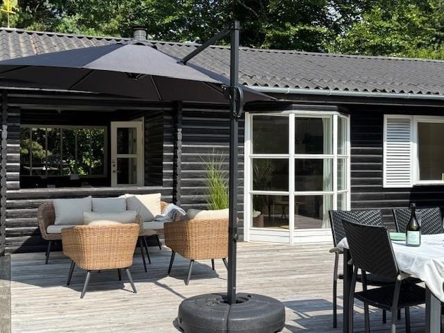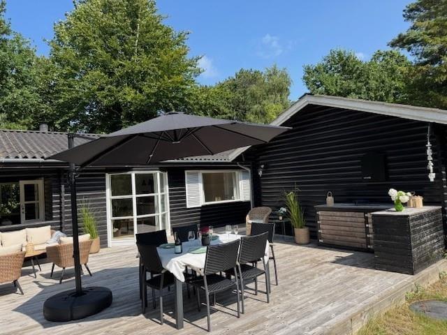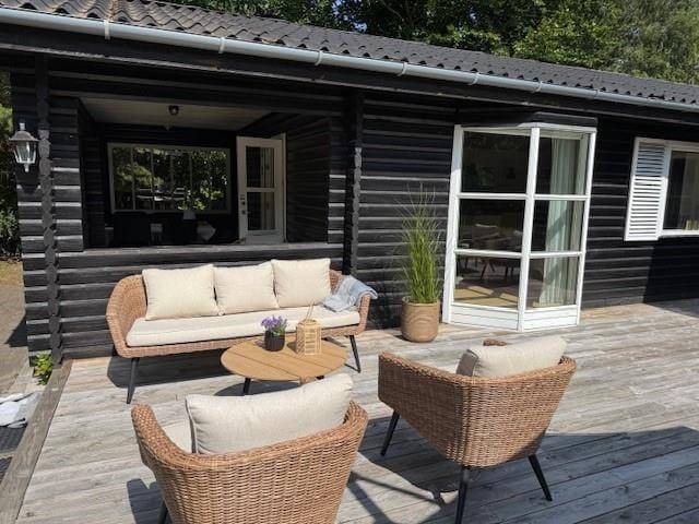 Huset emmer af ro og afslapning med flere hyggekroge og små loungeområder, både inde og ude. Indretningen er smagfuld og gennemført, med rolige farver, brug af træ og fokus på komfort, afslapning og kvalitet. Huset har stor udendørs træterrasse på 60 KM har stor spiseplads, udelounge med blød sofa og stole, solbadningsplads med liggestole, stor flytbar parasol og en ude-bar med dart. Huset har også en overdækket terrasse med læ, hvor der både er en dejlig spiseplads og endnu et loungeområde med bløde stole og sofa. Som ekstra forkælelse kan huset tilbyde ny Morsø udepejs, der kan fungere både som bålhygge og varmekilde, og som pizzaovn (på brænde, der skal tilkøbes).