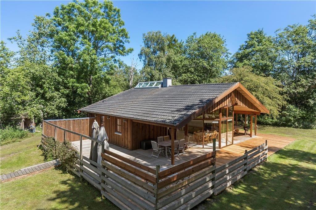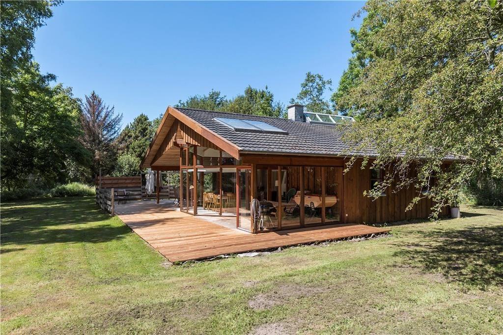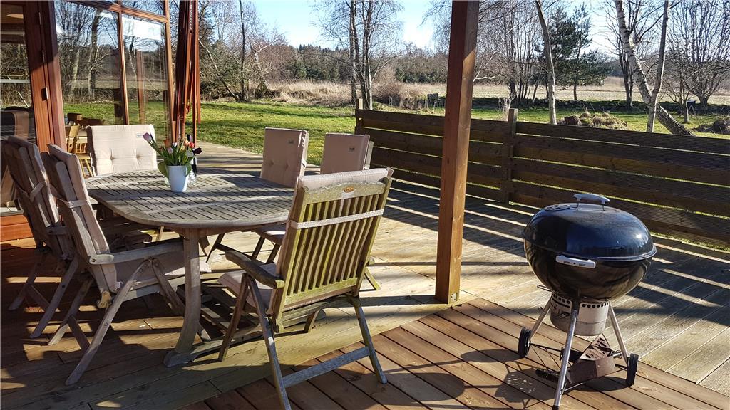 Med afskærmning af den store terrasse hele tre steder, finder du altid et godt sted i læ for vinden at indtage formiddagskaffen eller frokosten, samt forberede grillmaden fra den udendørs grill til aftensmåltidet. Den store grund er omkranset af træer og ligger ud til en åben mark med grantræer, og selvom huset ligger på en hjørnegrund ud til offentlig vej – Bystedvej - er det begrænset, hvad du oplever af trafik herfra.