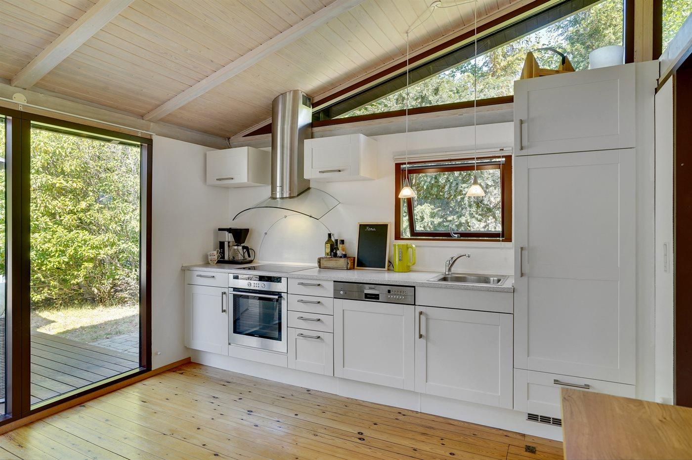 Køkkenet er udstyret med 1 køleskab. Der er 4 keramiske kogeplader, varmluftovn samt opvaskemaskine.