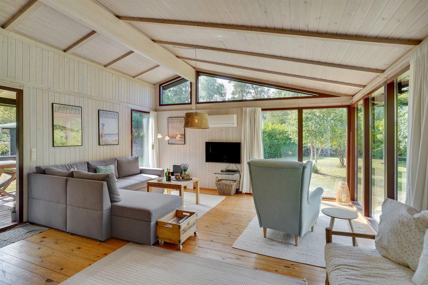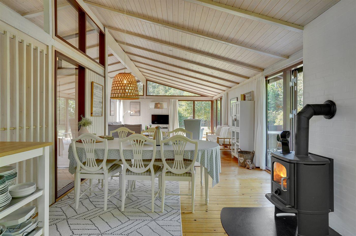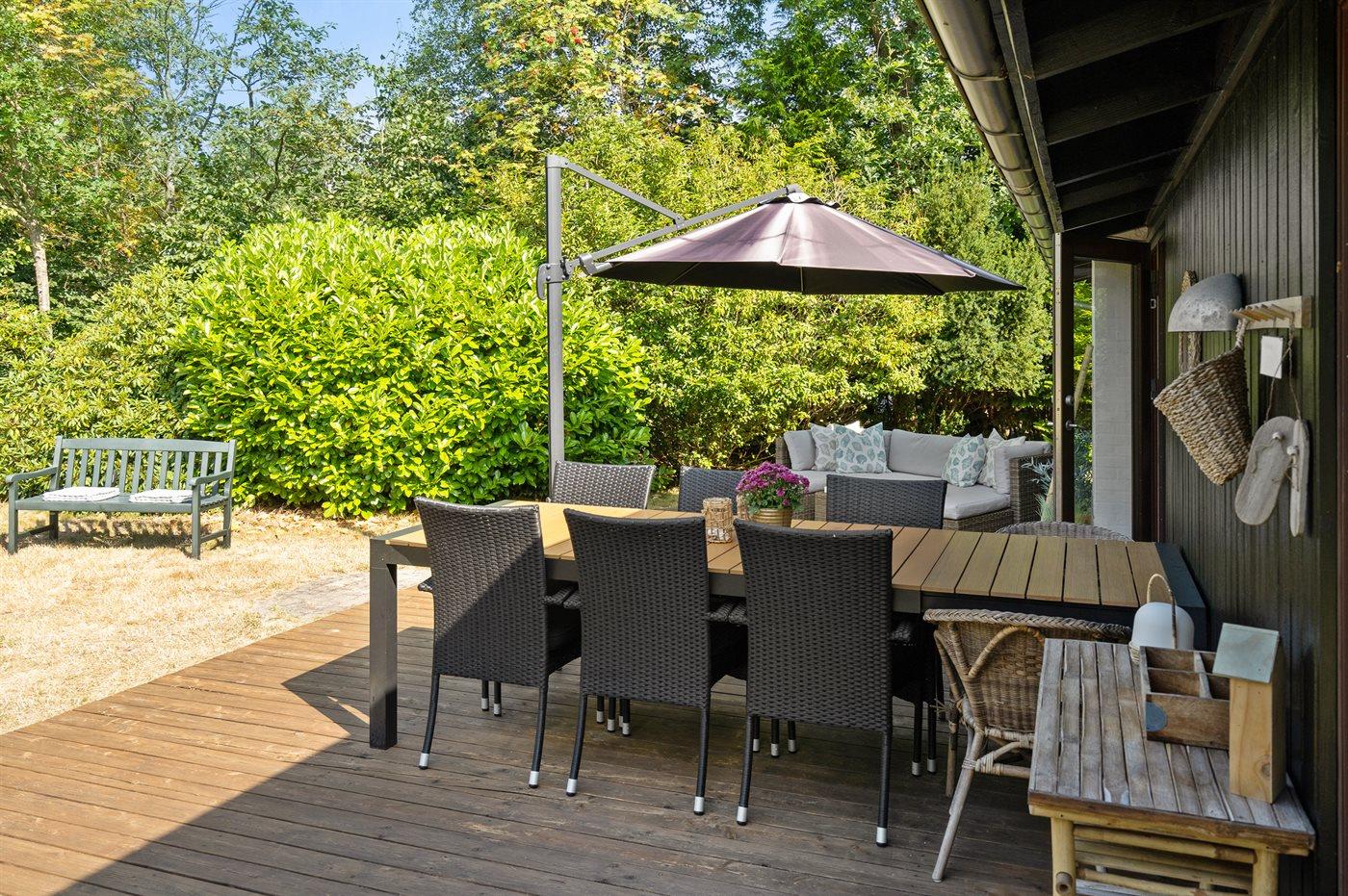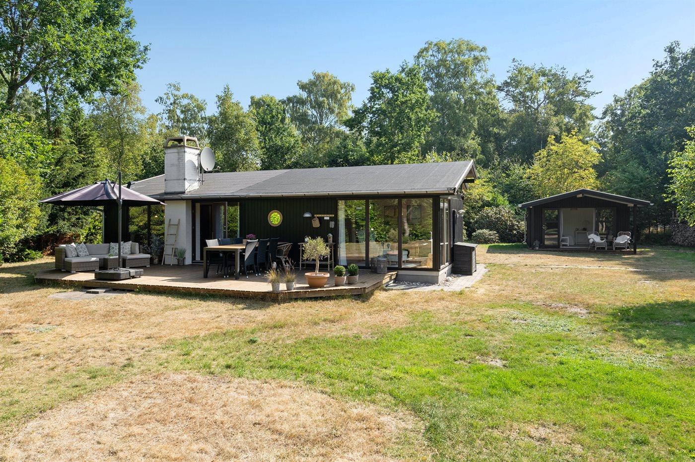 Huset er beliggende på en stor grund med græsplæne. Huset ligger ugenert omkranset af beplantning og i rolige omgivelser. Køkken, spiseplads og stue er i åben forbindelse med hinanden og er dermed samlingsstedet for hygge og samvær. Der er to soveværelser med hver to sovepladser og derudover er der mulighed for at sove på en dobbelt sovesofa i stuen eller i det flotte nybyggede anneks med to sovepladser.