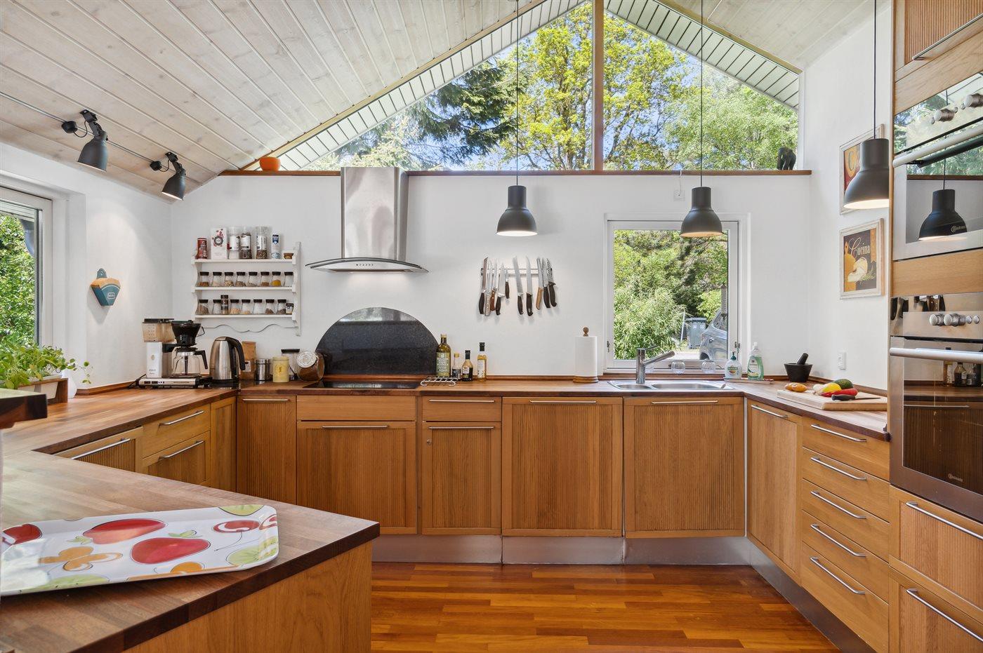 Køkkenet er udstyret med 1 køleskab. Der er 4 keramiske kogeplader, varmluftovn, mikrobølgeovn samt opvaskemaskine.