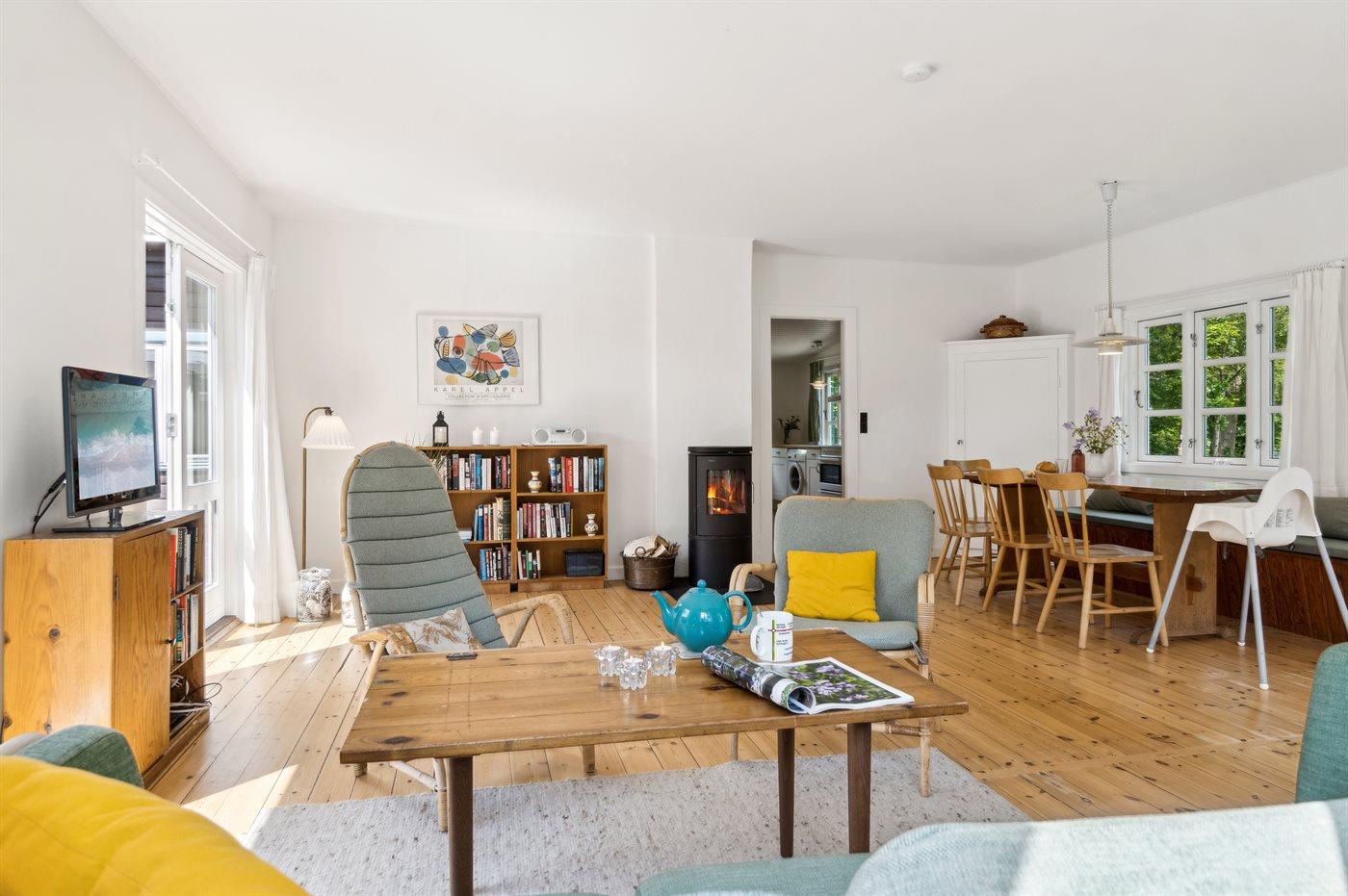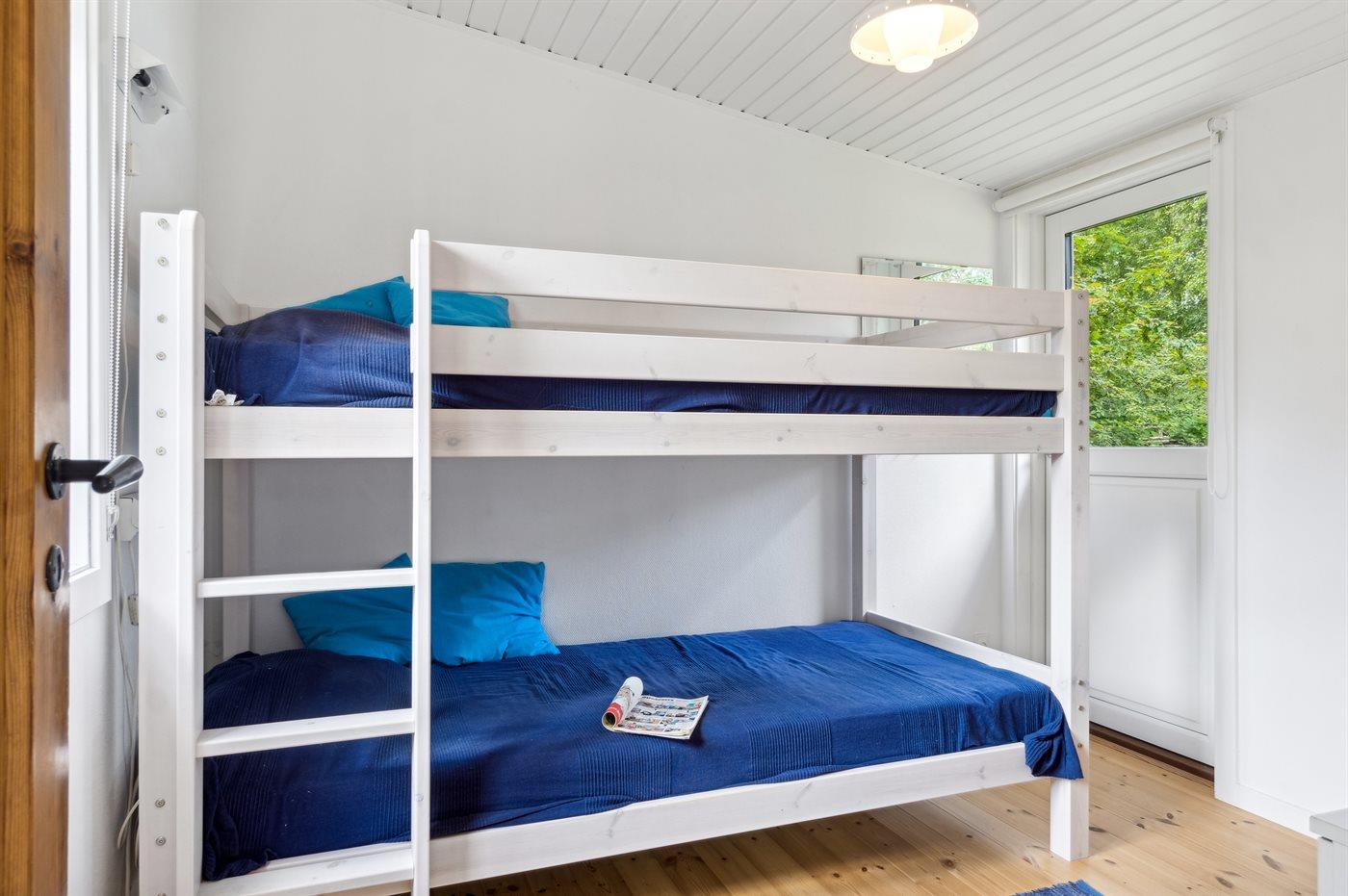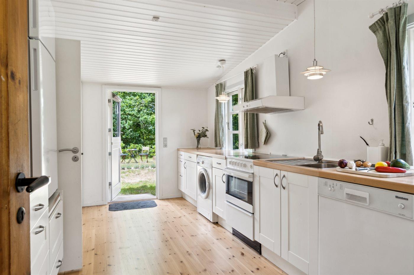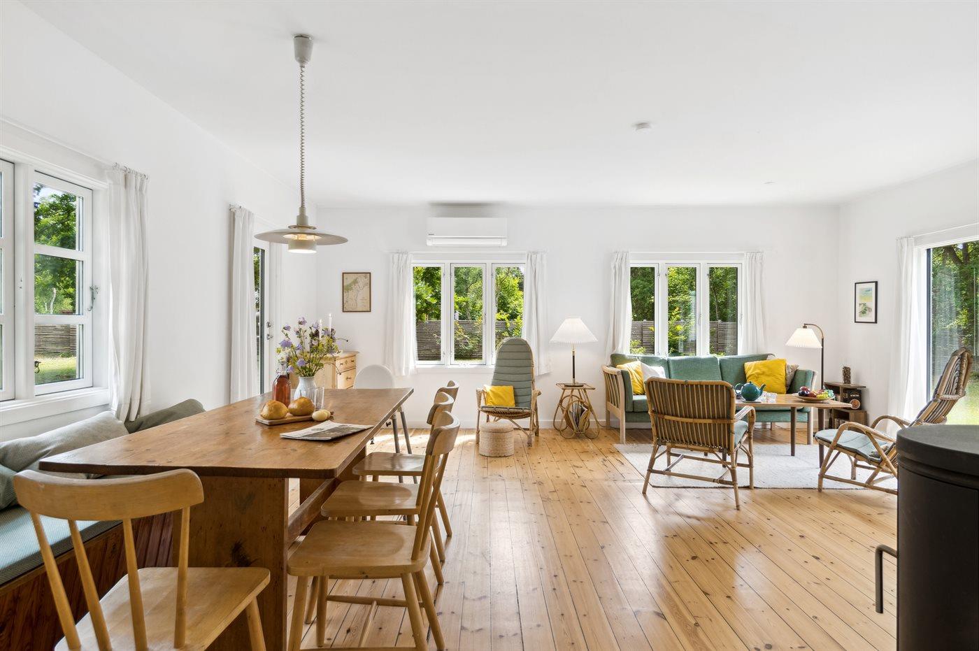 Huset er renoveret i 2022, og kernen i huset er det dejlige lyse opholdsrum med stue og spiseplads, hvorfra der er udgange til terrassen og til den store have, hvor de store træer og den flotte naturgrund bidrager til en næsten sydlandsk stemning. Det rummelige køkken med masser af bordplads grænser op til opholdsrummet. Der er 3 soveværelser. Værelset med dobbeltseng har udgang til terrassen og har gennemgang til det tilstødende værelse, som er med køjeseng. Døren mellem de to værelser kan naturligvis lukkes, og der er mulighed for at benytte havedøren i køjesengsværelse som adgangsvej, så man ikke skal passere igennem værelset med dobbeltseng. Det tredje og sidste soveværelse har 3 sovepladser i køjeseng.
