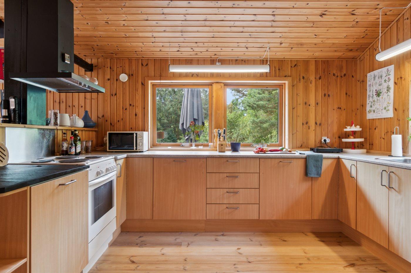 Køkkenet er udstyret med 1 køleskab. Der er 4 elkogeplader, varmluftovn, mikrobølgeovn samt opvaskemaskine.