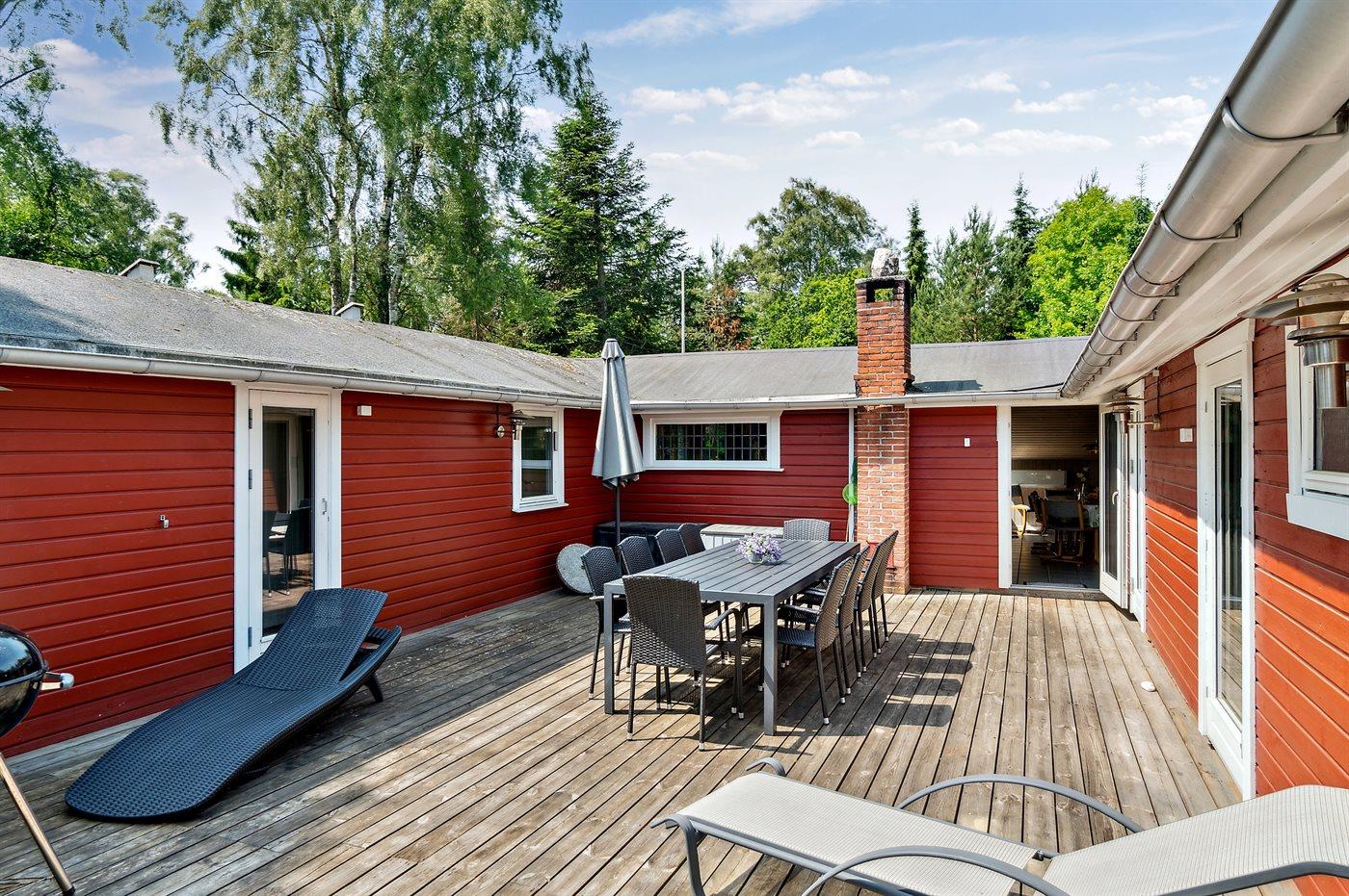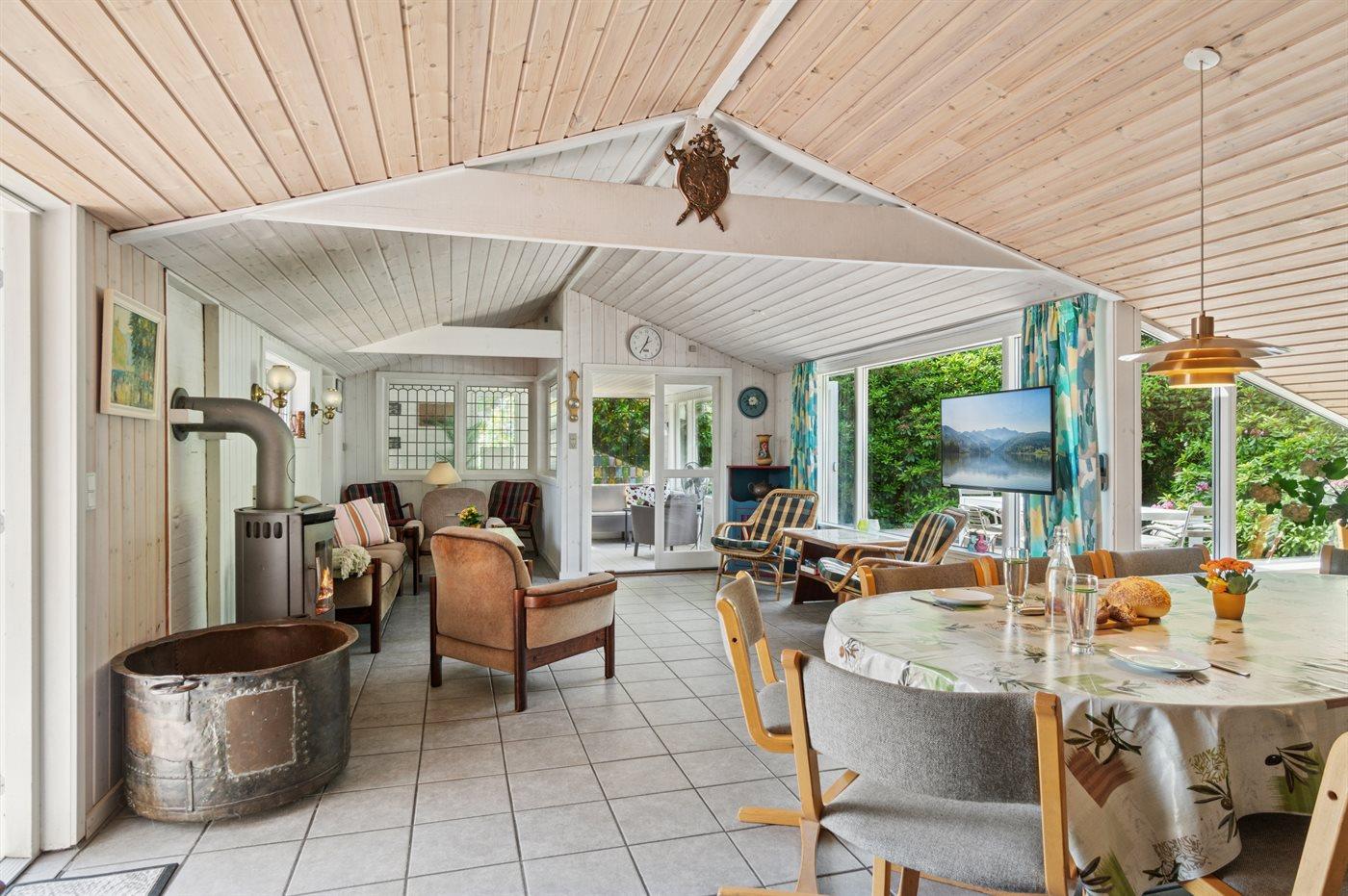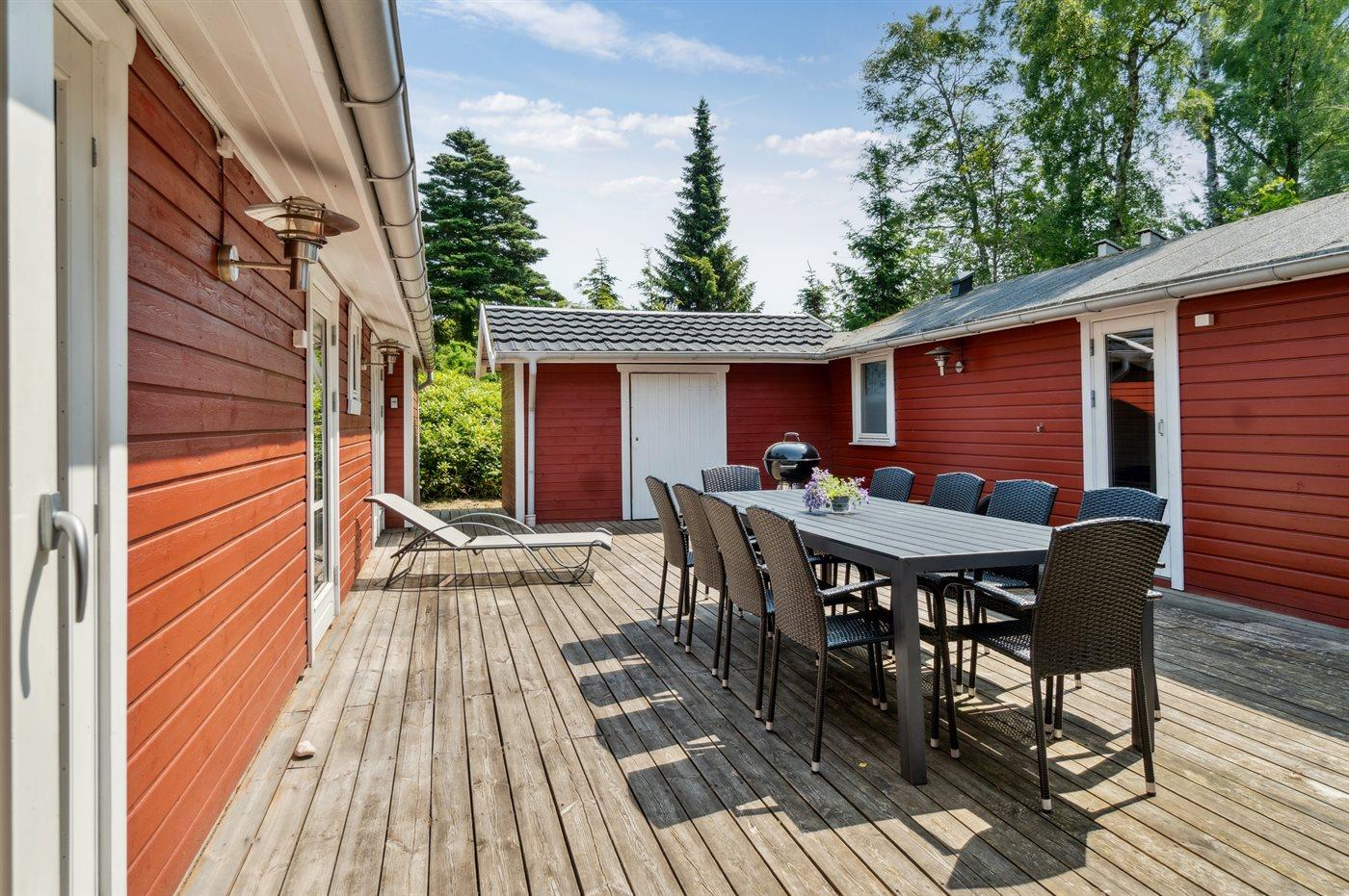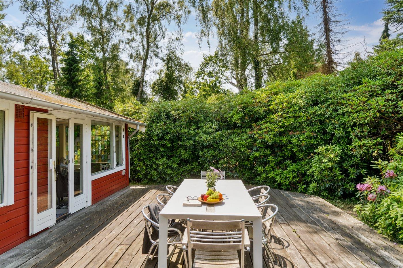 Hjertet i sommerhuset er det store køkken-alrum, som ligger i åben forbindelse med stuen. Der er direkte udgang til terrassen og den lukkede og ugenerte gårdhave.